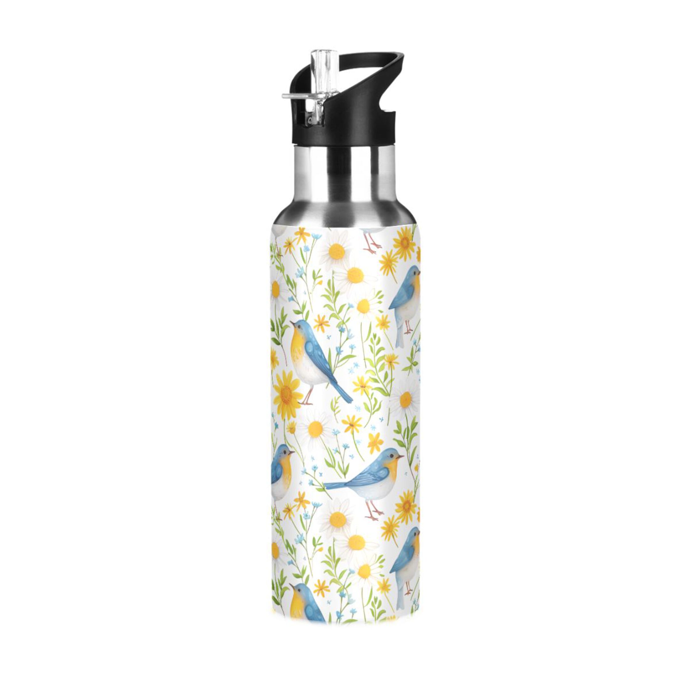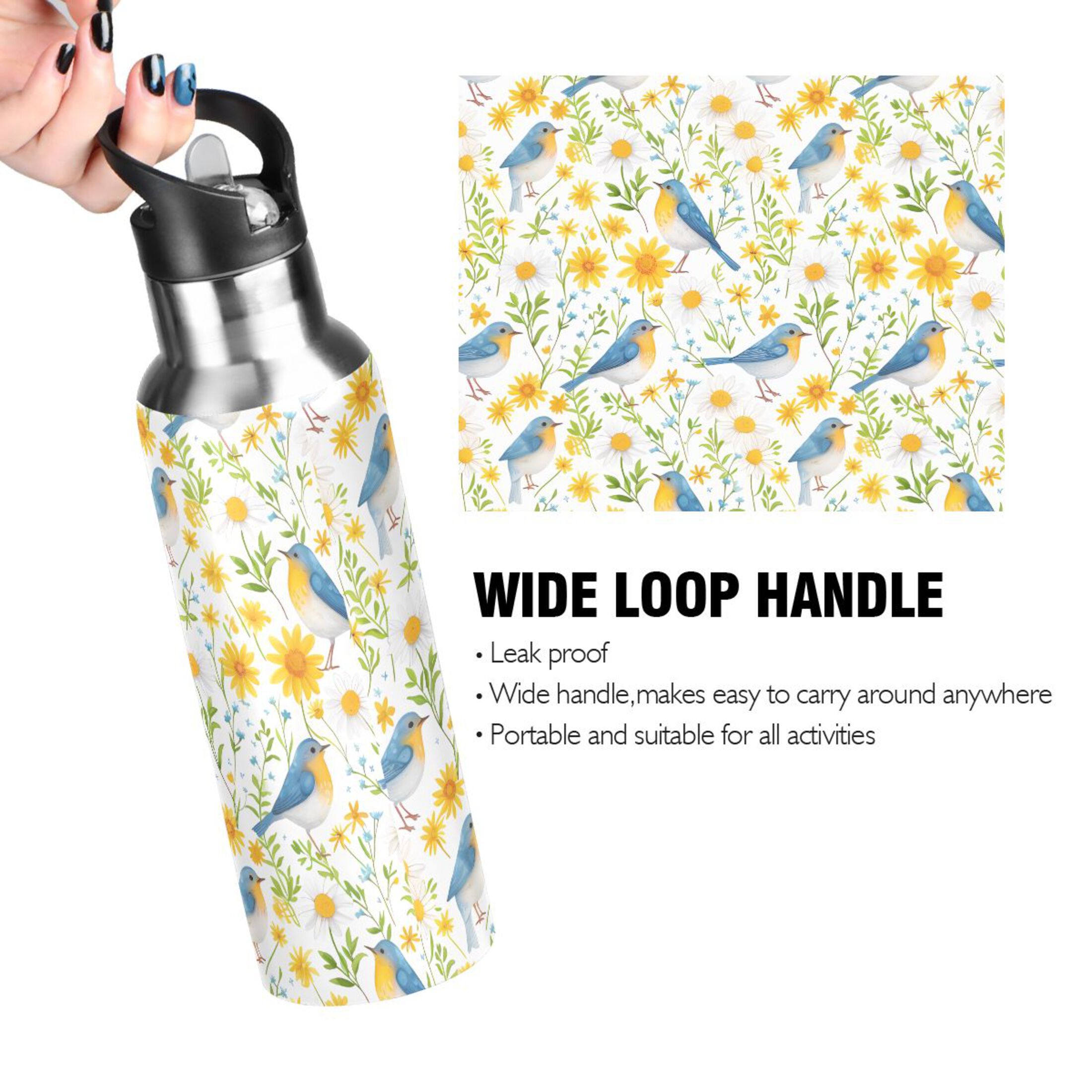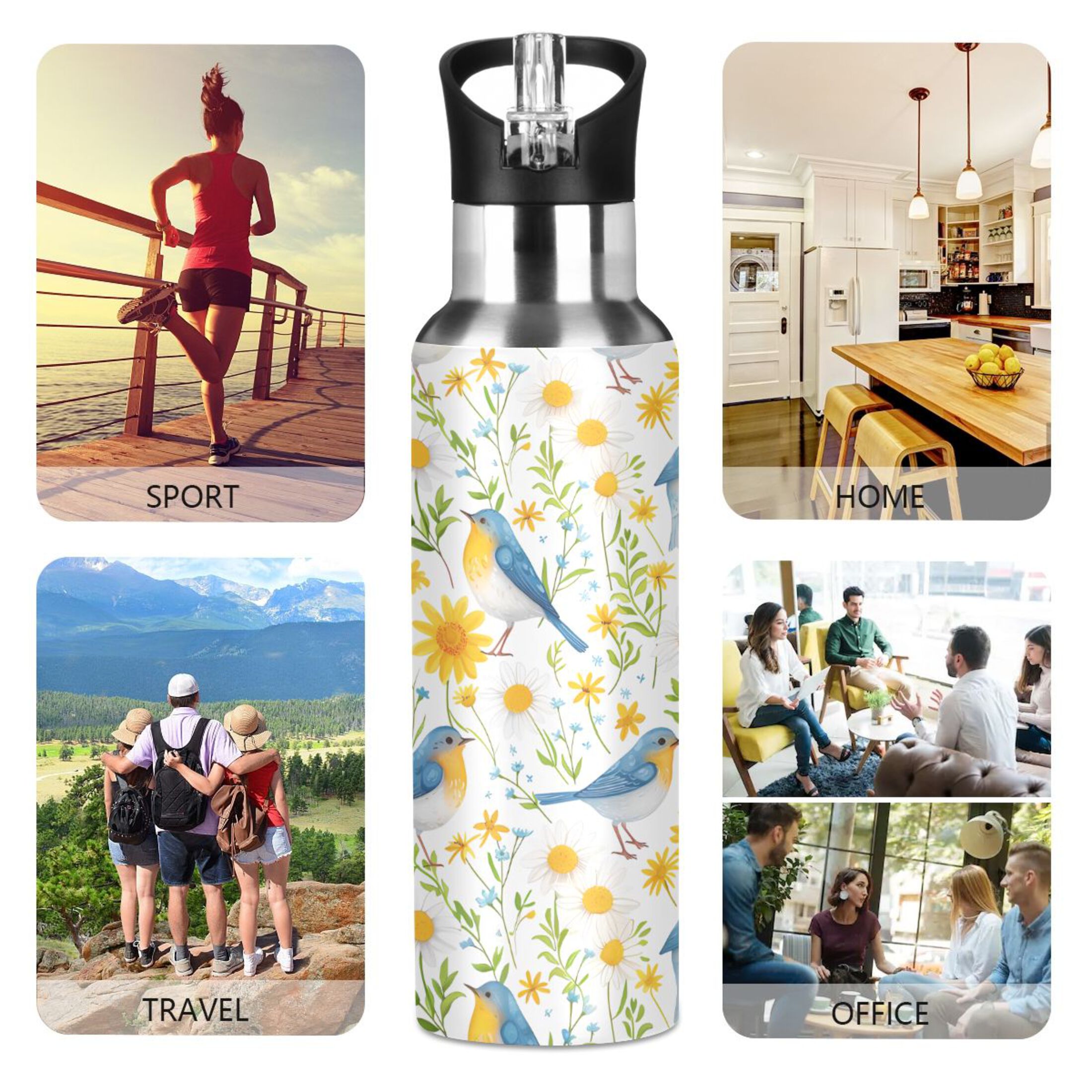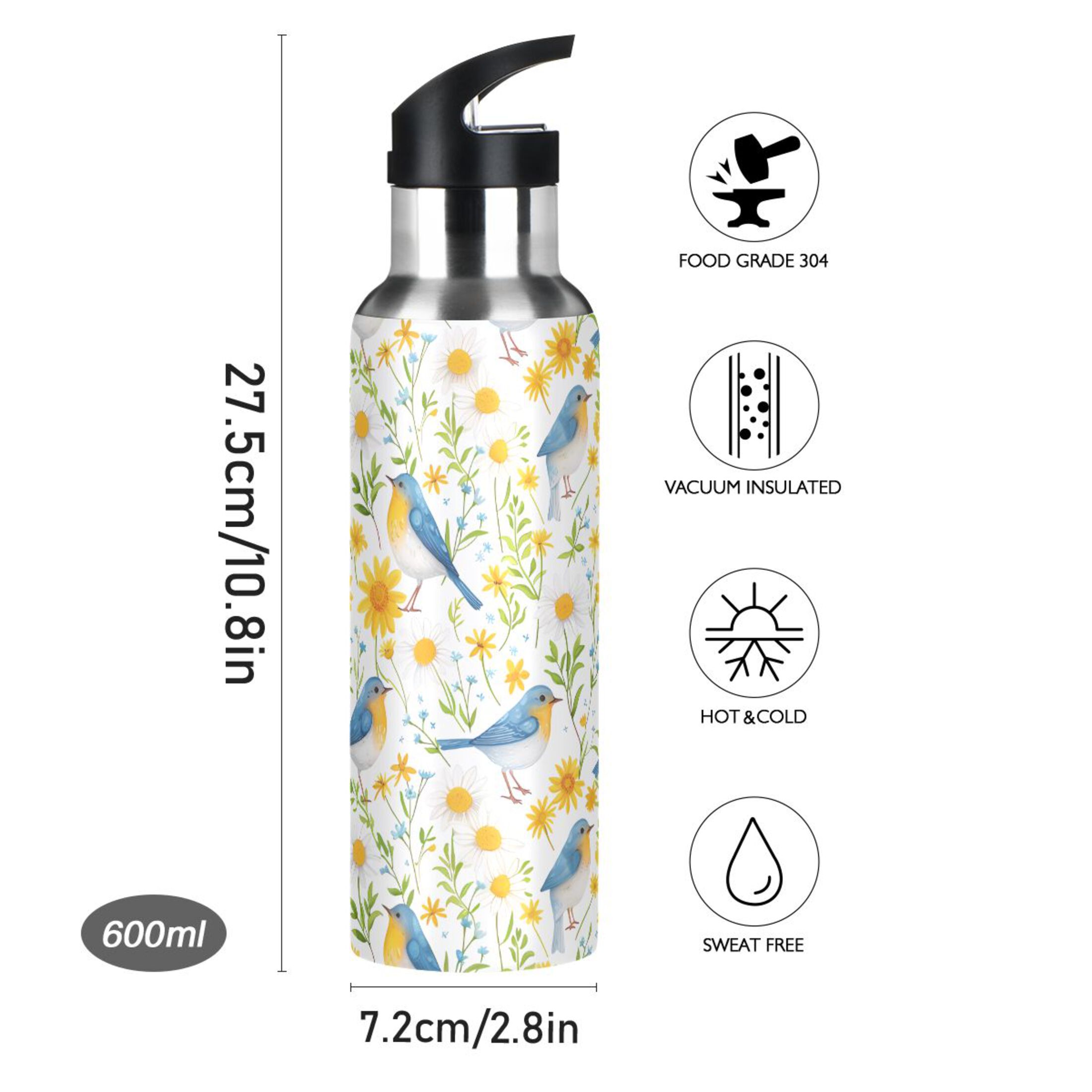 Sunflowers and Birds Water Bottles Insulated Thermos Kids Stainless Steel Bottle with Straw Lid Flask Leakproof for Sports Gym 20 oz