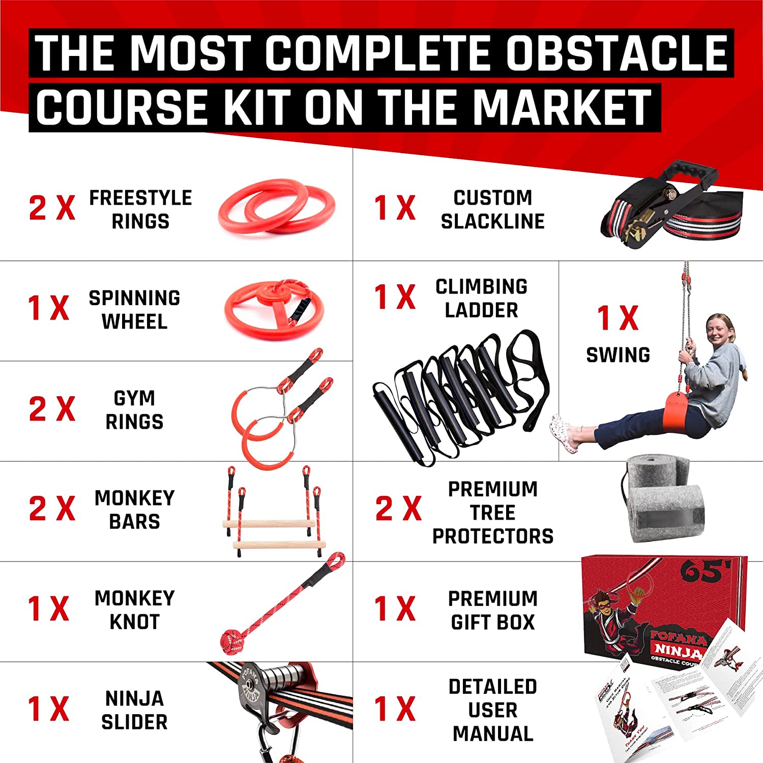 Fofana 65FT Ninja Warrior Obstacle Course for Kids - 45 Pcs Ninja Course for Kids Outside - Ages 8+ - 11 Obstacles - 1 Slack line for Backyard for Kids