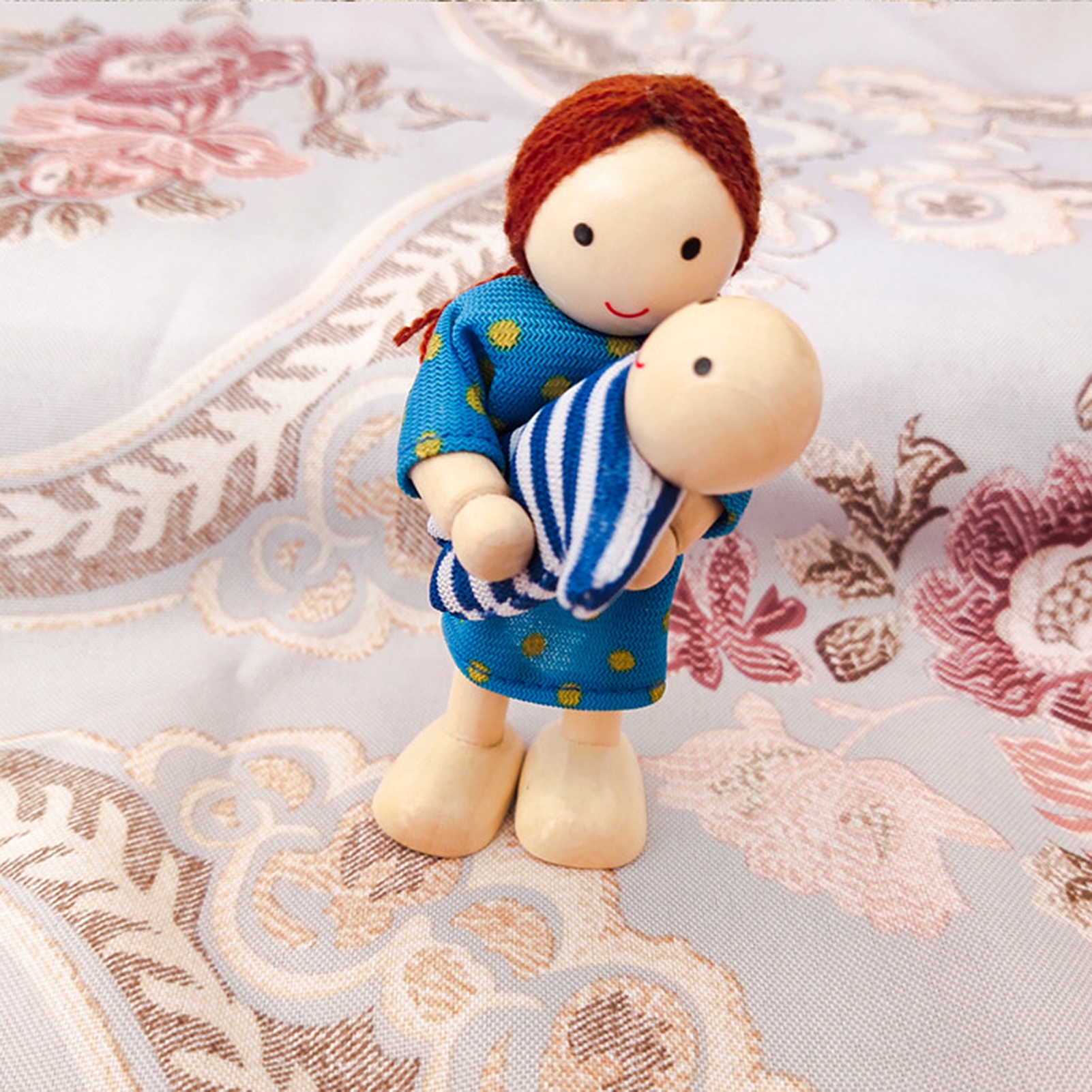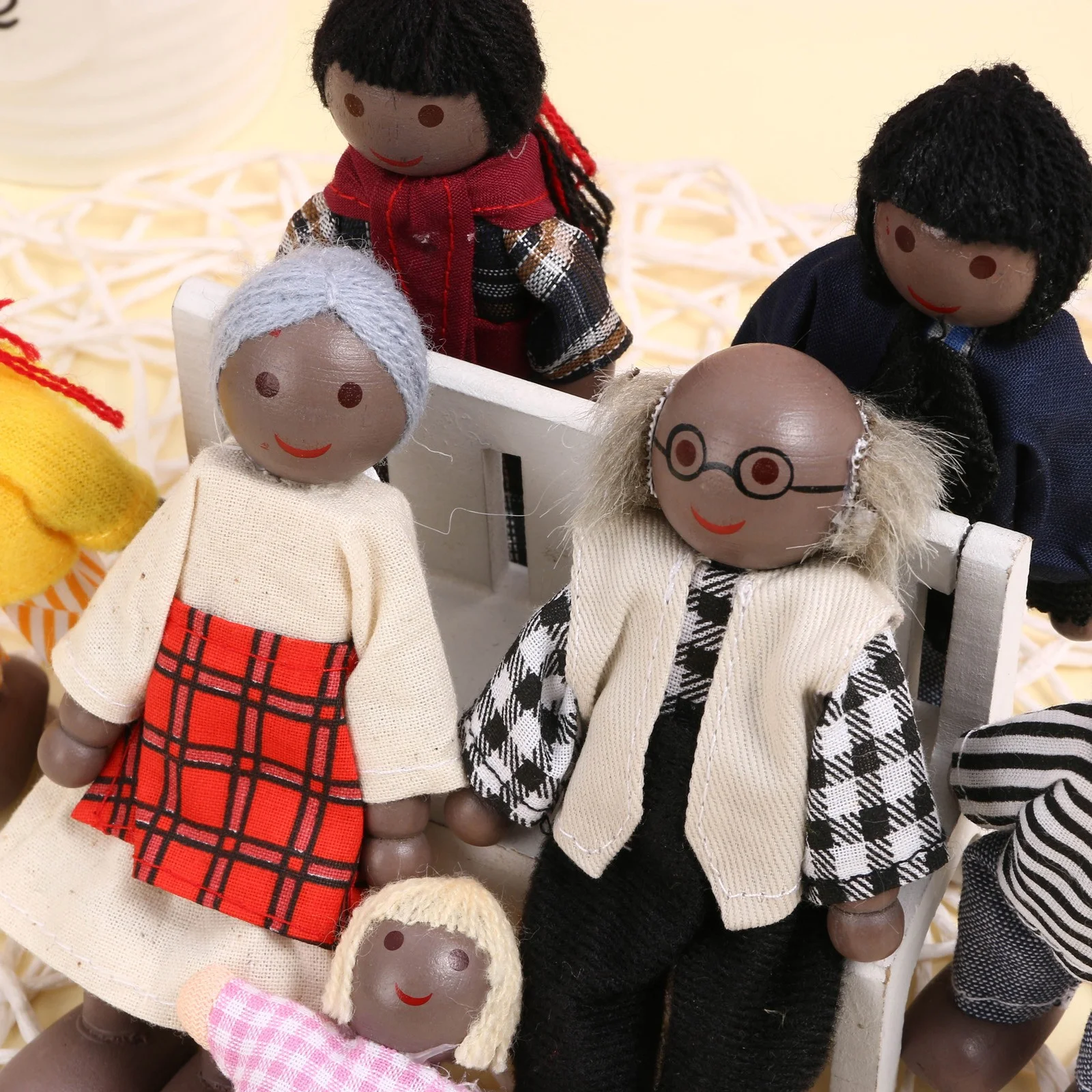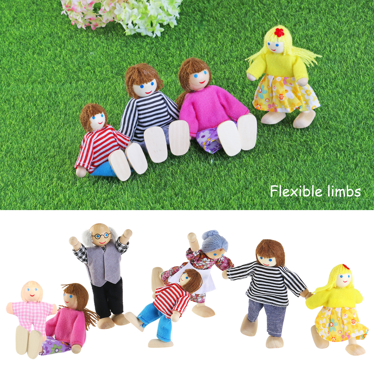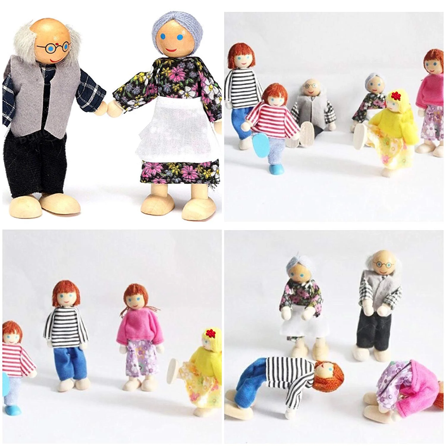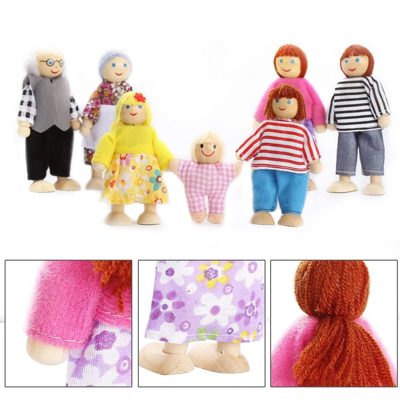 Temacd 7Pcs/Set Mini Family doll for Dollhouse ,Cartoon Family Wooden Movable Jointed Doll Parent-child Toys Kids Gift