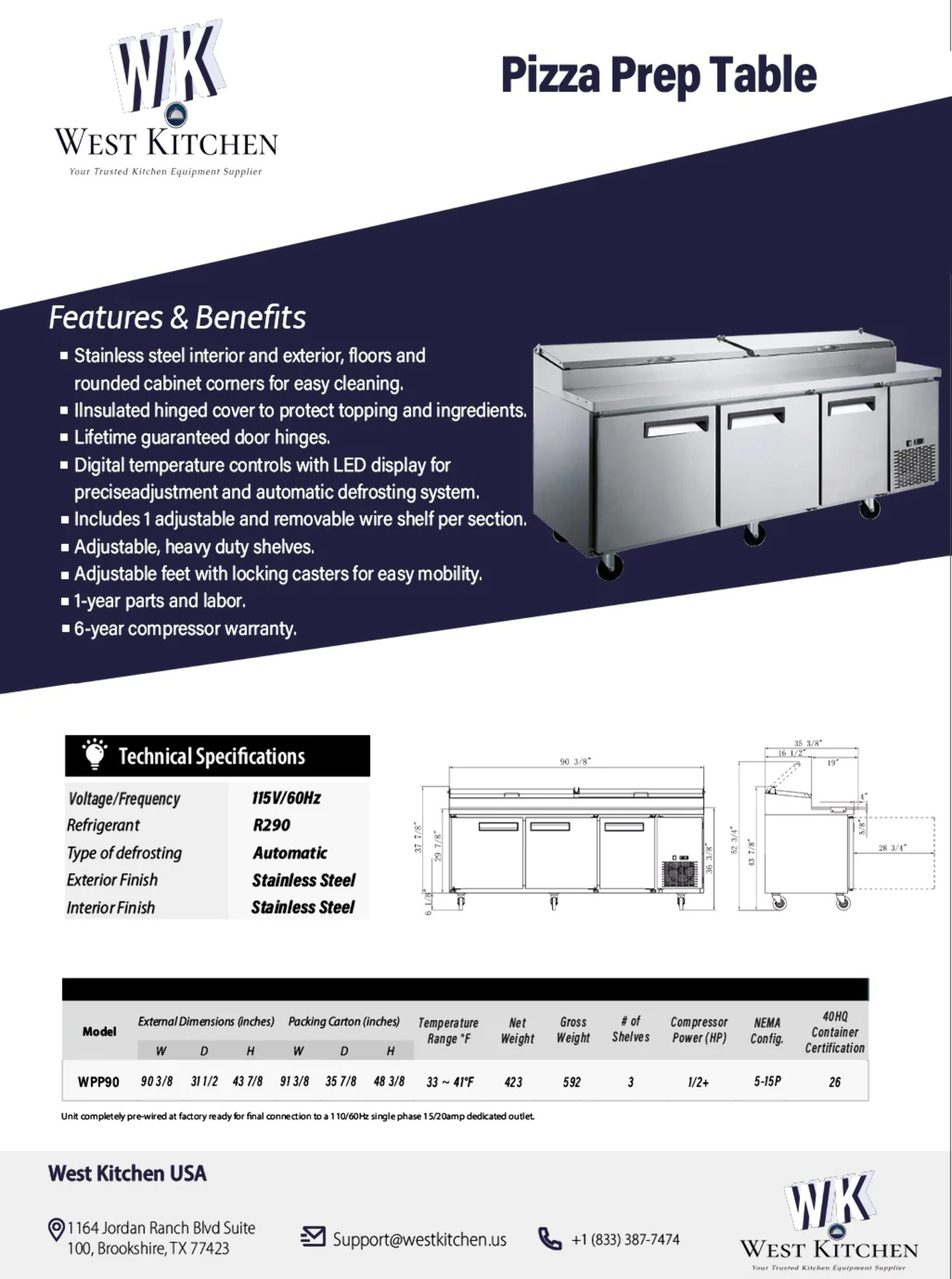West Kitchen WPP90 90 Refrigerated 3 Door Pizza Prep Table 12 1/3 Pan Capacity