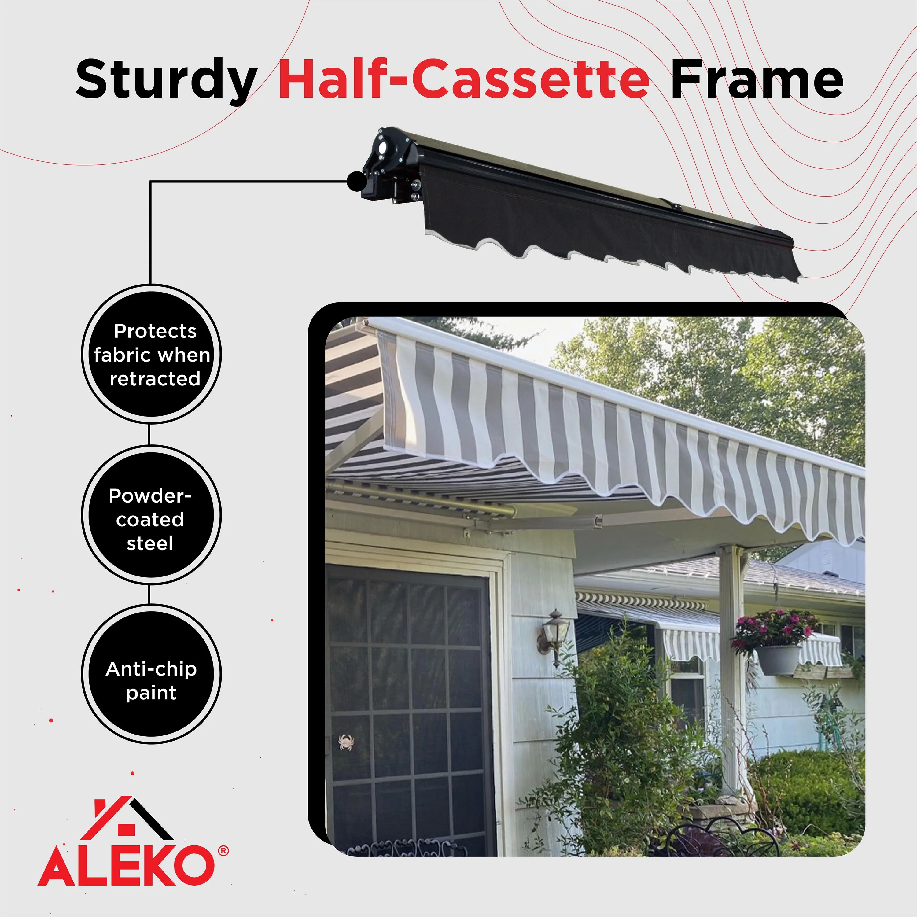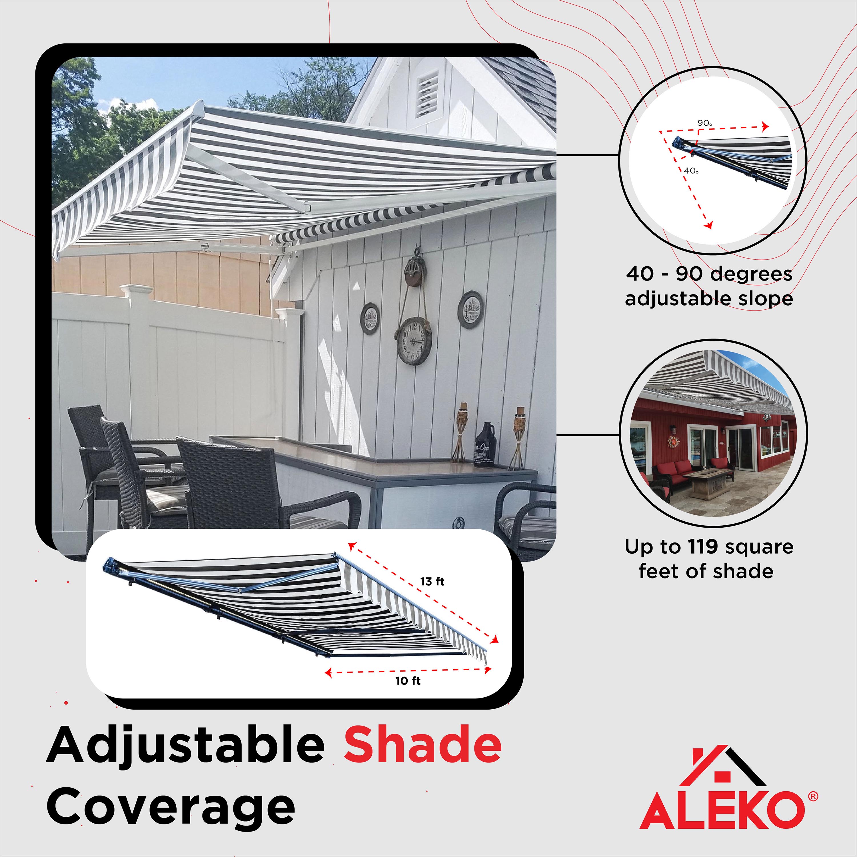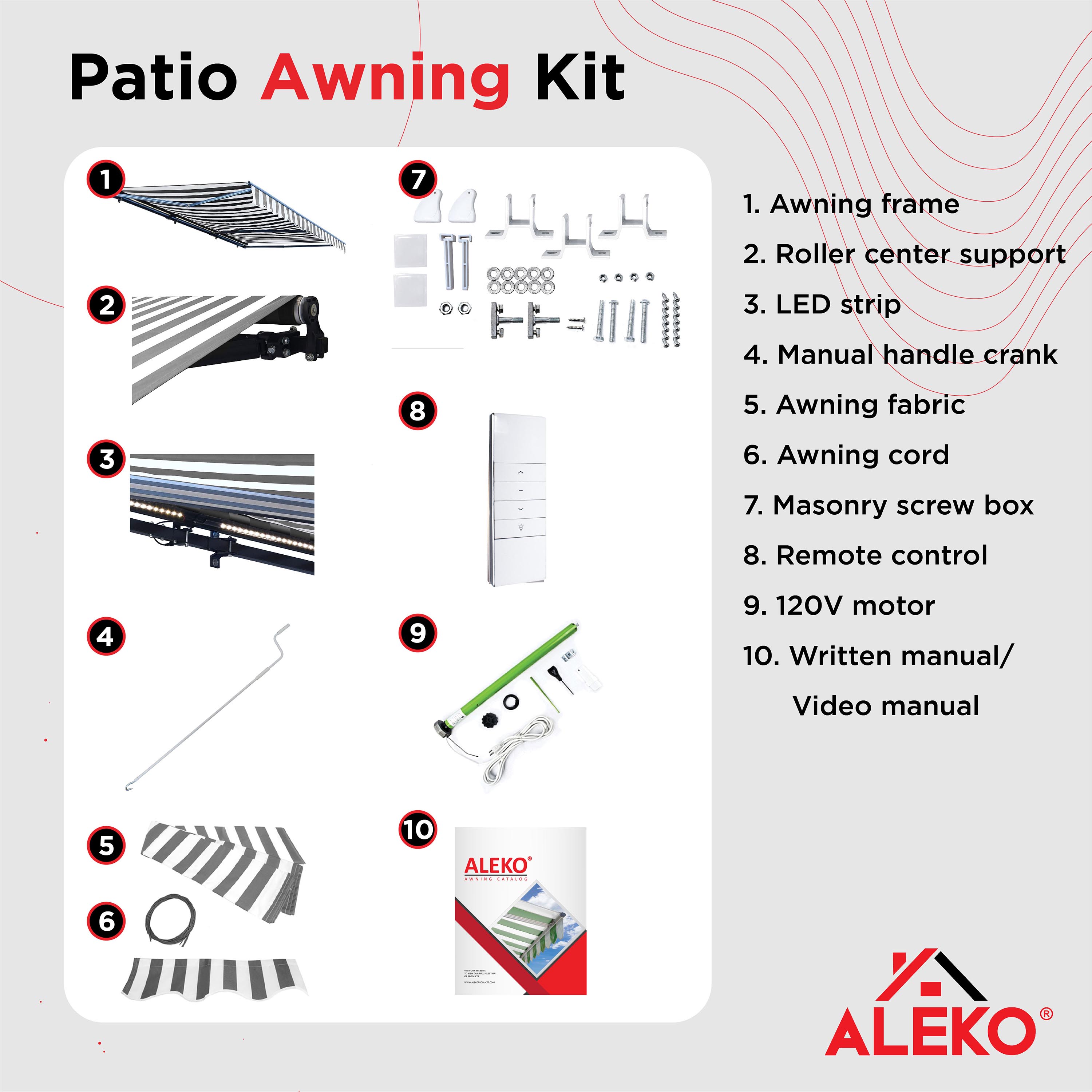 ALEKO LED Half Cassette Motorized 13 x 10 ft Retractable Patio Awning Grey White Striped