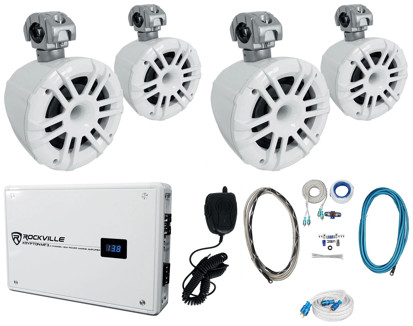 4 Rockville RWB90B 8" Wakeboard Marine Speakers+4 Channel Amplifier+Amp Kit