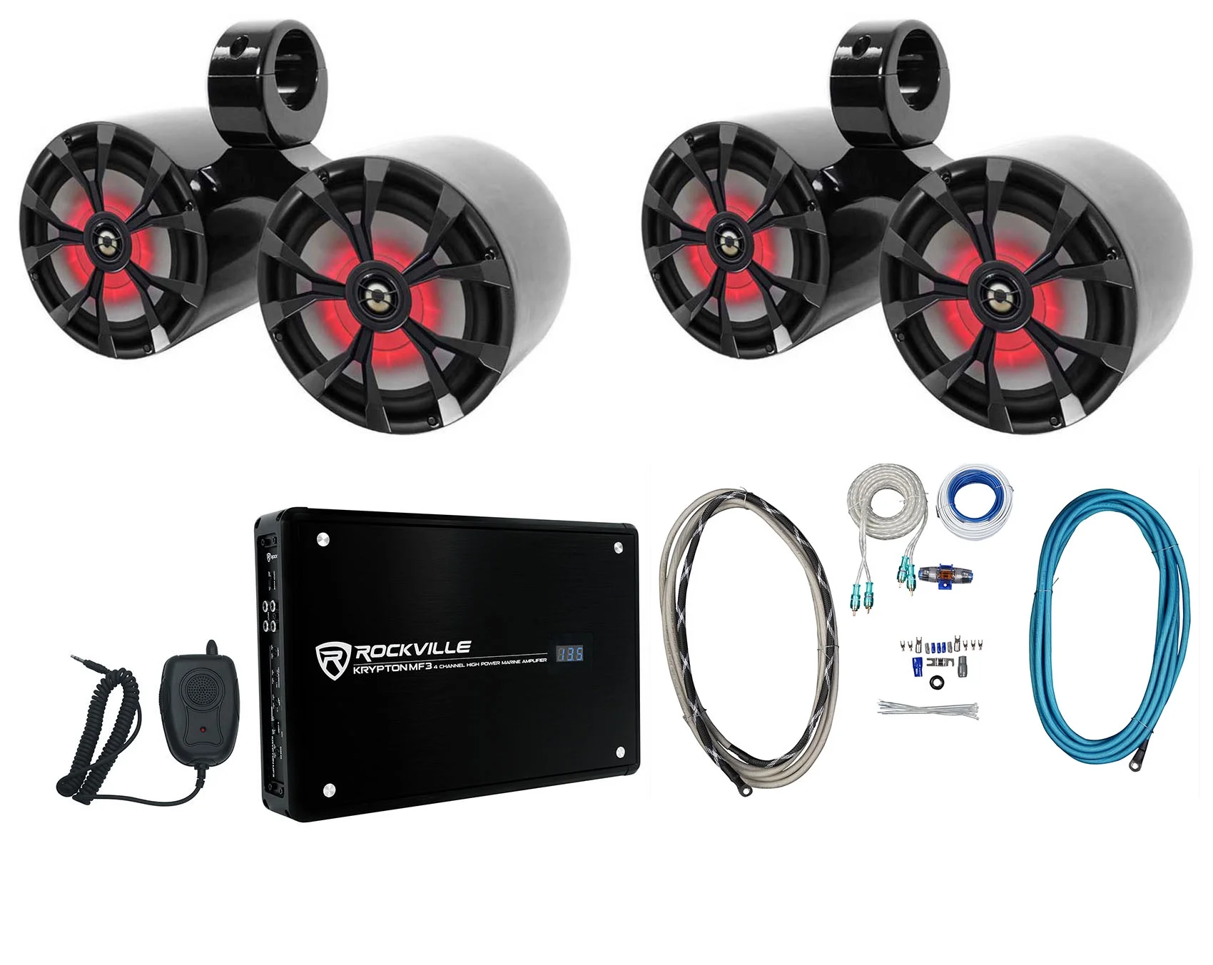 4) Rockville 6.5" LED Swivel Black Marine Wakeboard Speakers+Receiver+Amp+Wires