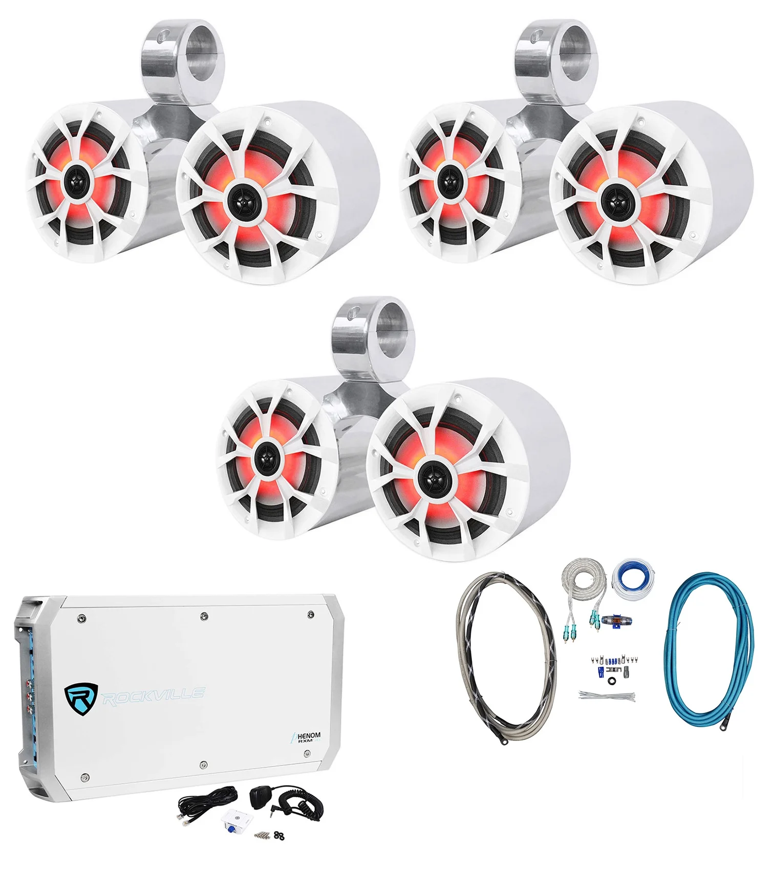 3) Rockville RKL65MBW Dual 6.5" Marine Wakeboard LED Speakers+Amplifier+Amp Kit
