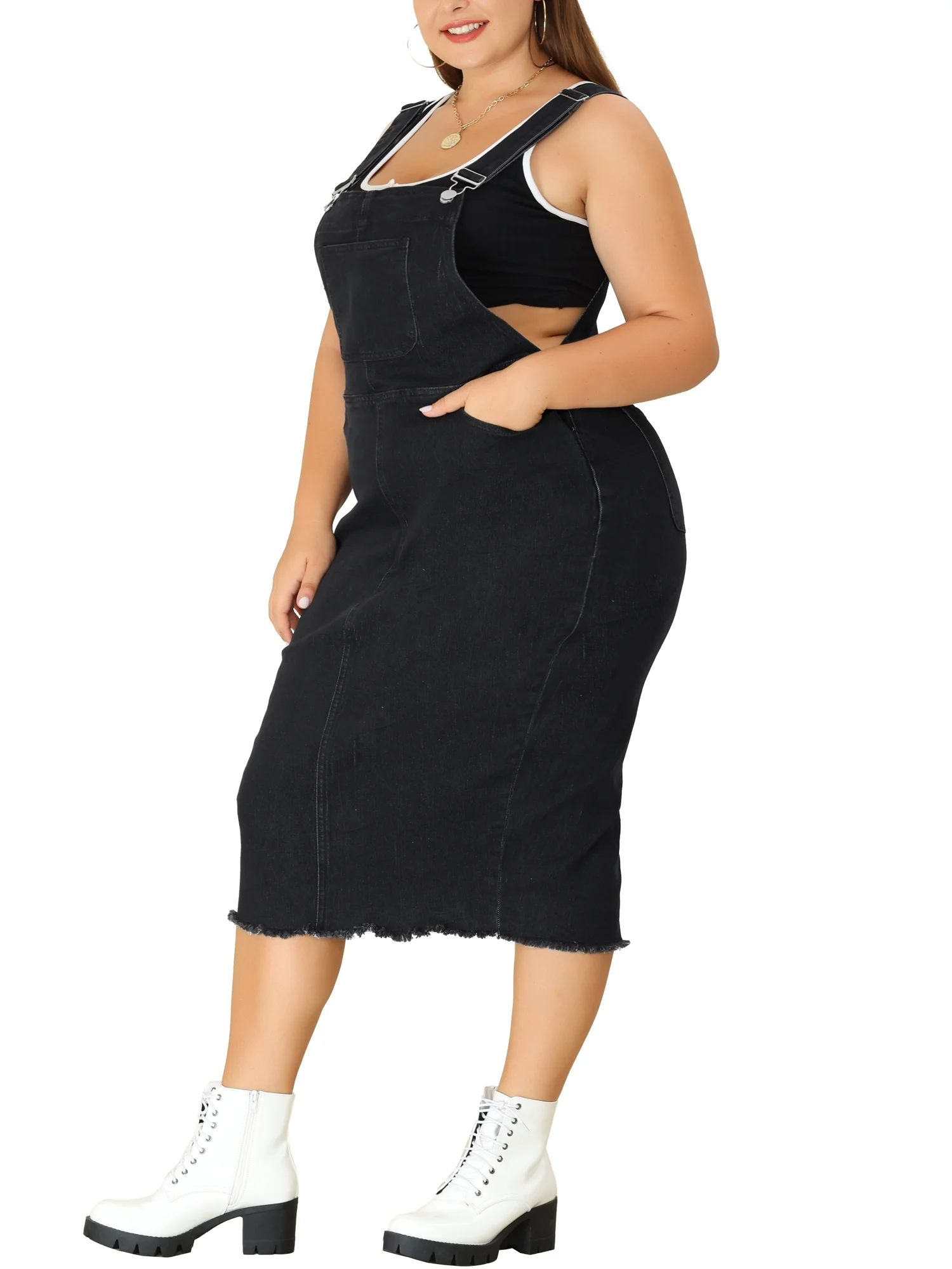 Agnes Orinda Women's Plus Size Bodycon Back Vent Raw Hem Denim Midi Overall Dresses