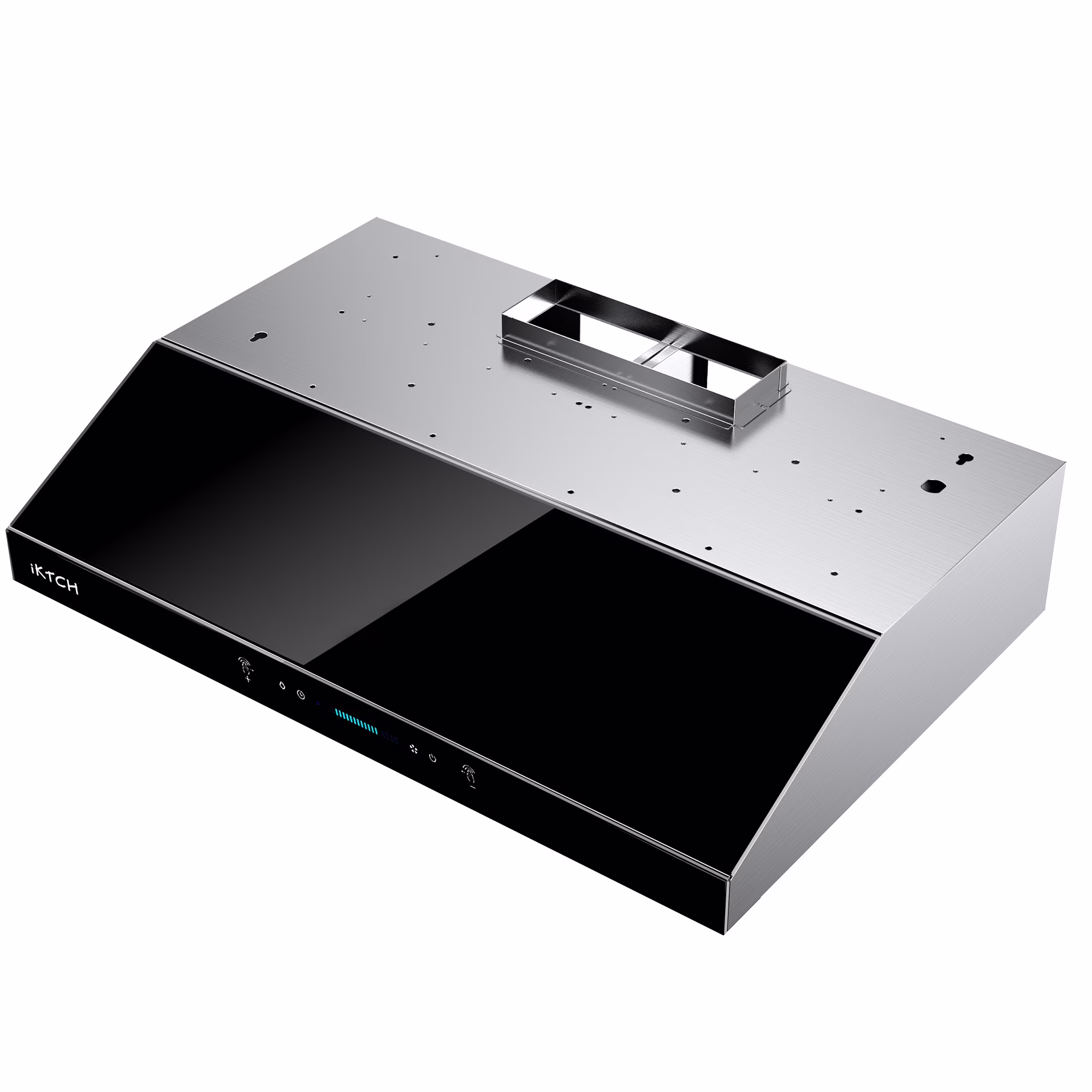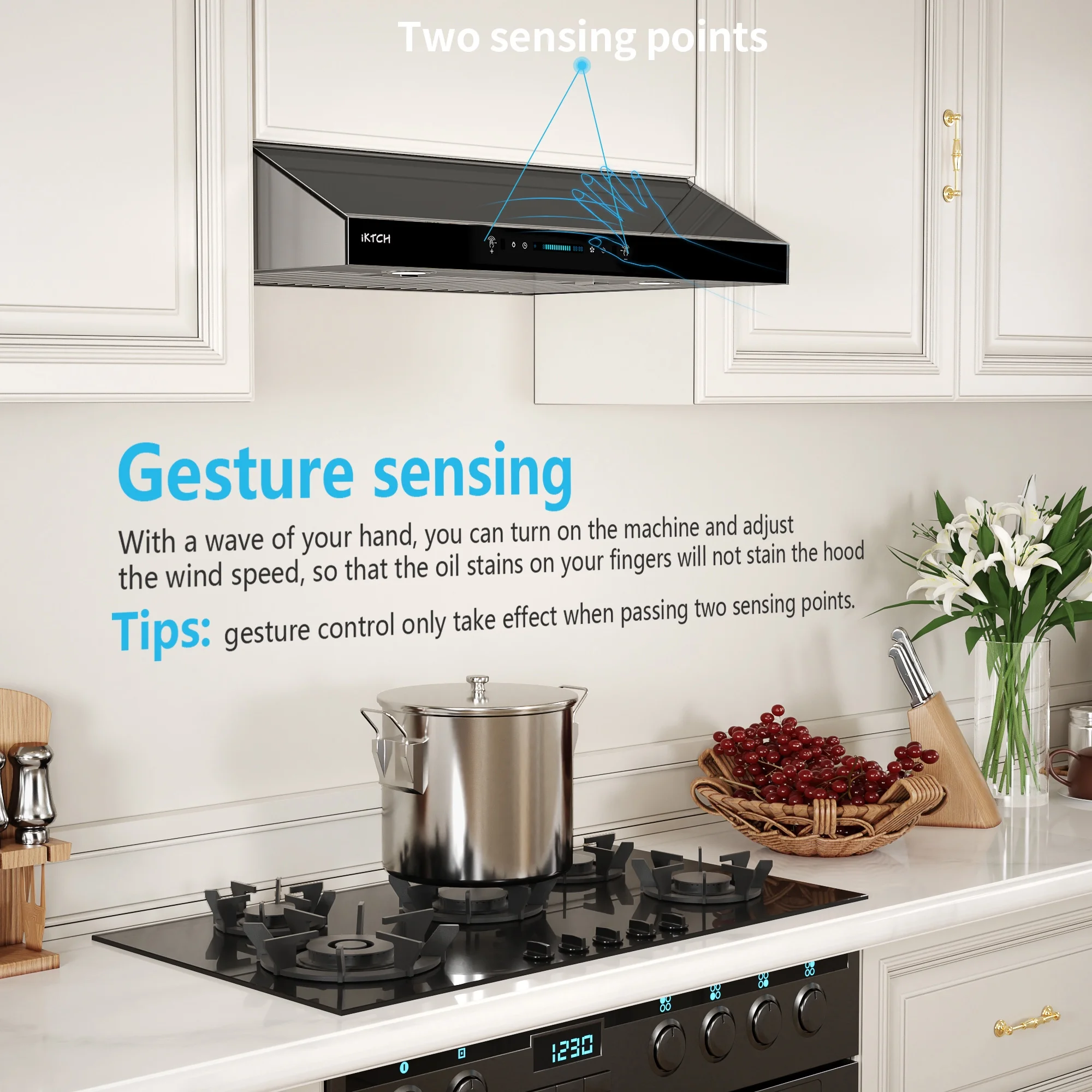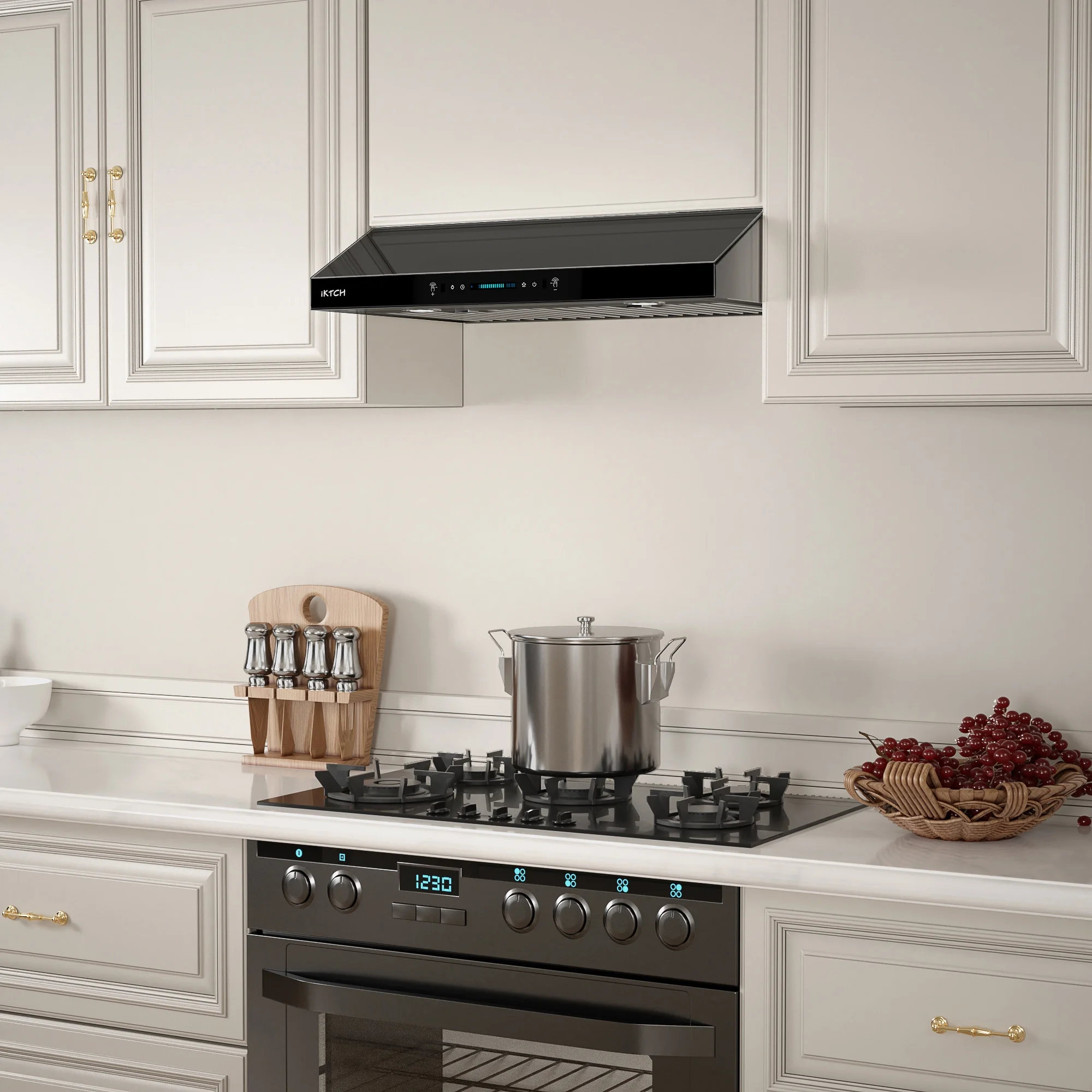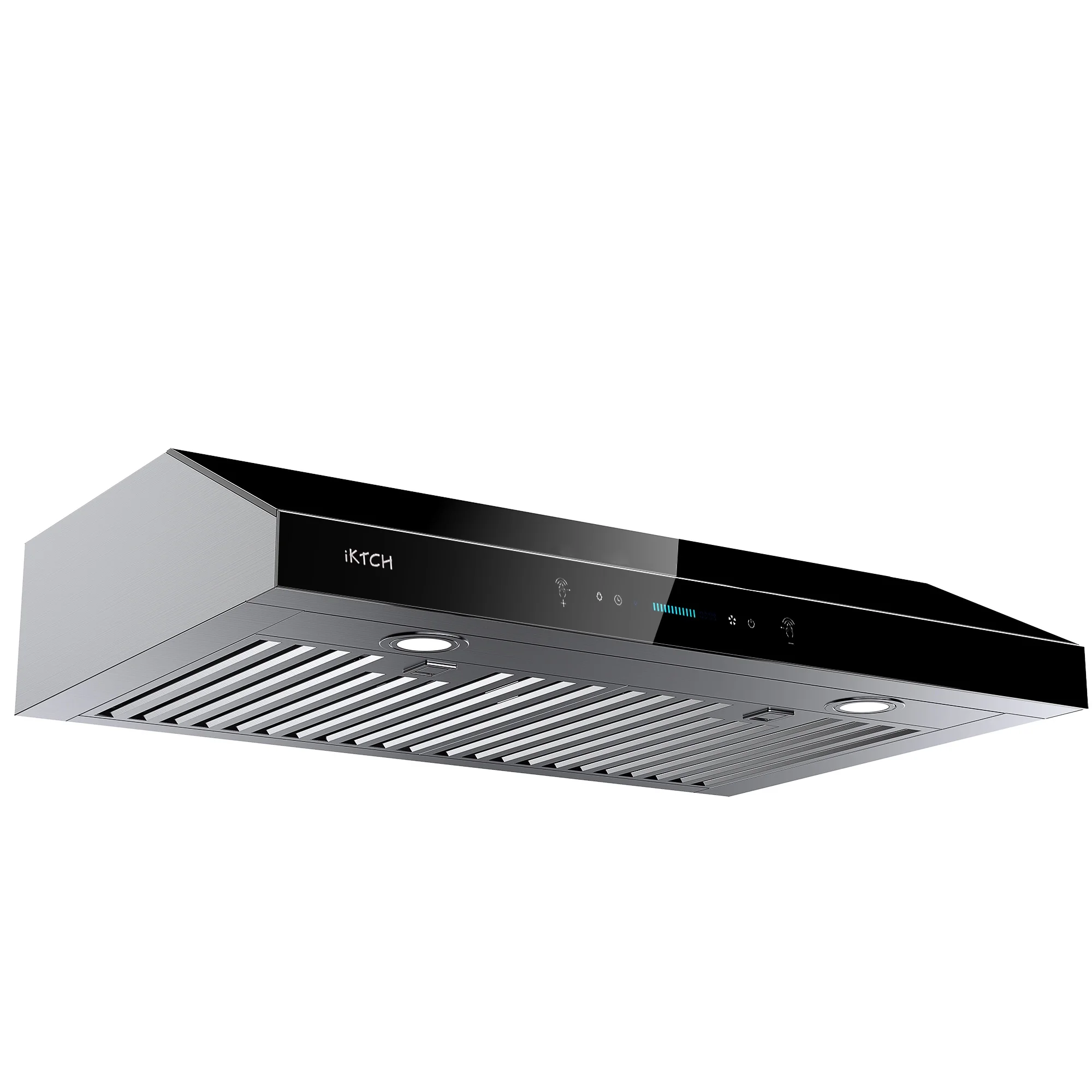 30 Inch Range Hood. 900 CFM Ducted Under Cabinet Range Hood in Stainless Steel and Black Glass with LED Lights