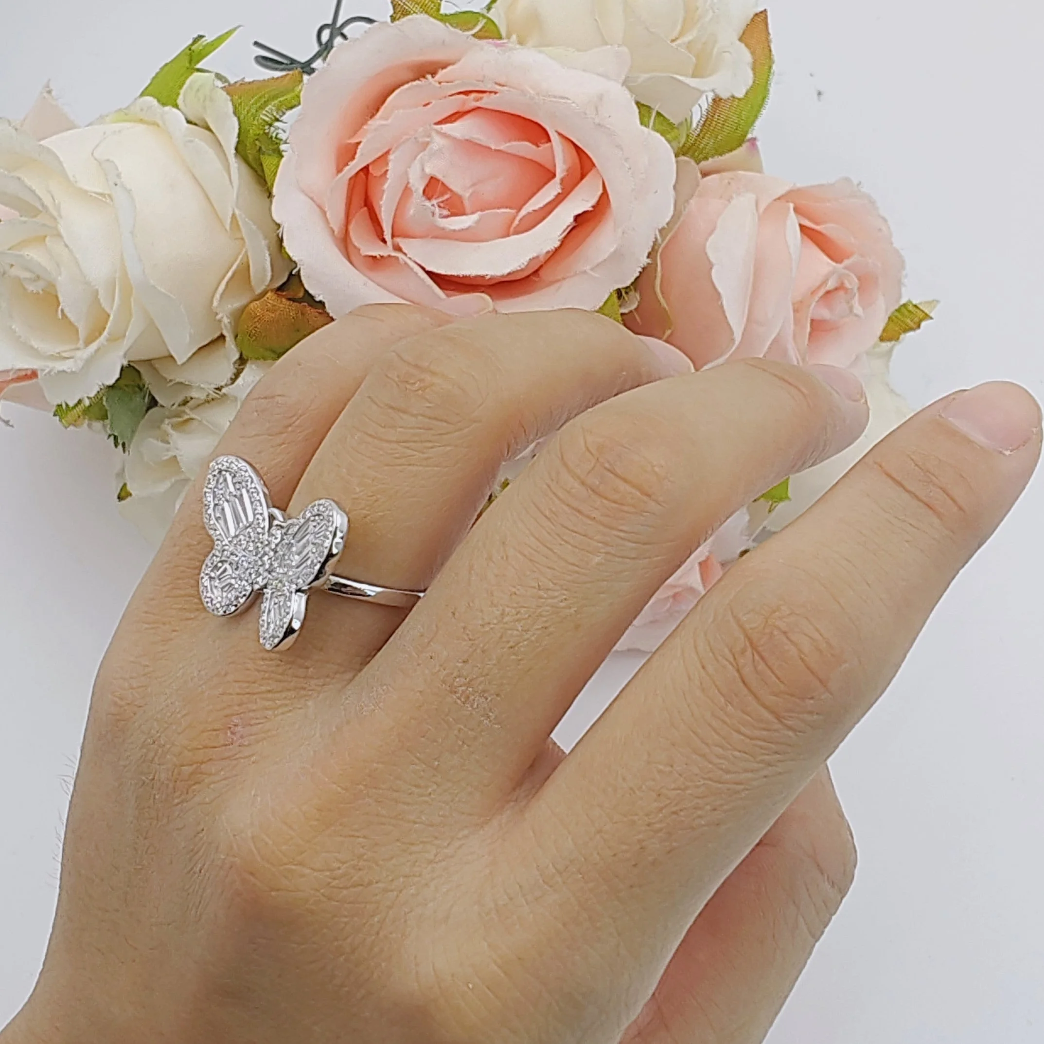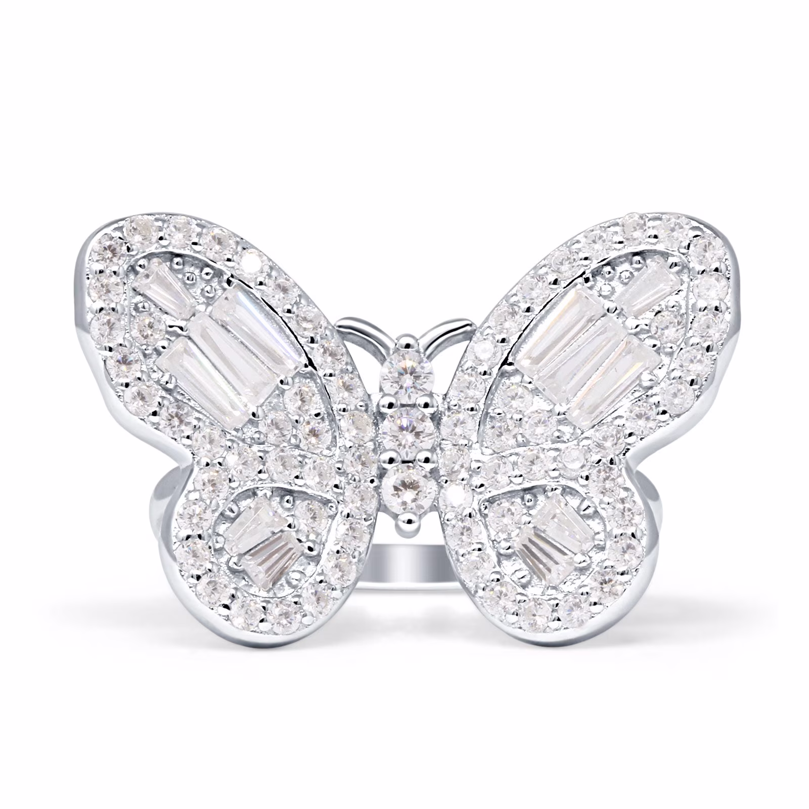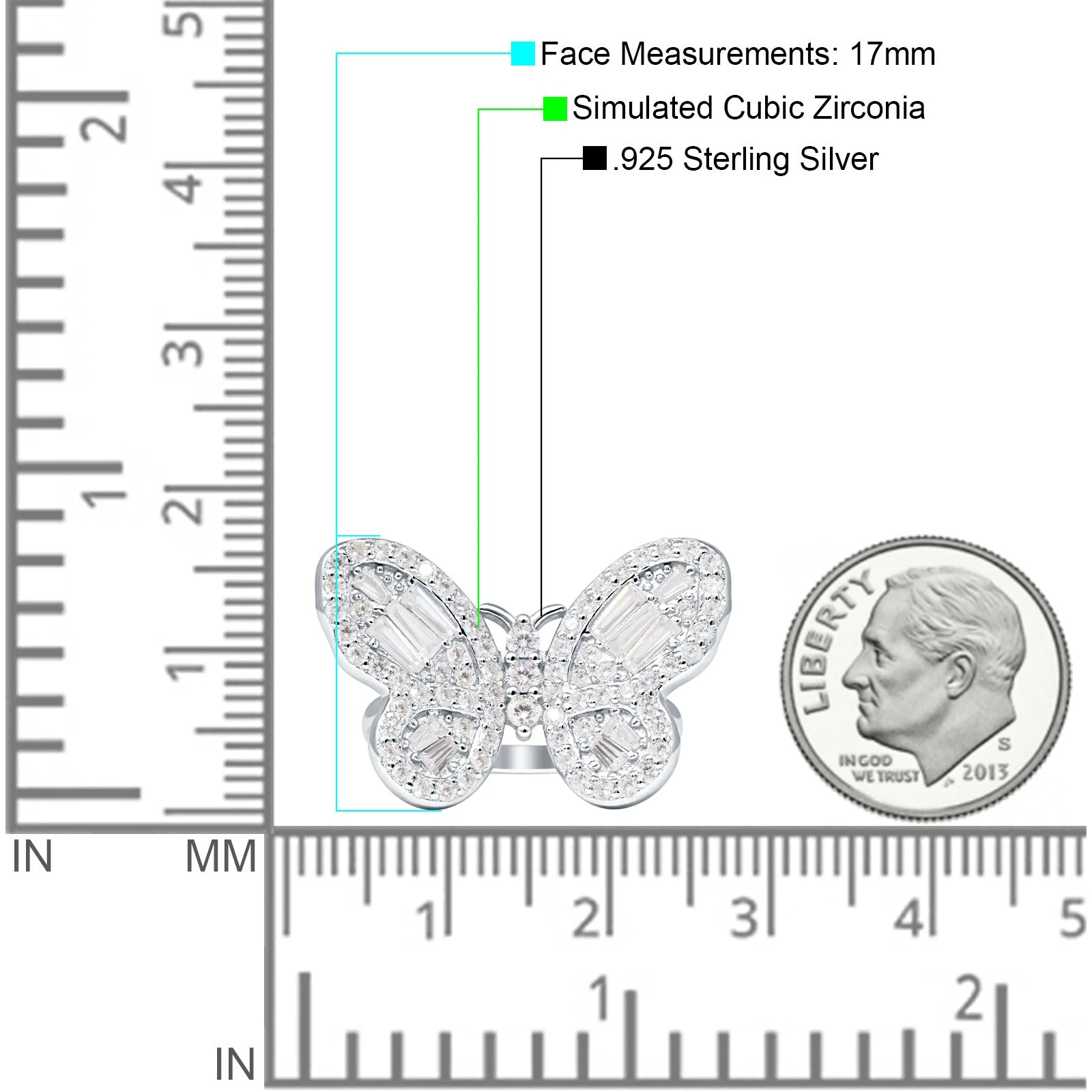 Cluster Butterfly Ring Baguette Cubic Zirconia White Tone 925 Sterling Silver, Size 5