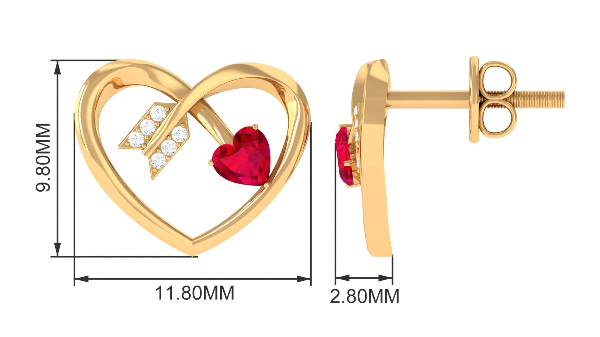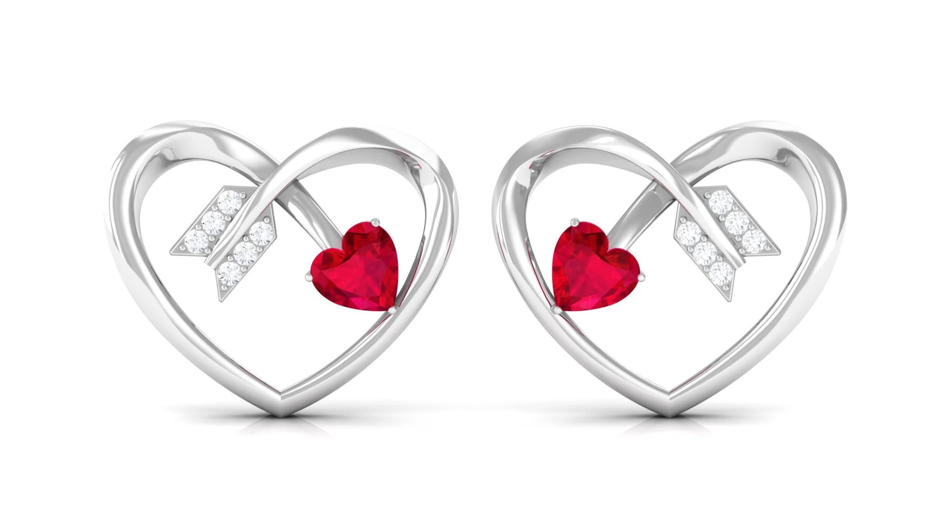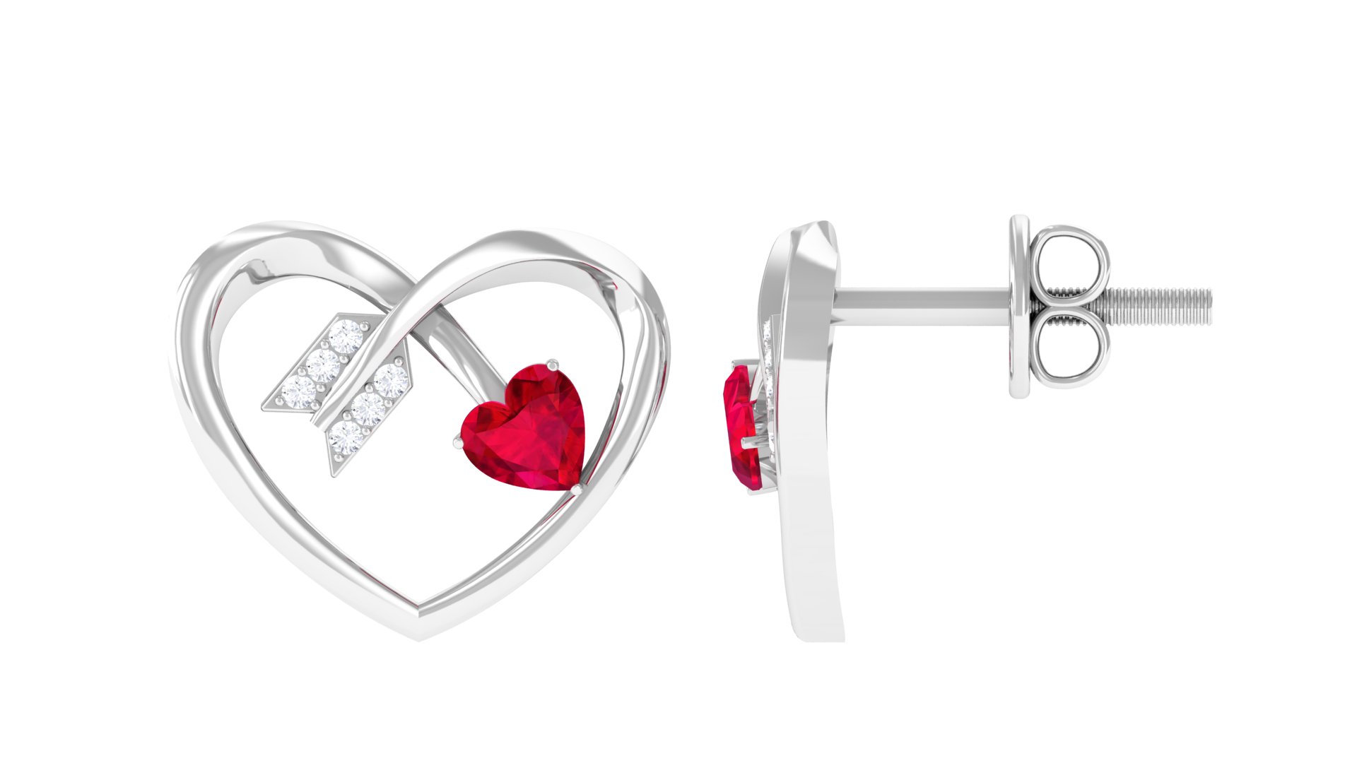 Heart Arrow Stud Earrings with 3/4 CT Created Ruby and Diamonds, 925 Sterling Silver