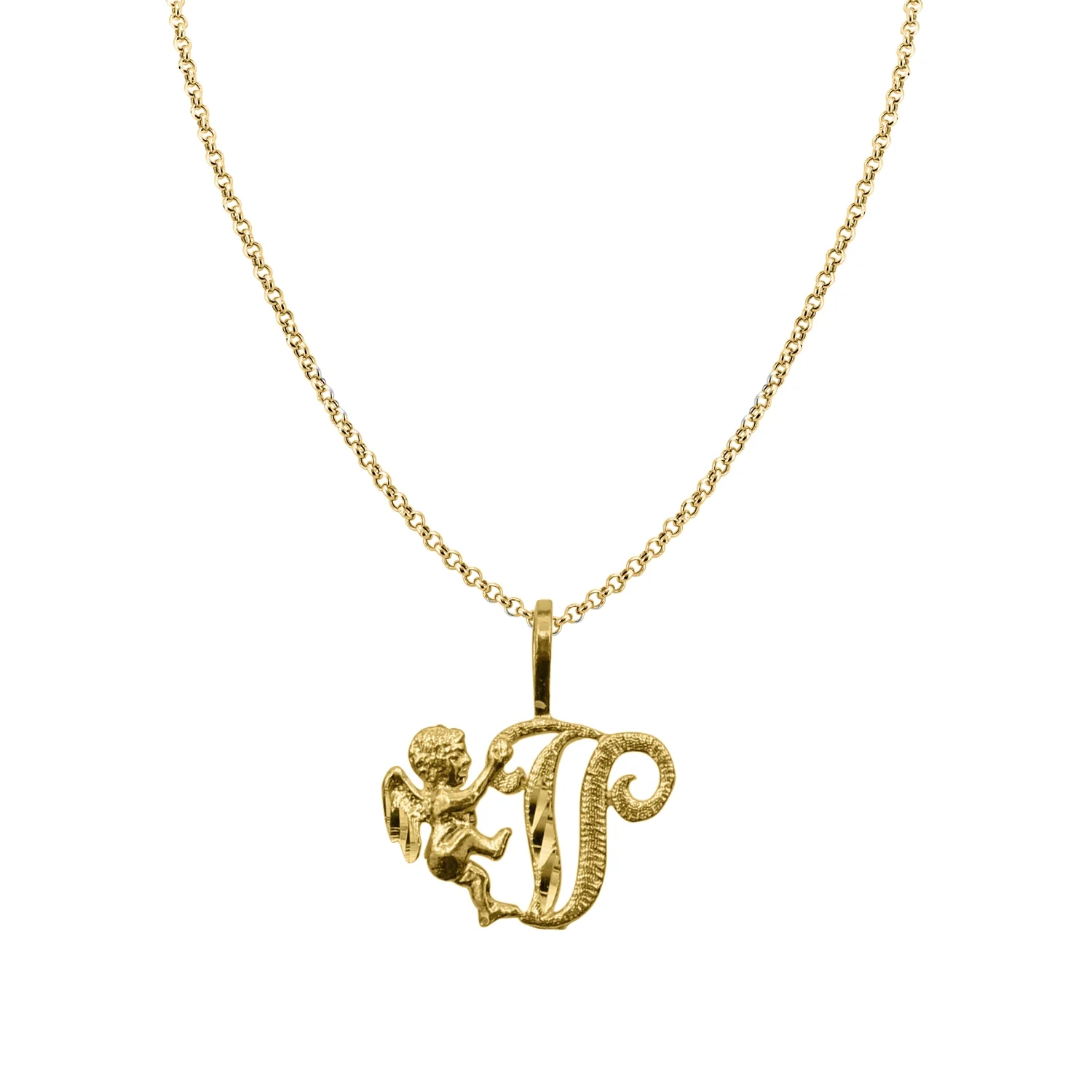Precious Stars 14K Yellow Gold Cherub and Cursive Initial Letter 'V' Pendant with 16" Chain Necklace