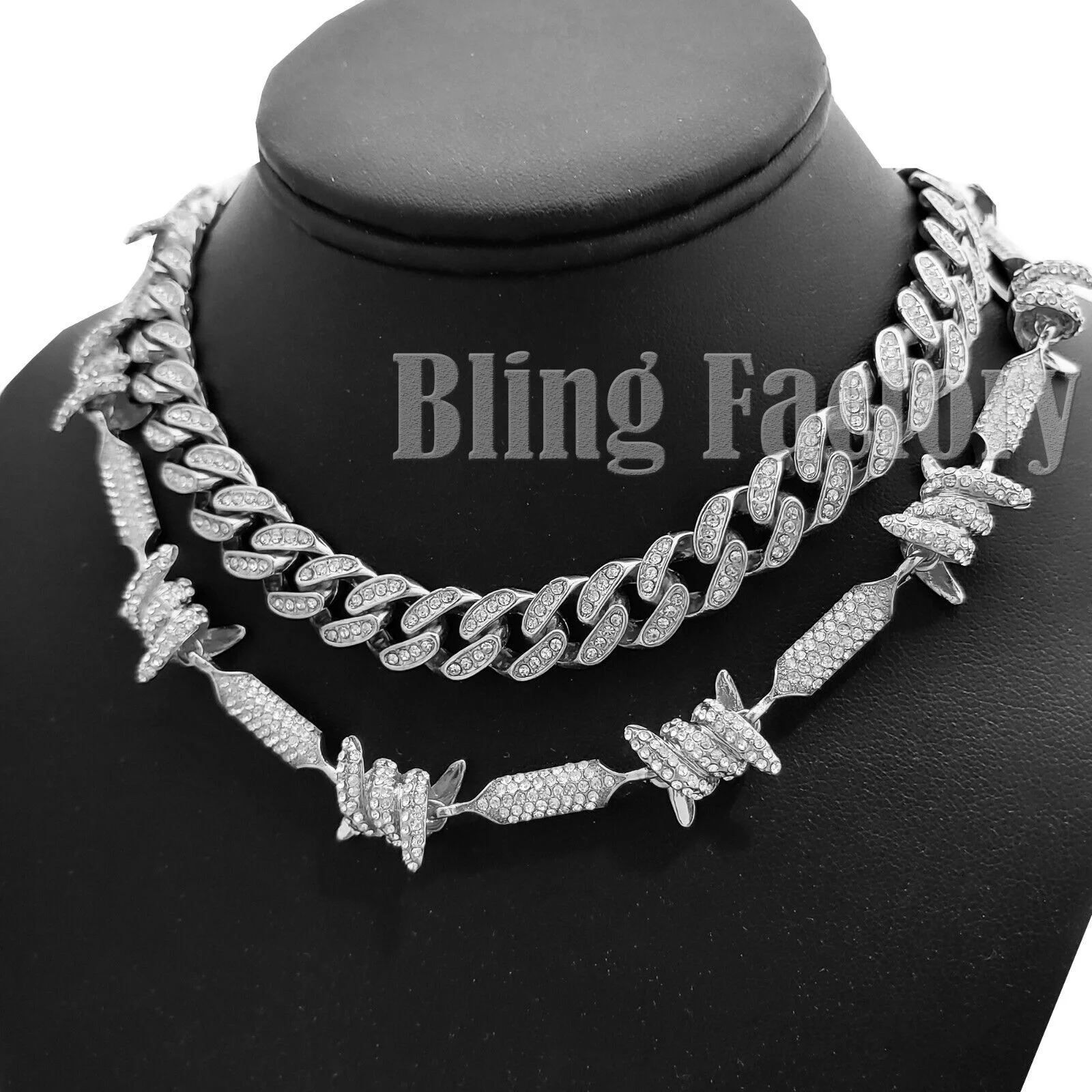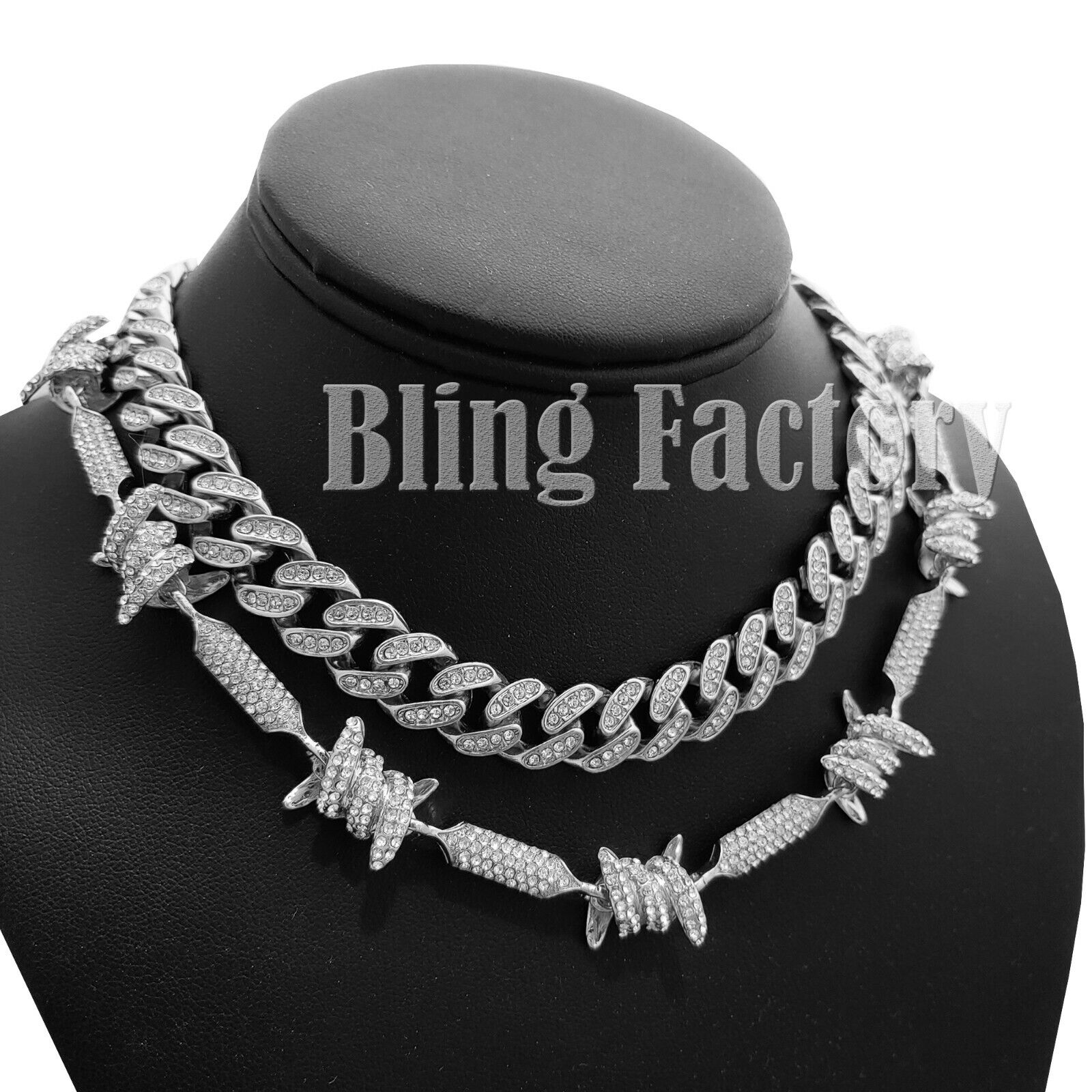 Hip Hop Silver PT Bling Full Iced 18" Cuban & Barbed Wire Choker Chain Necklace