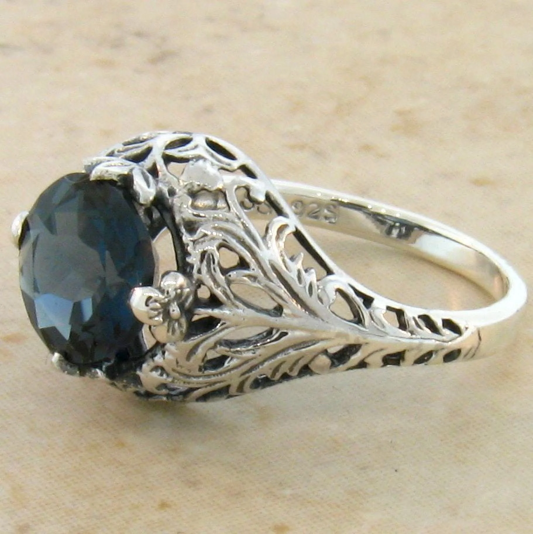 2 CARAT GENUINE LONDON BLUE TOPAZ 925 STERLING VICTORIAN STYLE FILIGREE RING #734