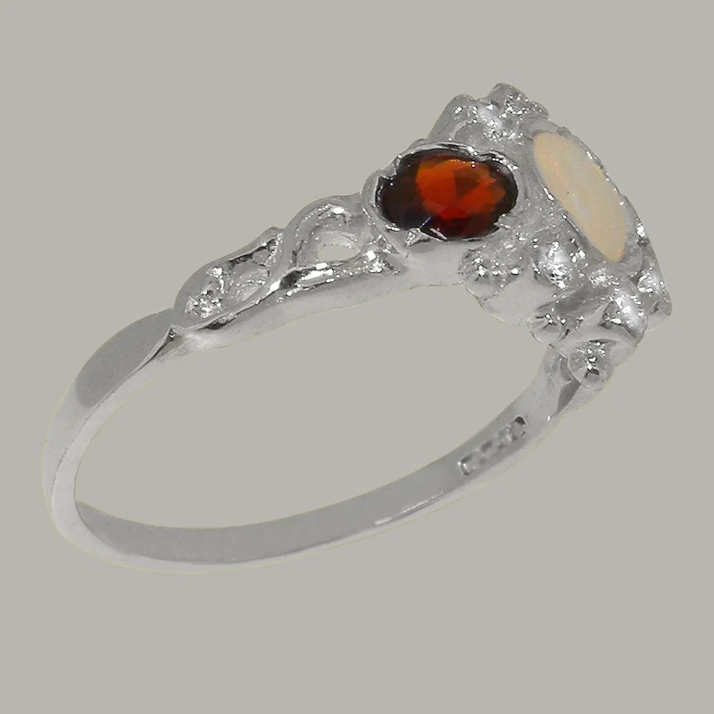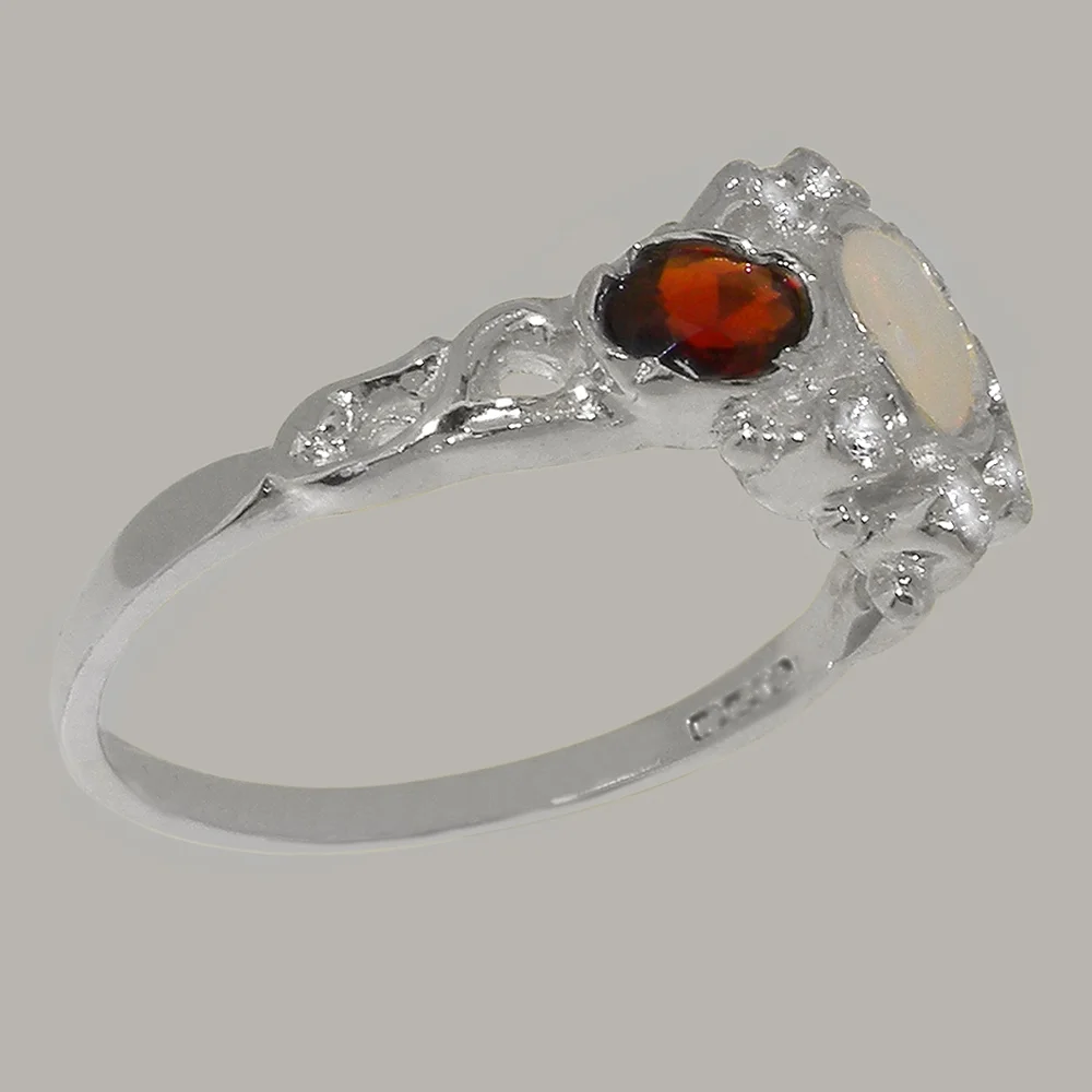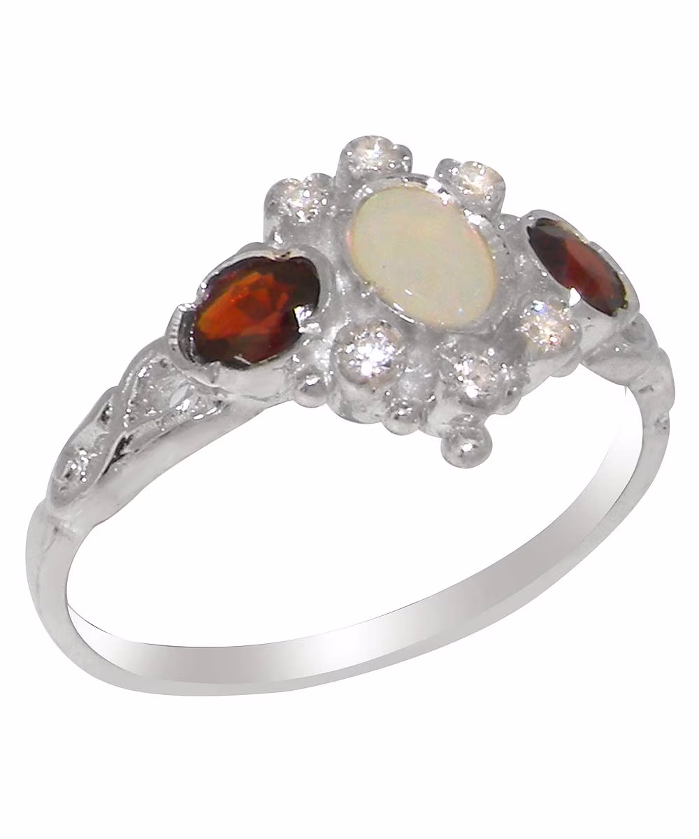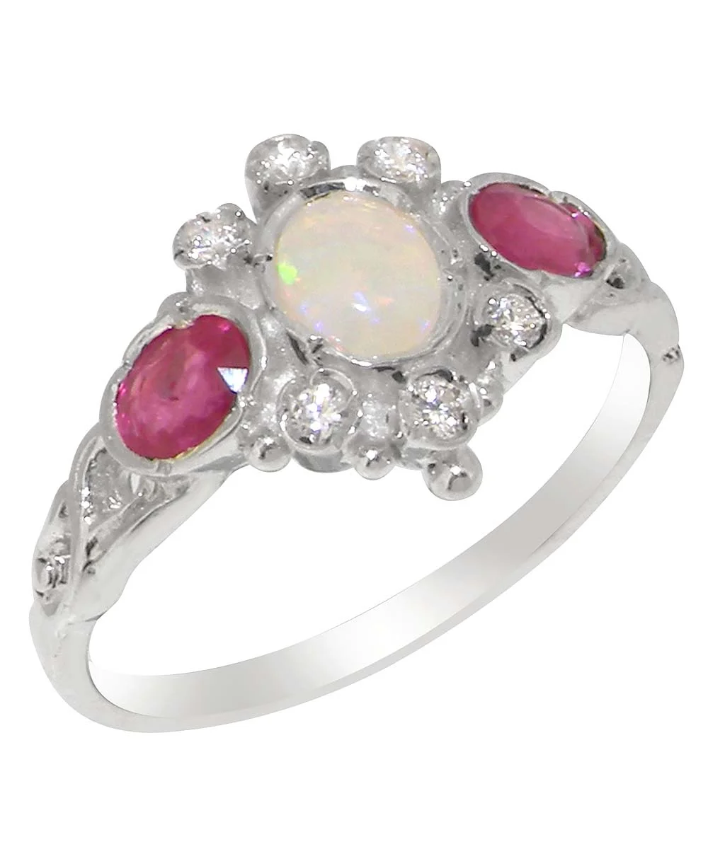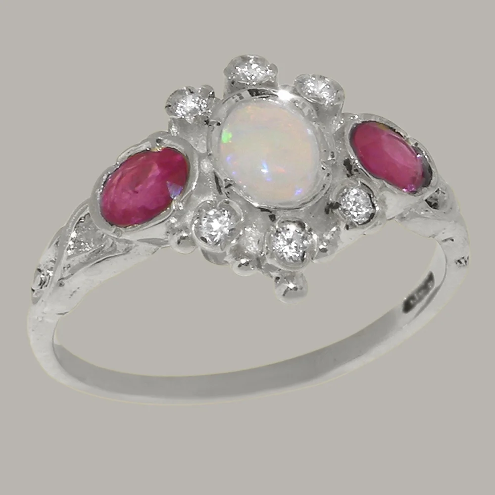 LBG English Made 9k White Gold Natural Opal Ruby Diamond Womens Anniversary Ring - Size 4.75