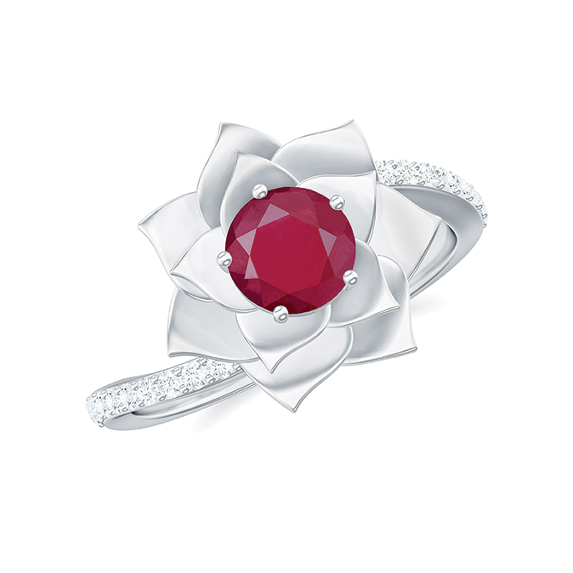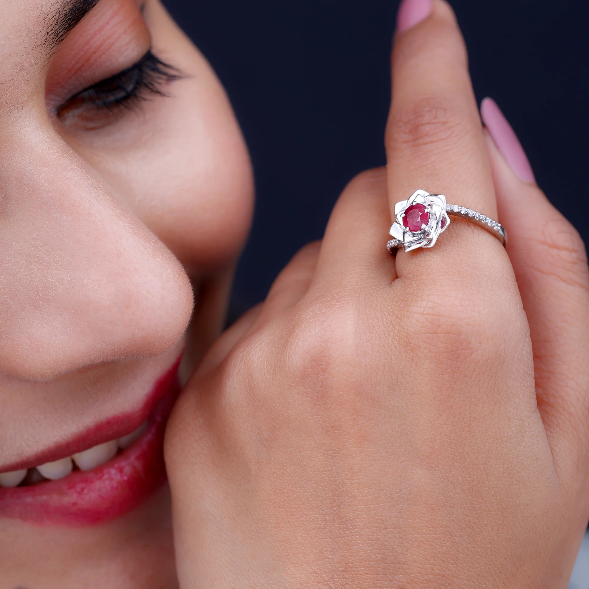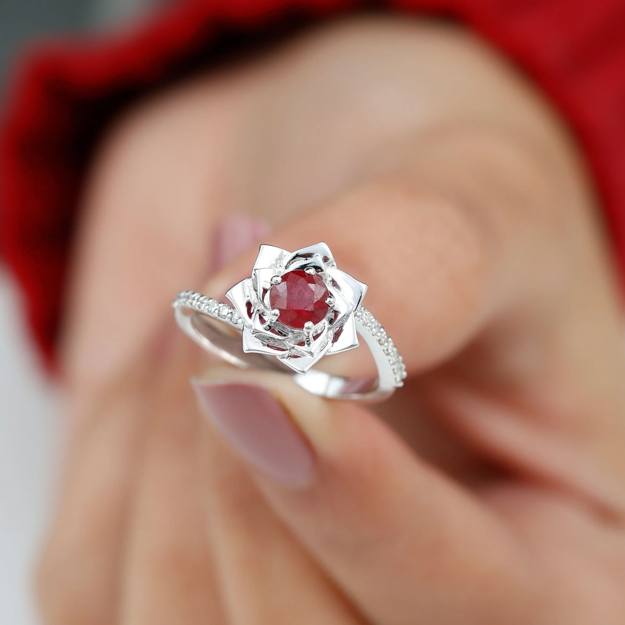 Natural Ruby Rose Floral Ring with Diamond for Women (5 mm) - 1 CT, AAA Grade, 925 Sterling Silver, US 4.00