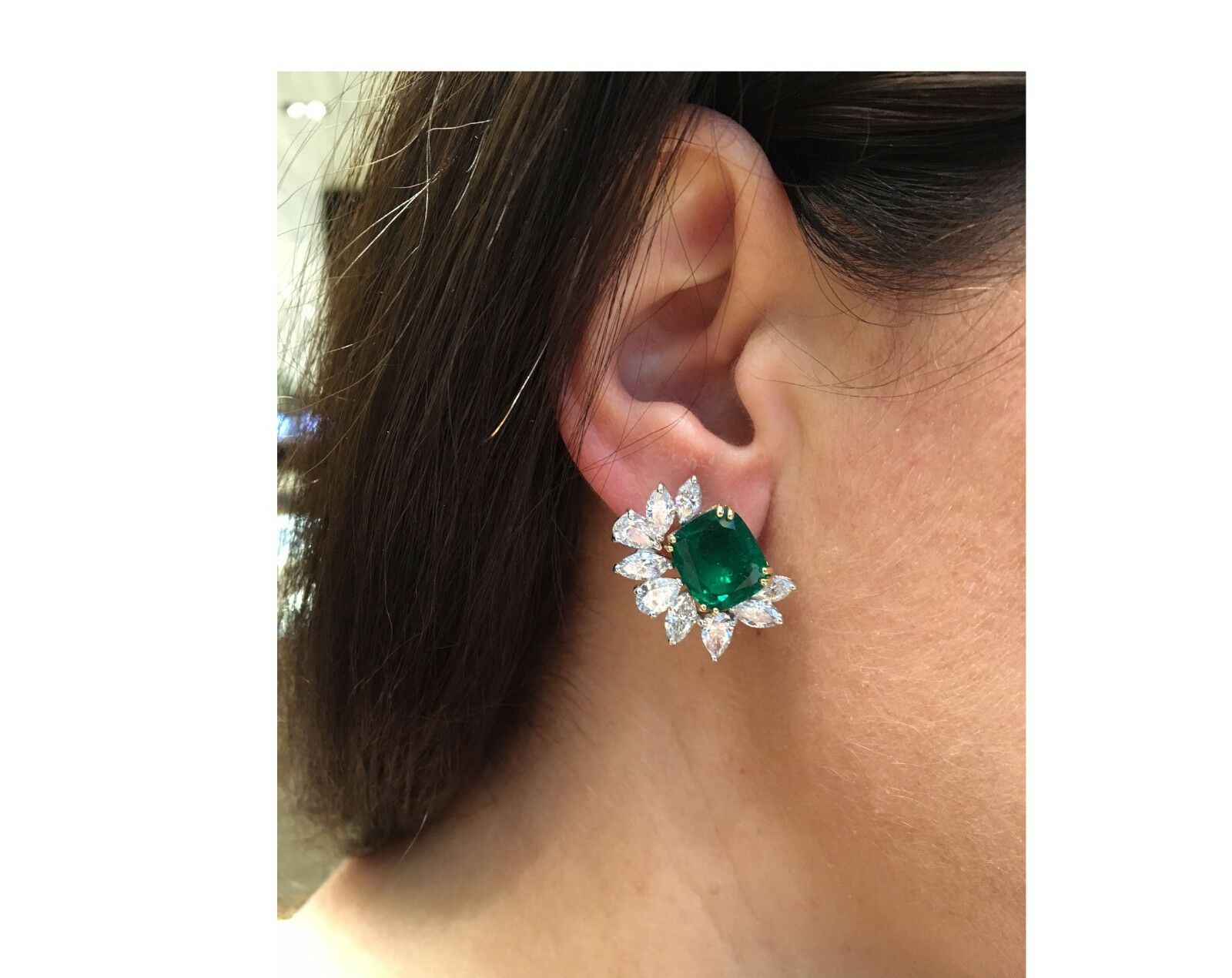 EMERALD TWO CUSHION SHAPE EARRING SET DIAMOND MARQUISE PEAR SHAPE PLATINUM