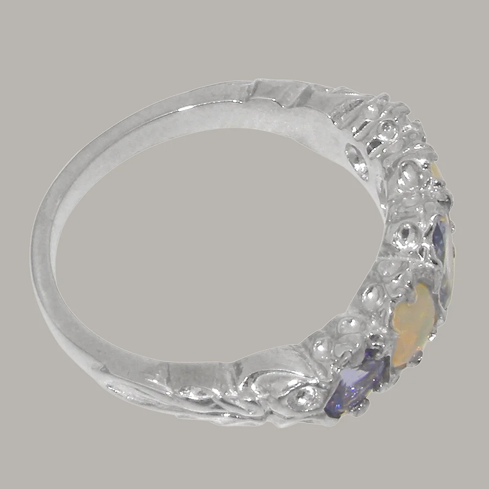 LBG British Made 14k White Gold Natural Tanzanite & Opal Womens Band Ring - 33 size options - Size 10