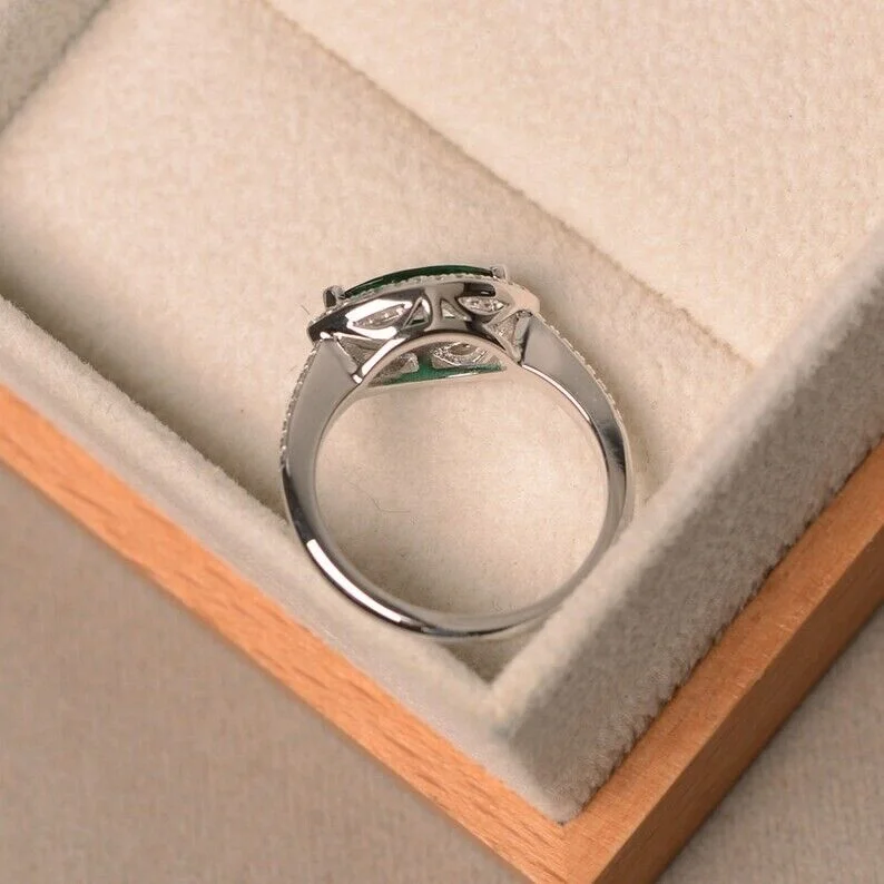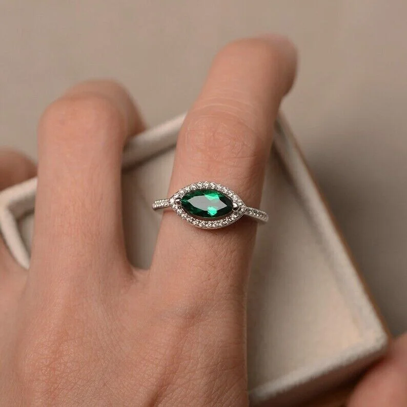 emerald ring, sterling silver, marquise cut ring, engagement ring, halo ring,