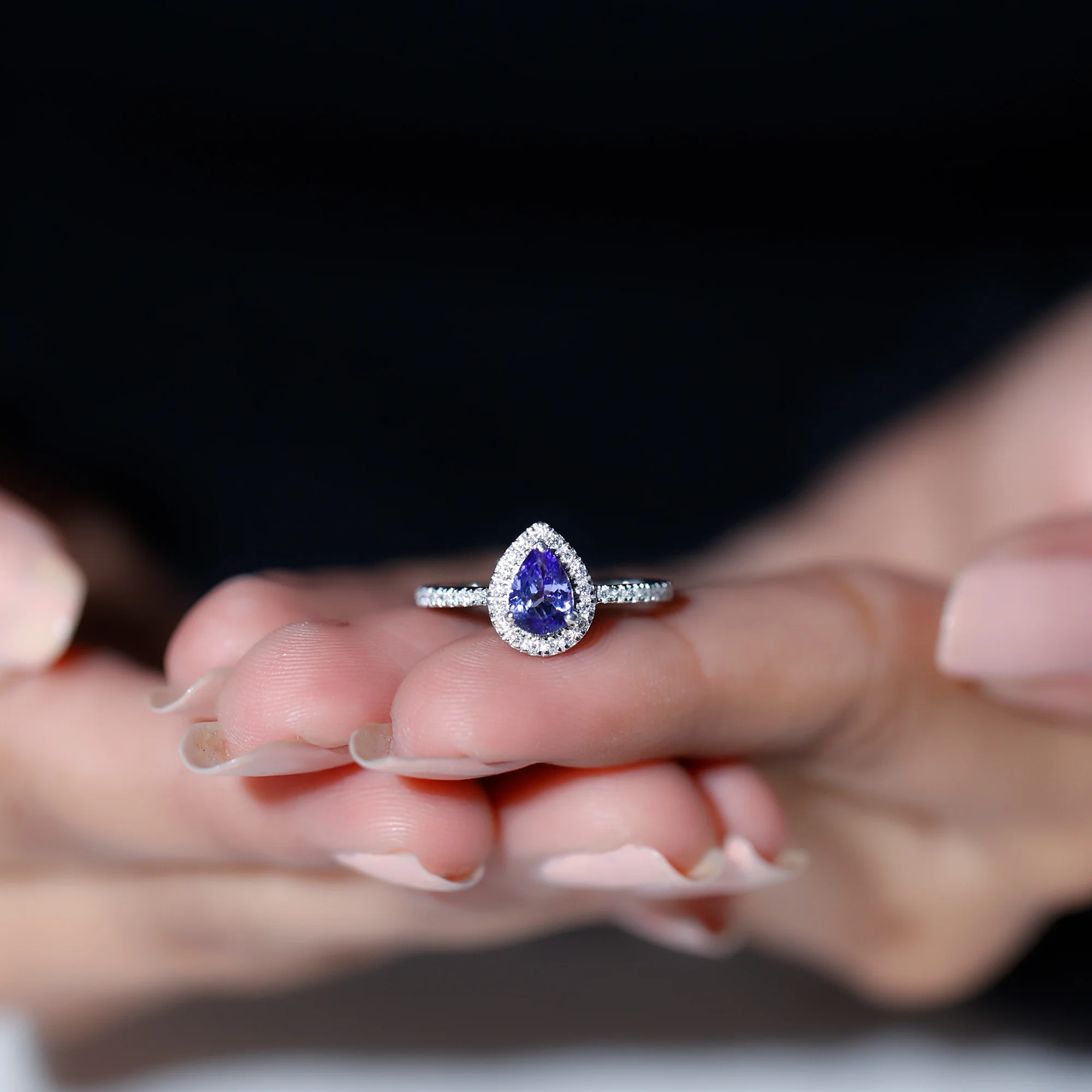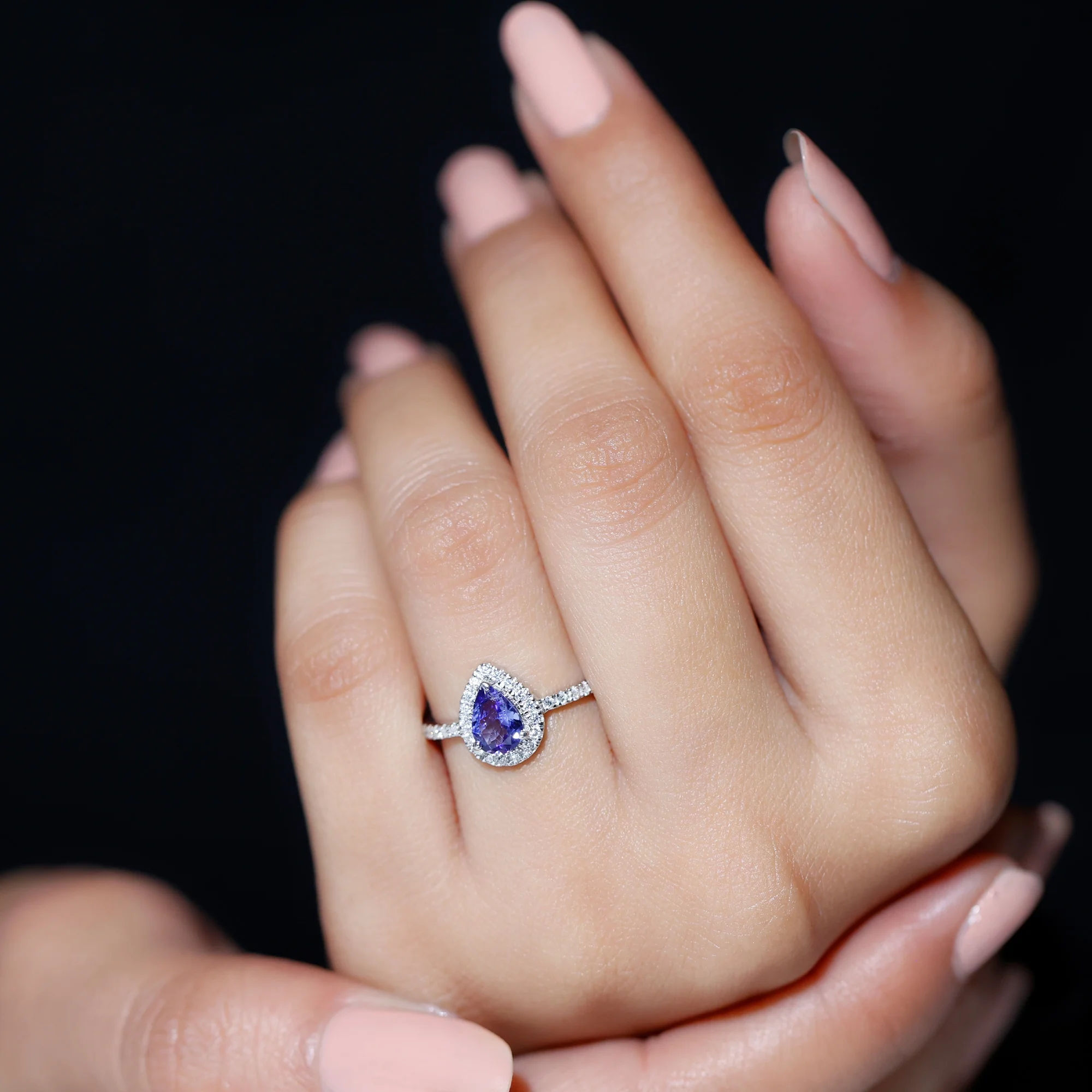 Pear Shape Tanzanite Teardrop Ring with Diamond Halo for Women - AAA Grade, 925 Sterling Silver, US 3.00