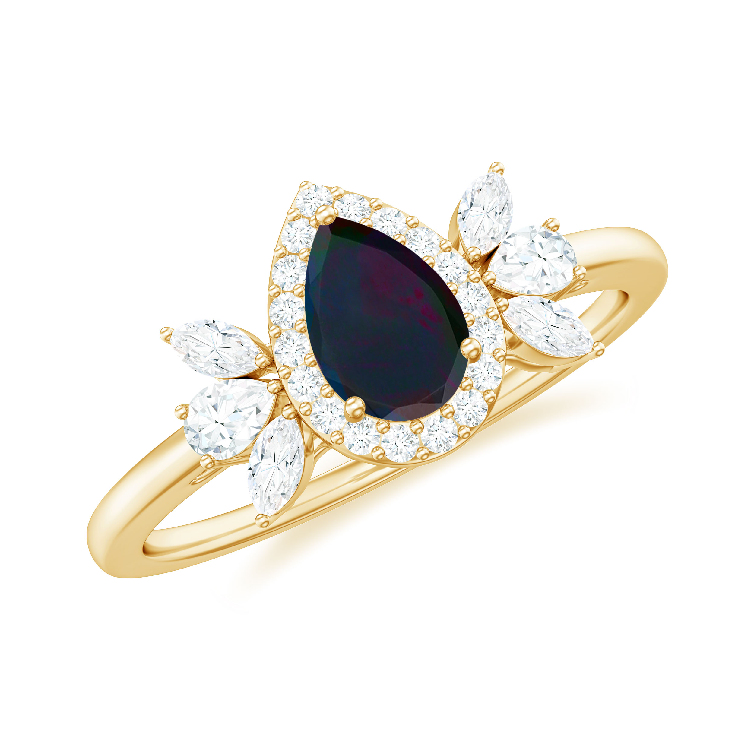 Natural Black Opal Teardrop Ring with Diamond Halo for Women (5X7 mm, AAA Grade), 10K Yellow Gold, US 4.50
