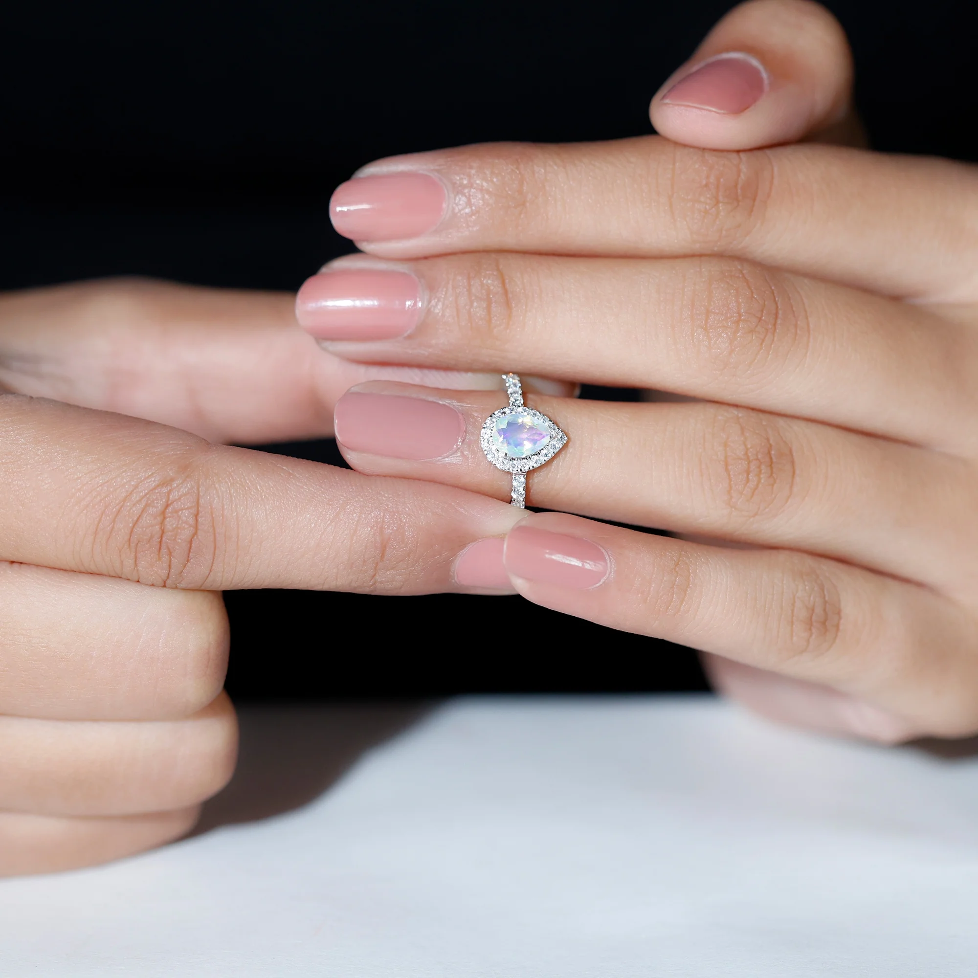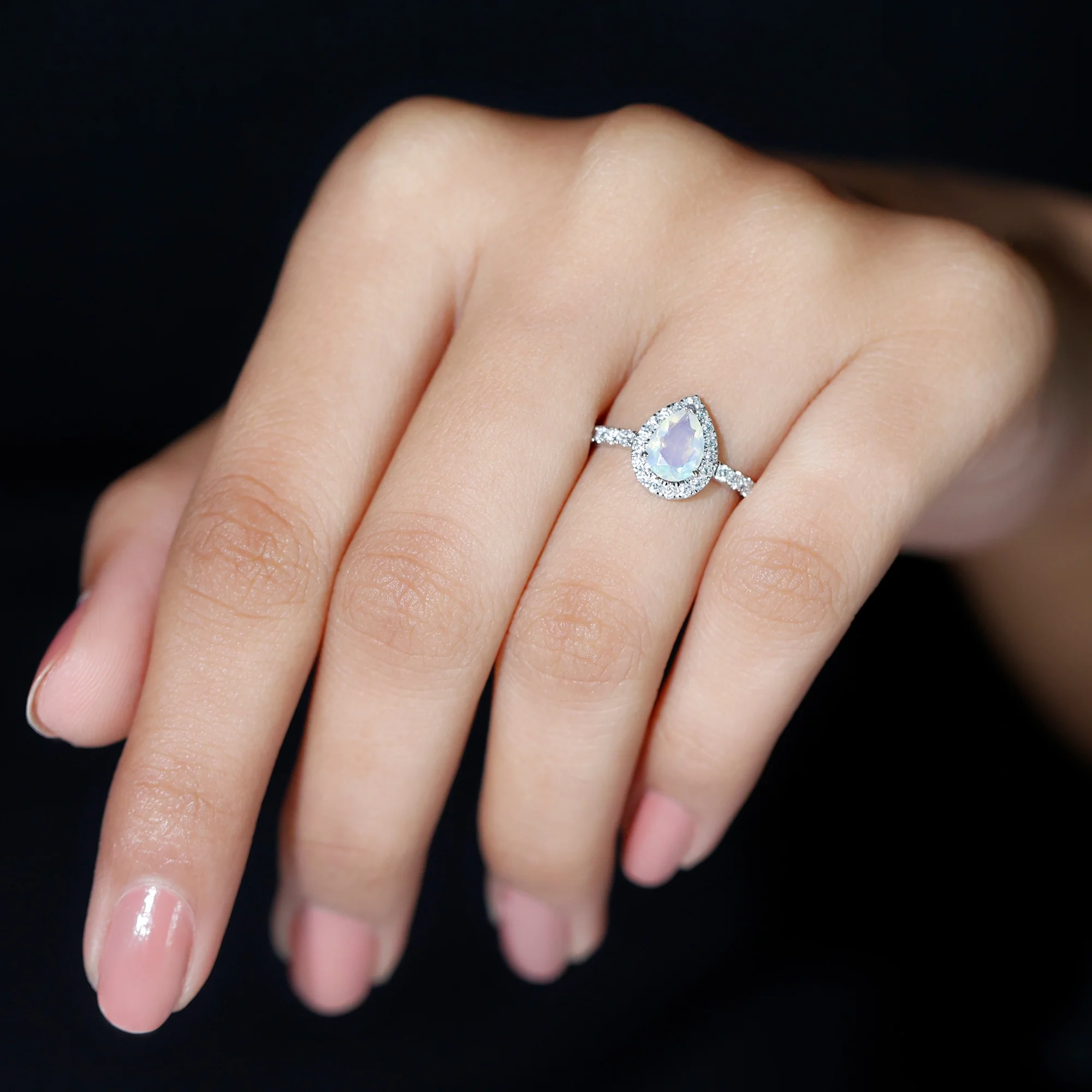 Ethiopian Opal Teardrop Ring with Diamond Halo (1 CT, AAA Quality), 14K White Gold, US 5.50