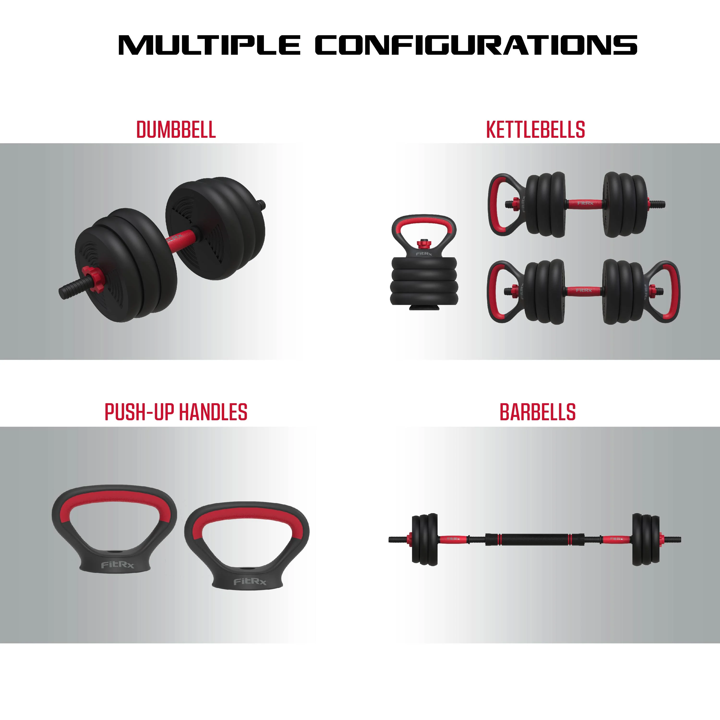 FitRx SmartBell Gym, 60 lbs. 4-in-1 Adjustable Interchangeable Dumbbell, Barbell, and Kettlebell Weight Set, Black