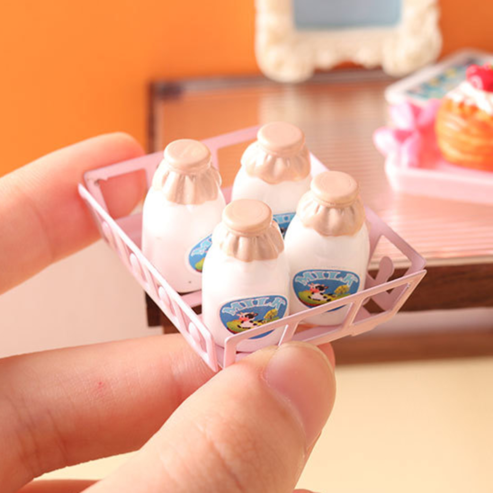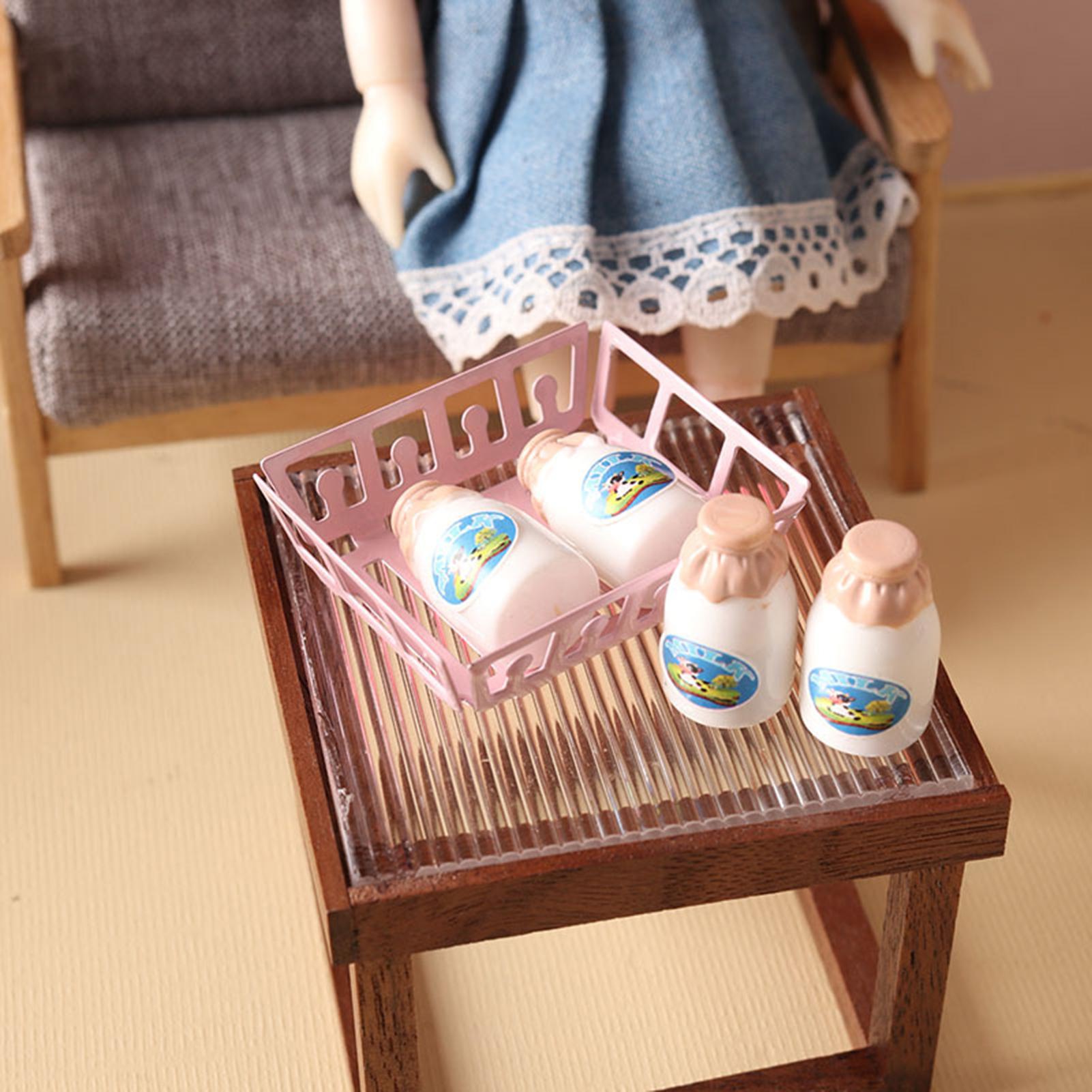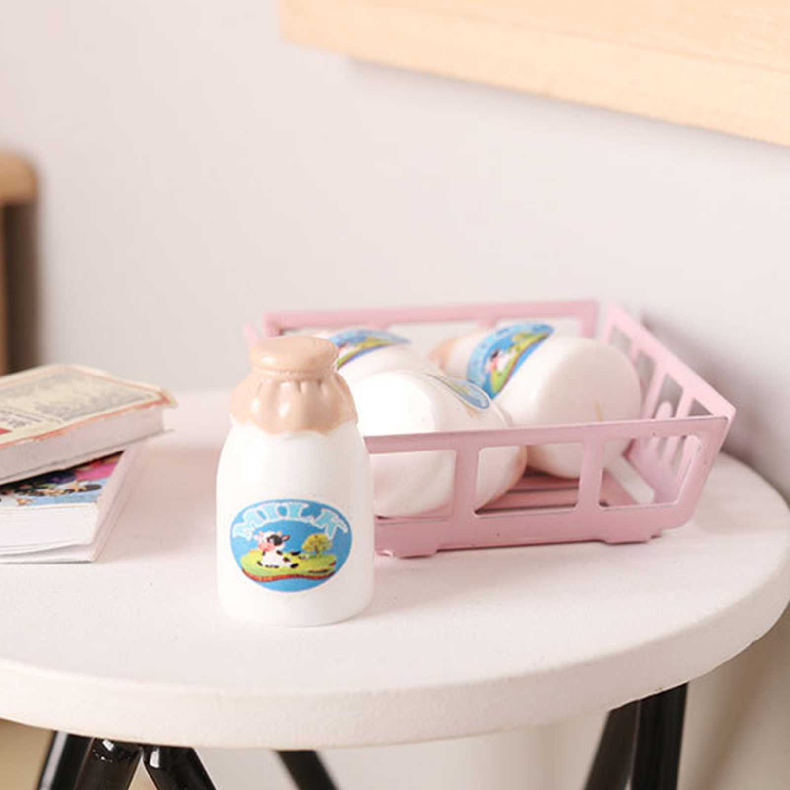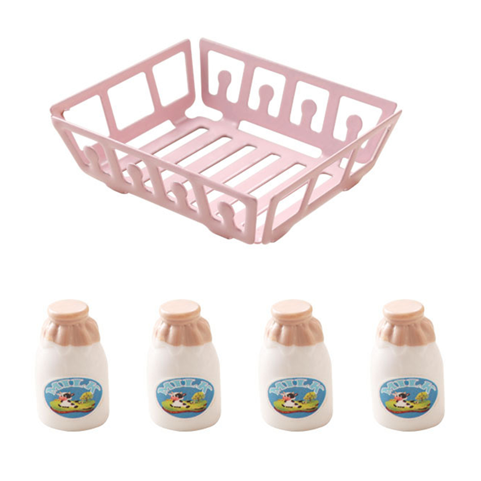 Kripyery Milk Bottle Model 1:12 Scale Dollhouse Miniature Milk Bottle with Storage Basket Fun Playhouse Toy for Kids