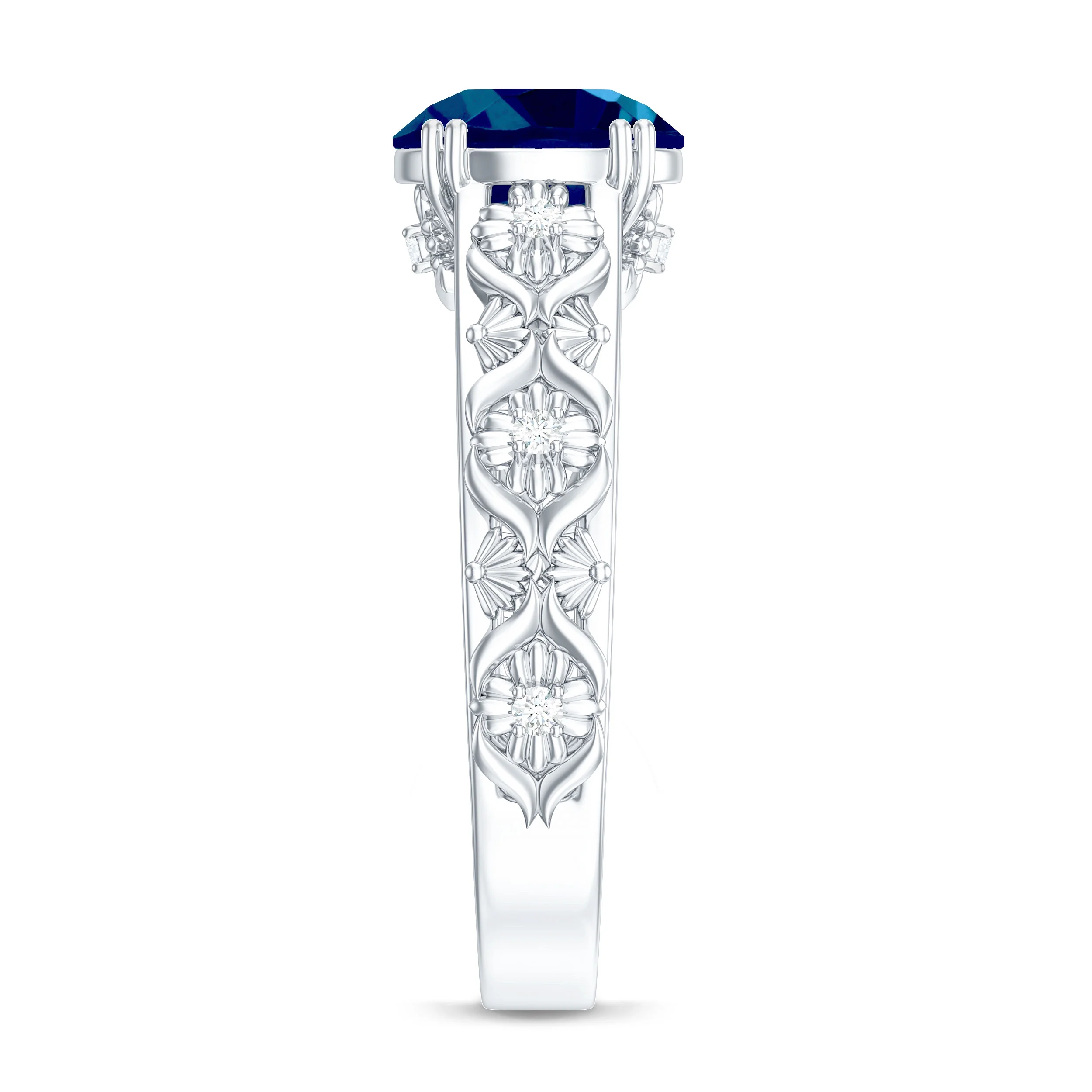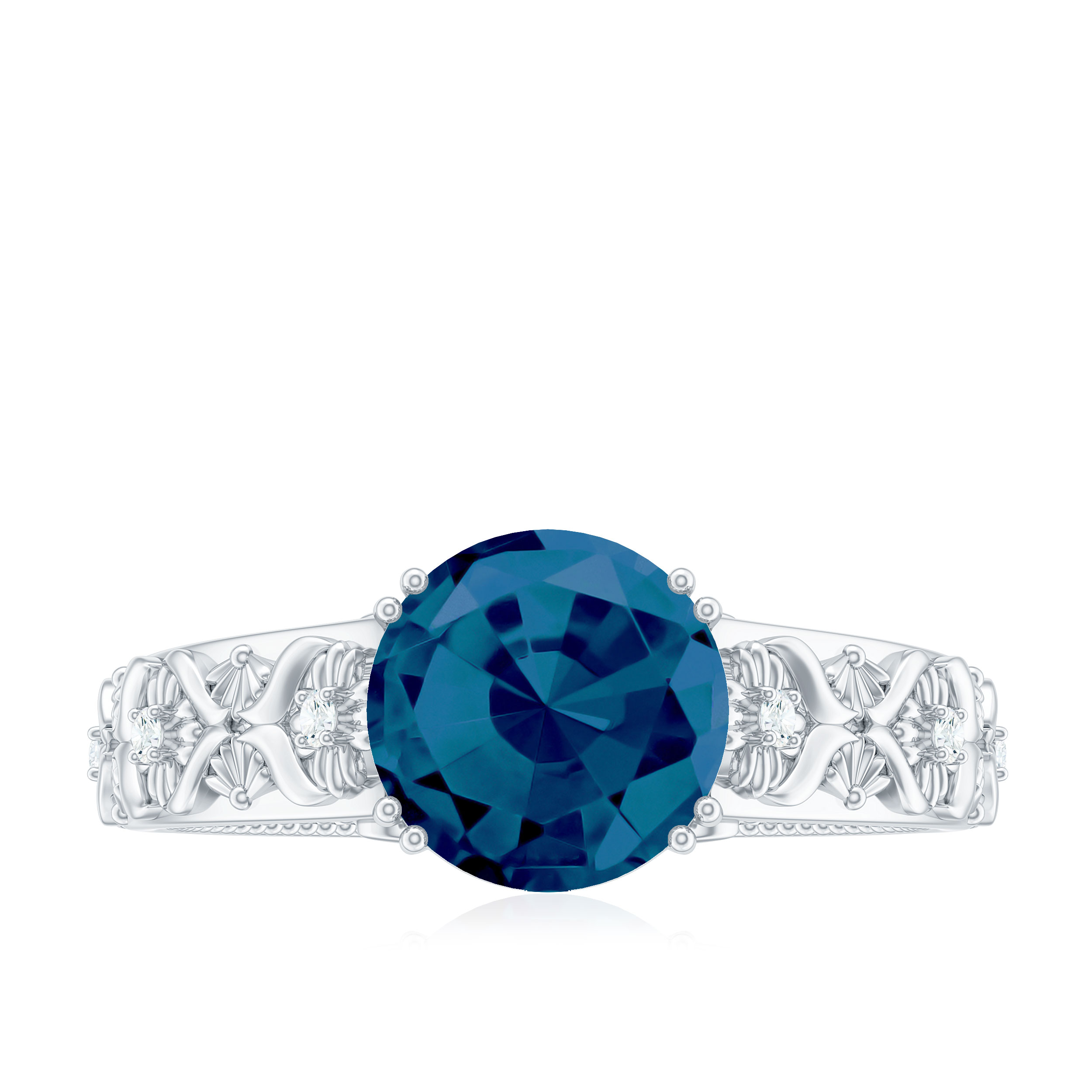 2 CT London Blue Topaz and Diamond Engagement Ring, Floral Inspired Engraved Ring, 10K White Gold, US 12.50