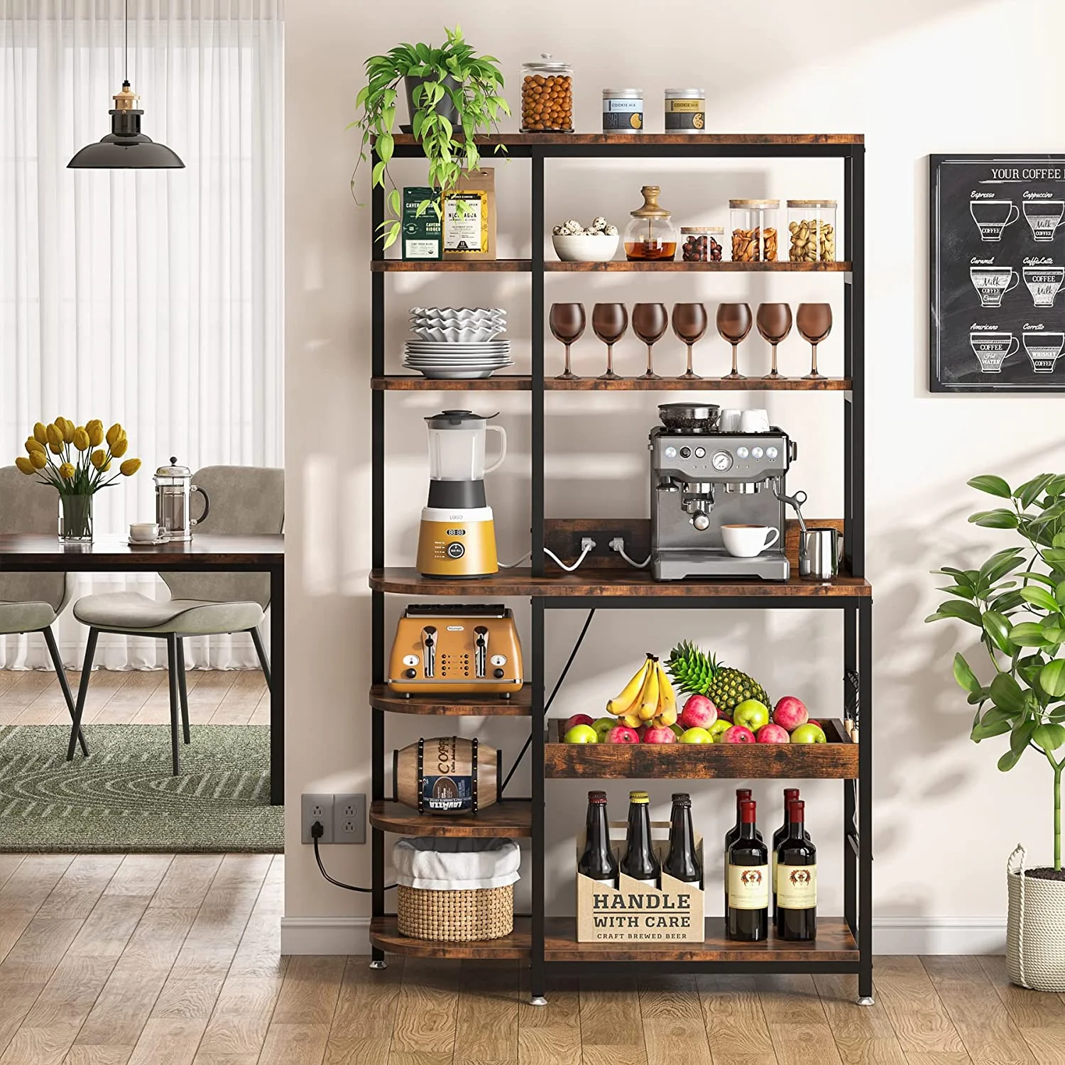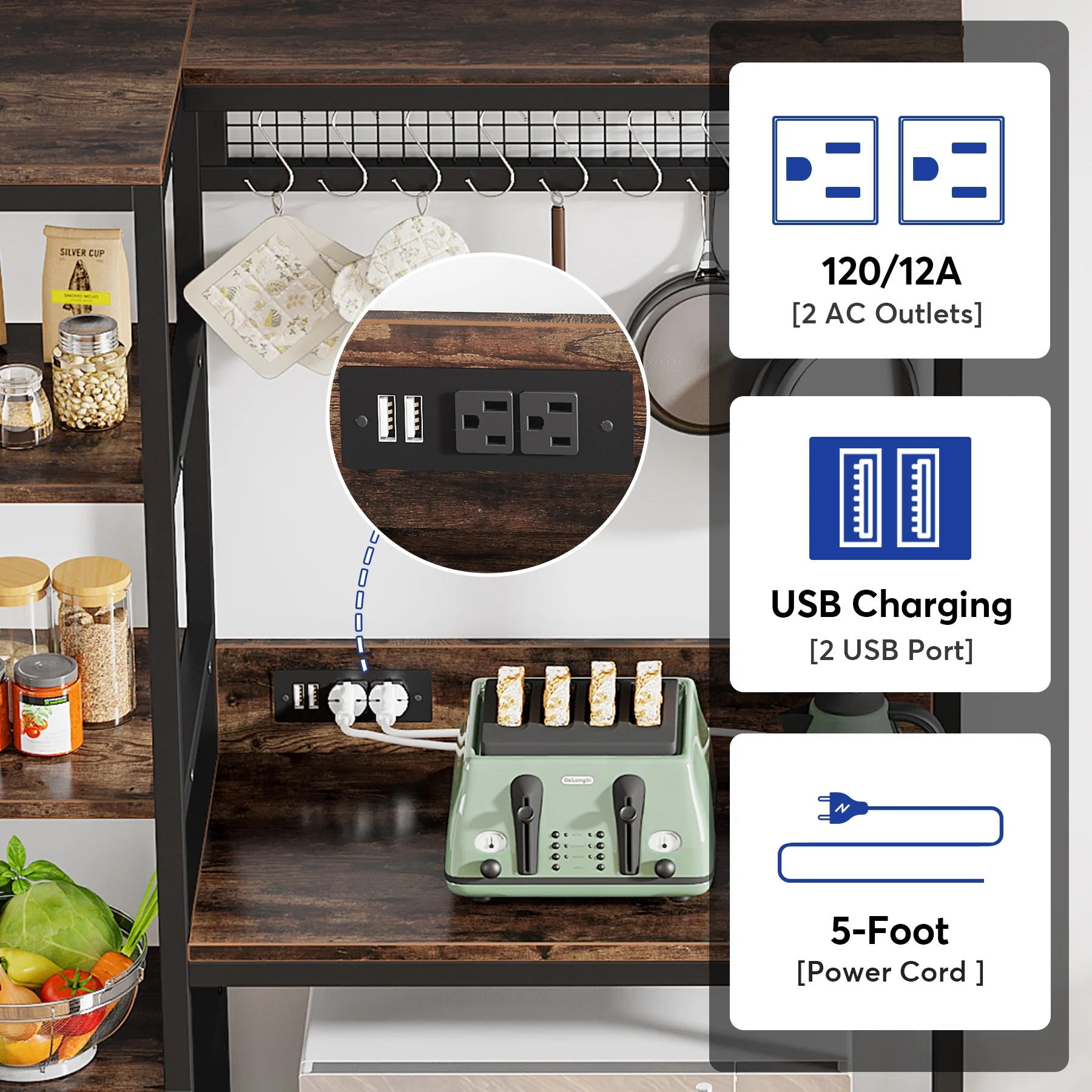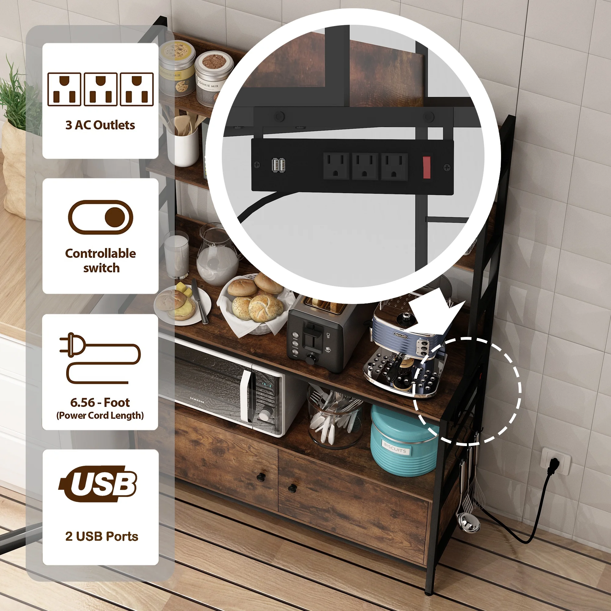 NAIYUFA Kitchen Baker Rack 5-Tier Large Capicity Brown Wood Shelves Microwave Rack with Power Outlets