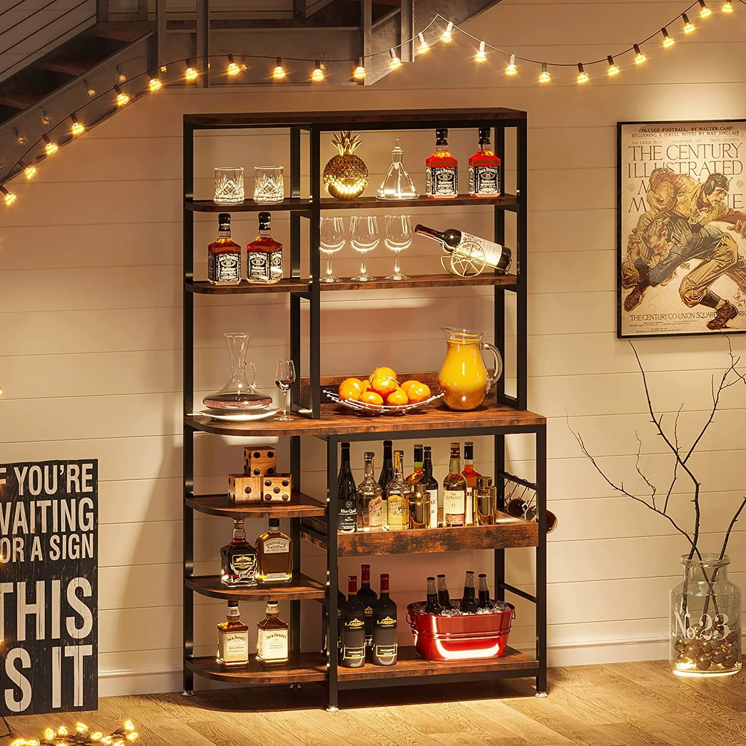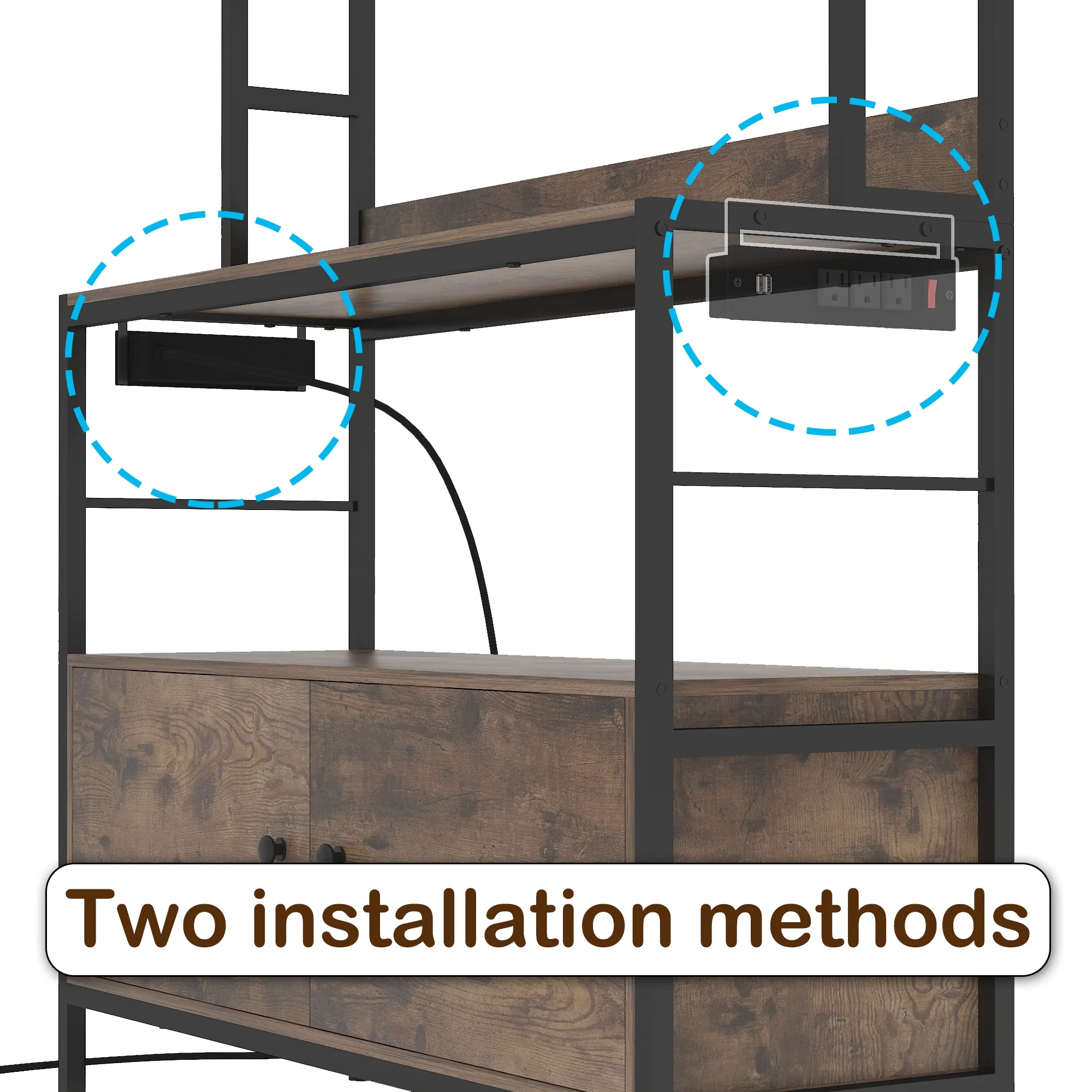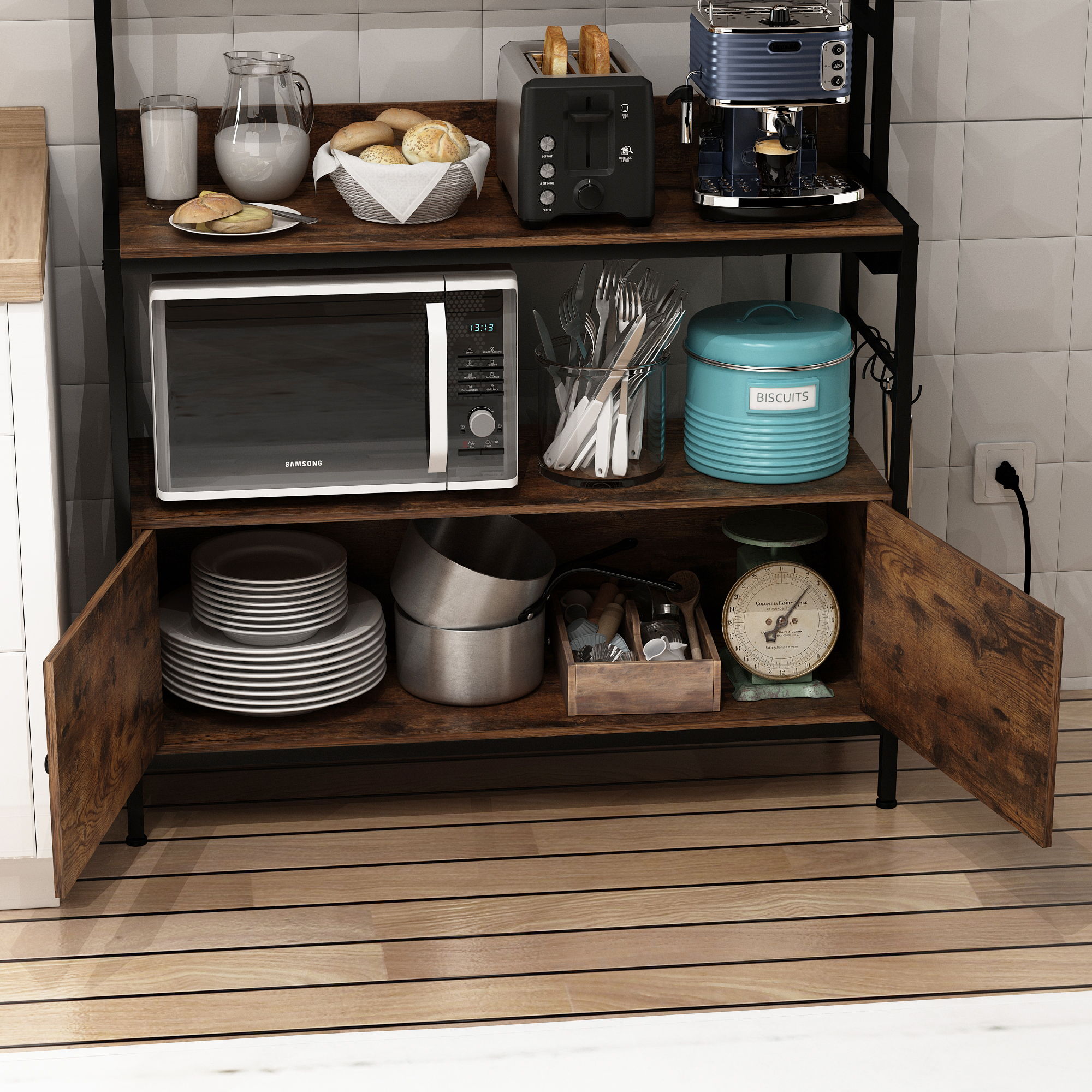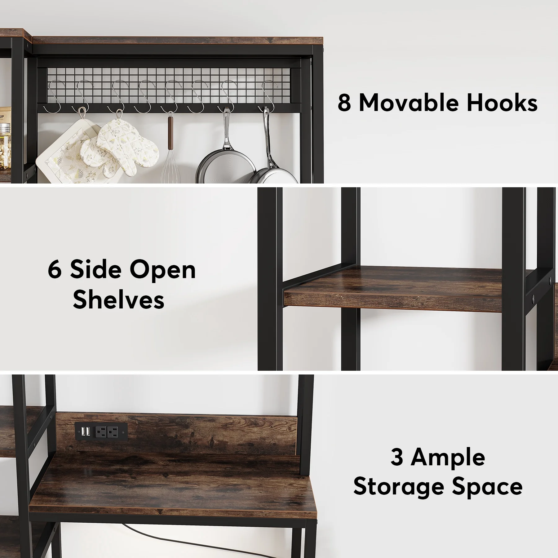 NAIYUFA Kitchen Baker Rack 5-Tier Large Capicity Brown Wood Shelves Microwave Rack with Power Outlets