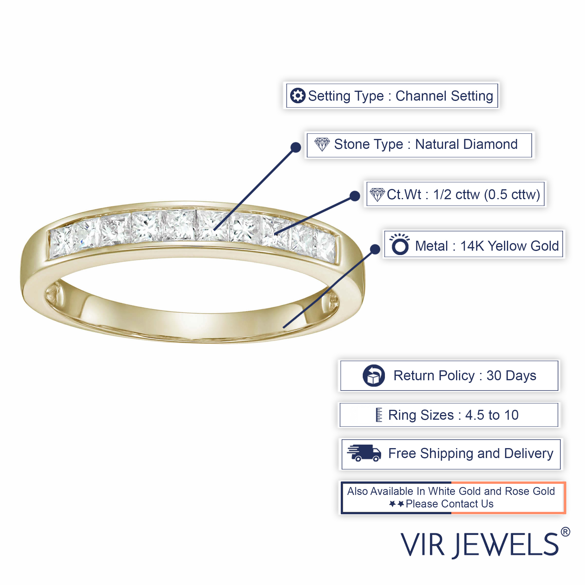 Vir Jewels 1/2 CTTW Princess Cut Diamond Wedding Band 14K Yellow Gold Channel Set Size 9 Female Adult