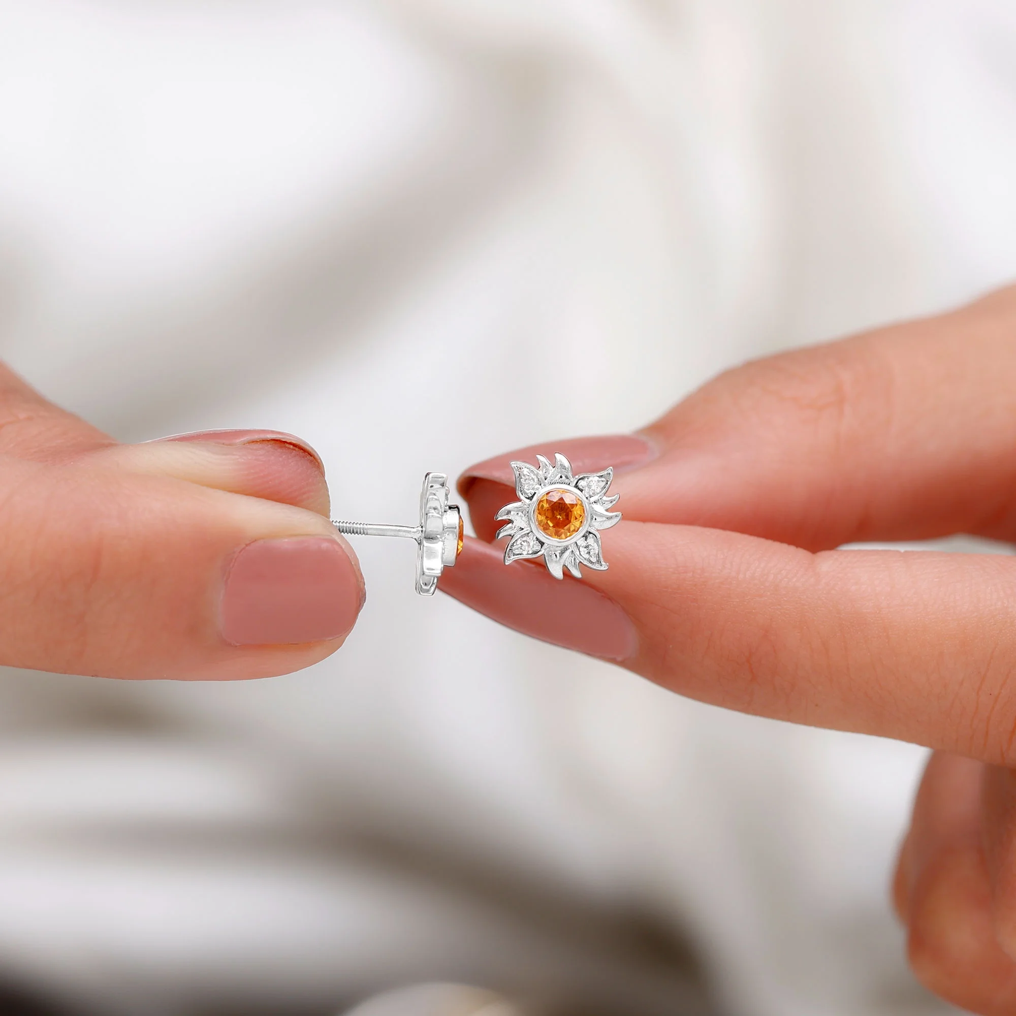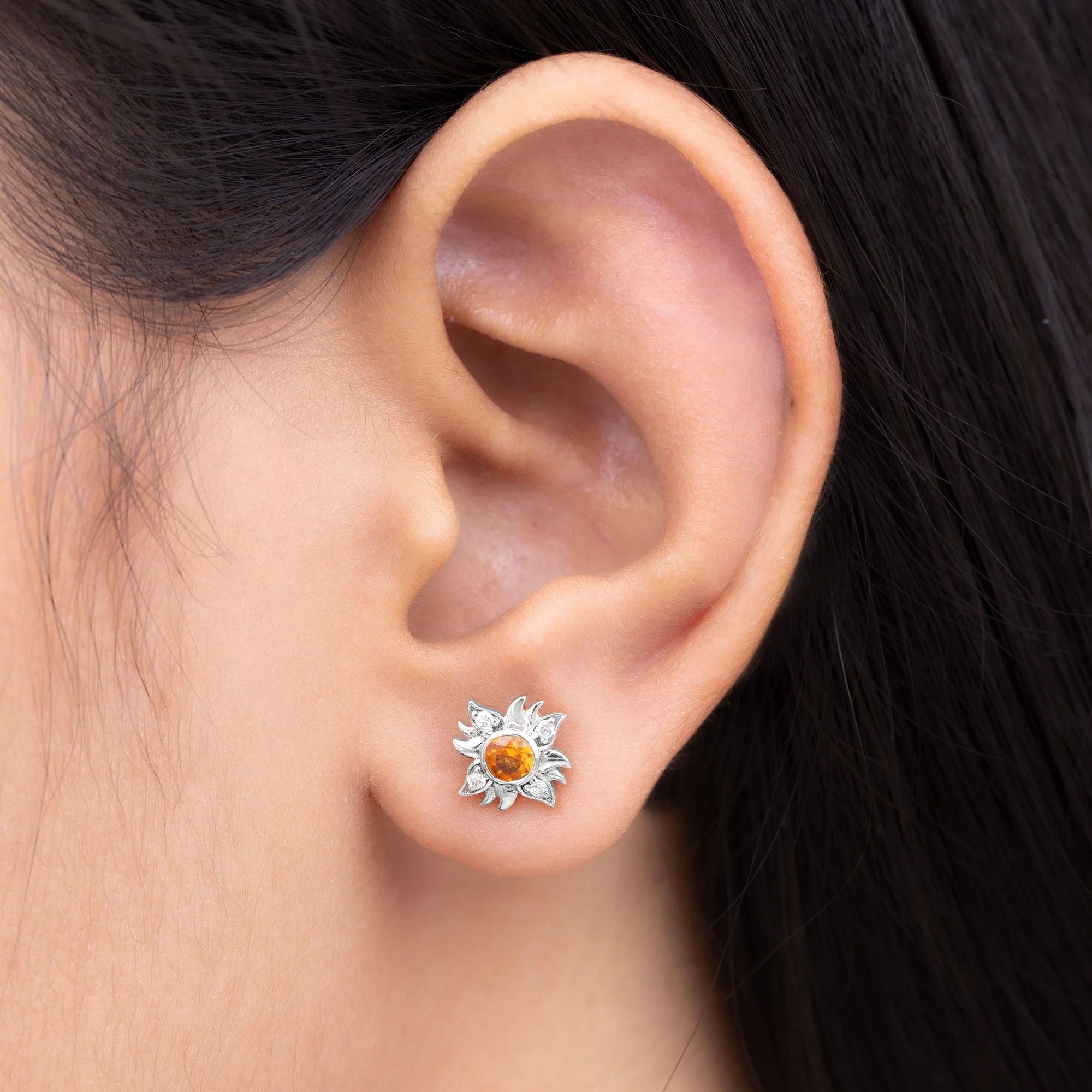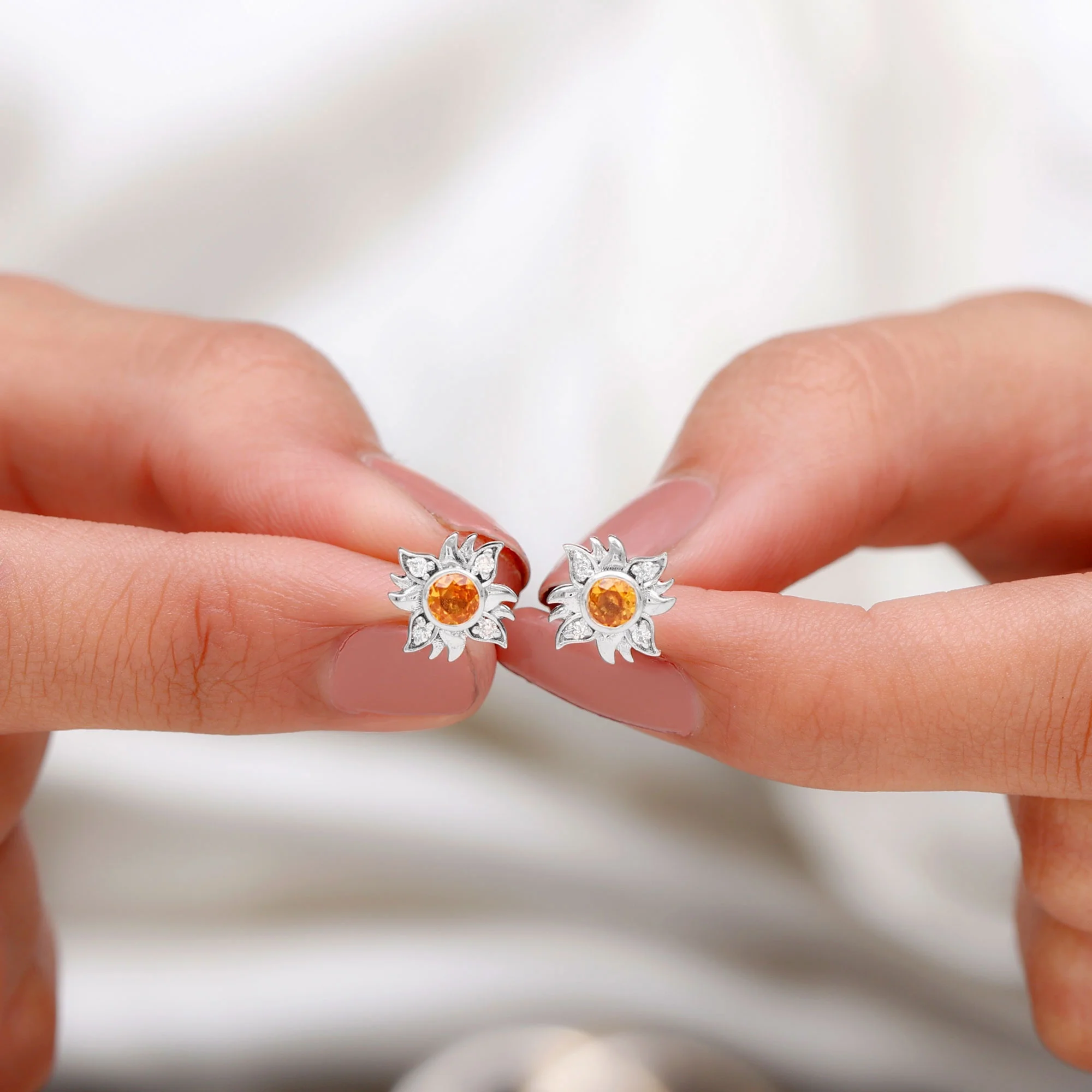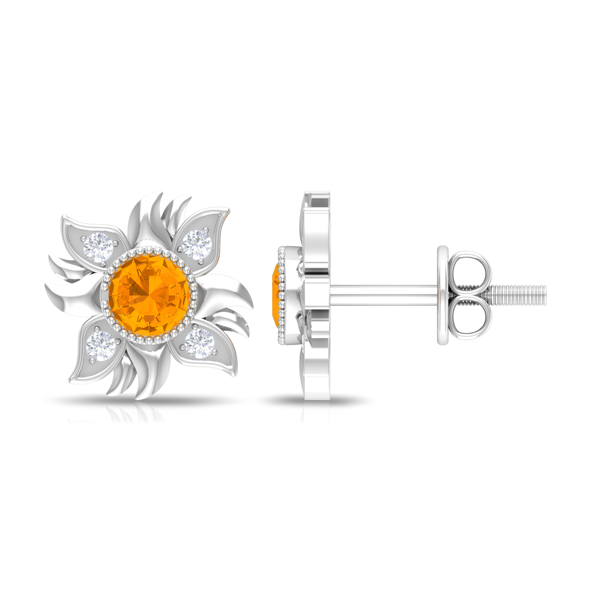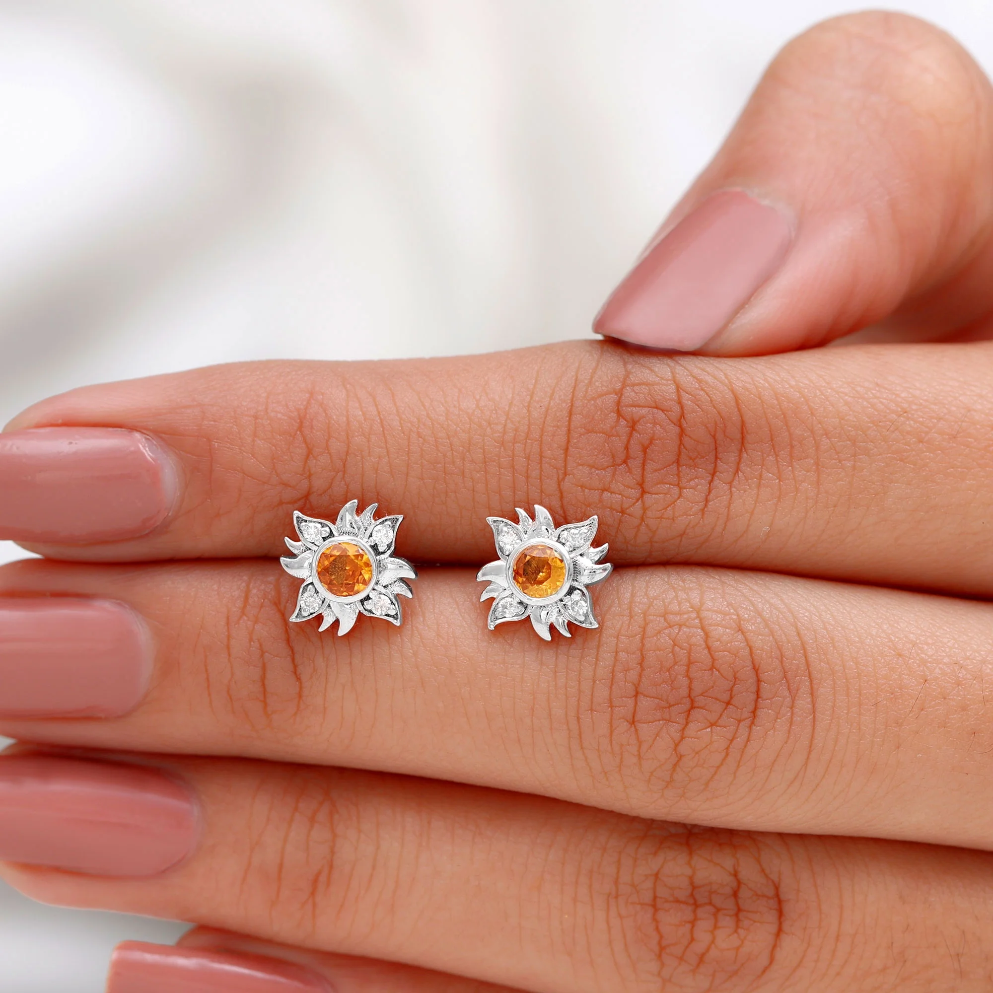 Orange Sapphire Stud Earrings with Diamond, Sunburst Earrings For Women, 18K White Gold