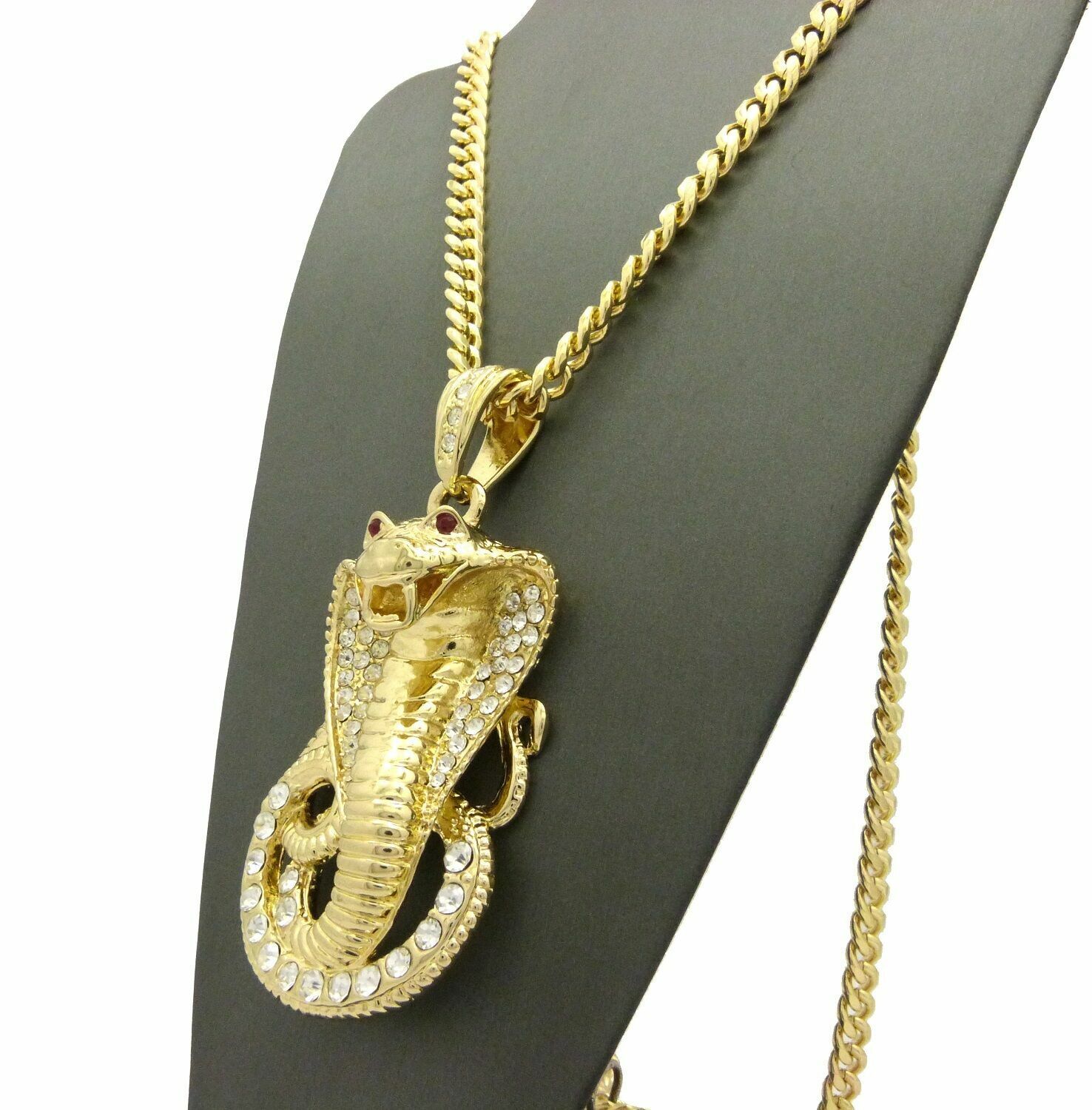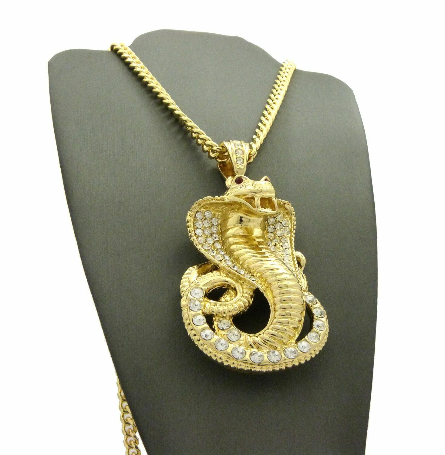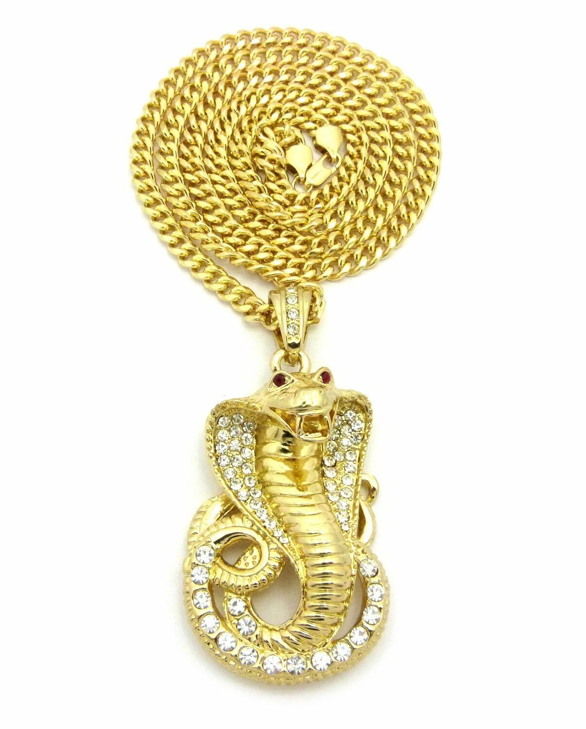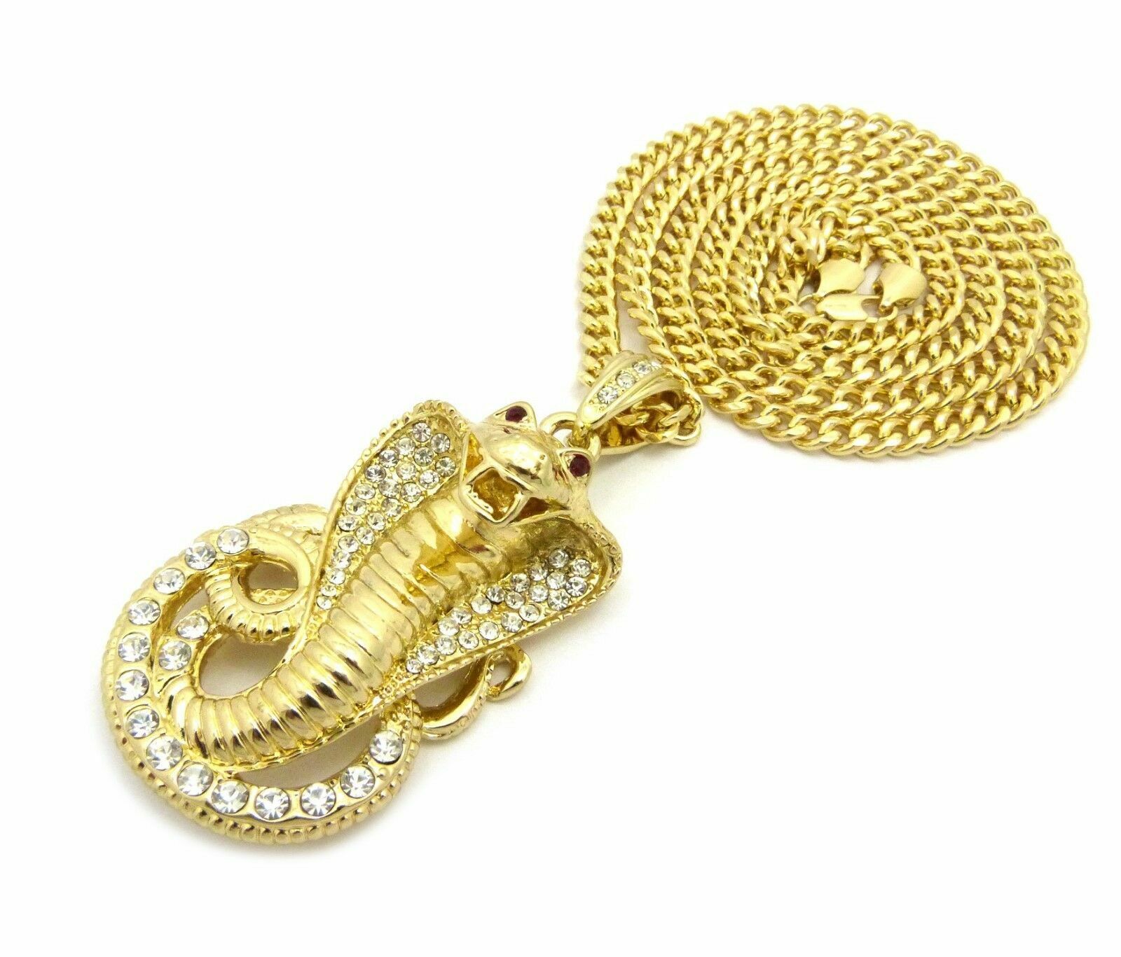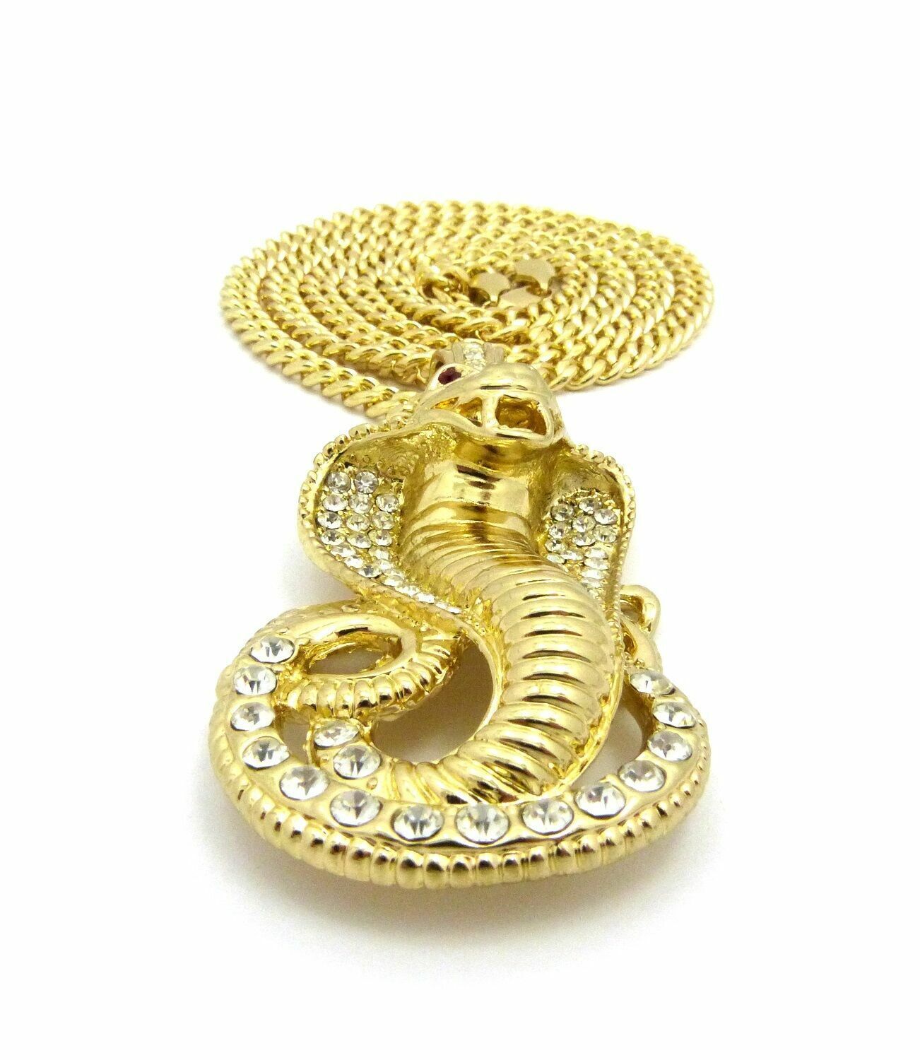 Large Cobra Snake Gold Plated Cubic Zirconia Pendant & 30" Cuban Chain Necklace