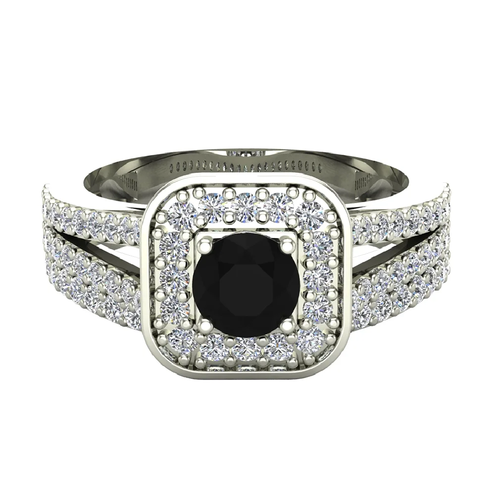 Black Diamond Wedding Ring Set Round Cut Black Diamond Cushion Halo Rings Split Shank 14K White Gold 1.25 Carat