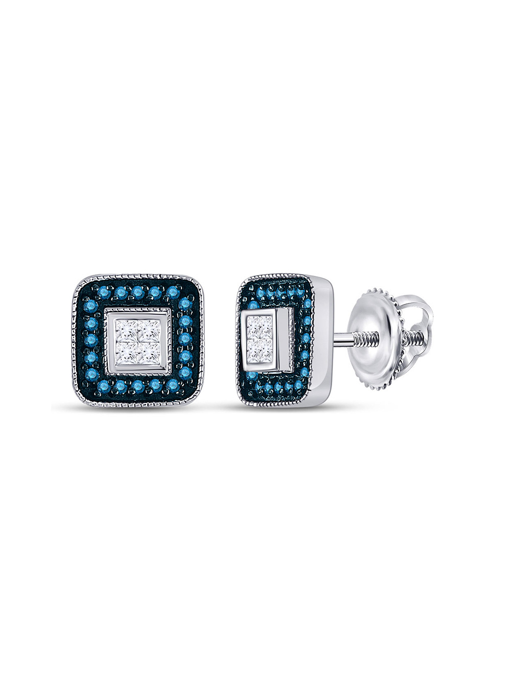 10k White Gold Womens Blue Color Enhanced Diamond Square Cluster Stud Earrings 1/10 Cttw
