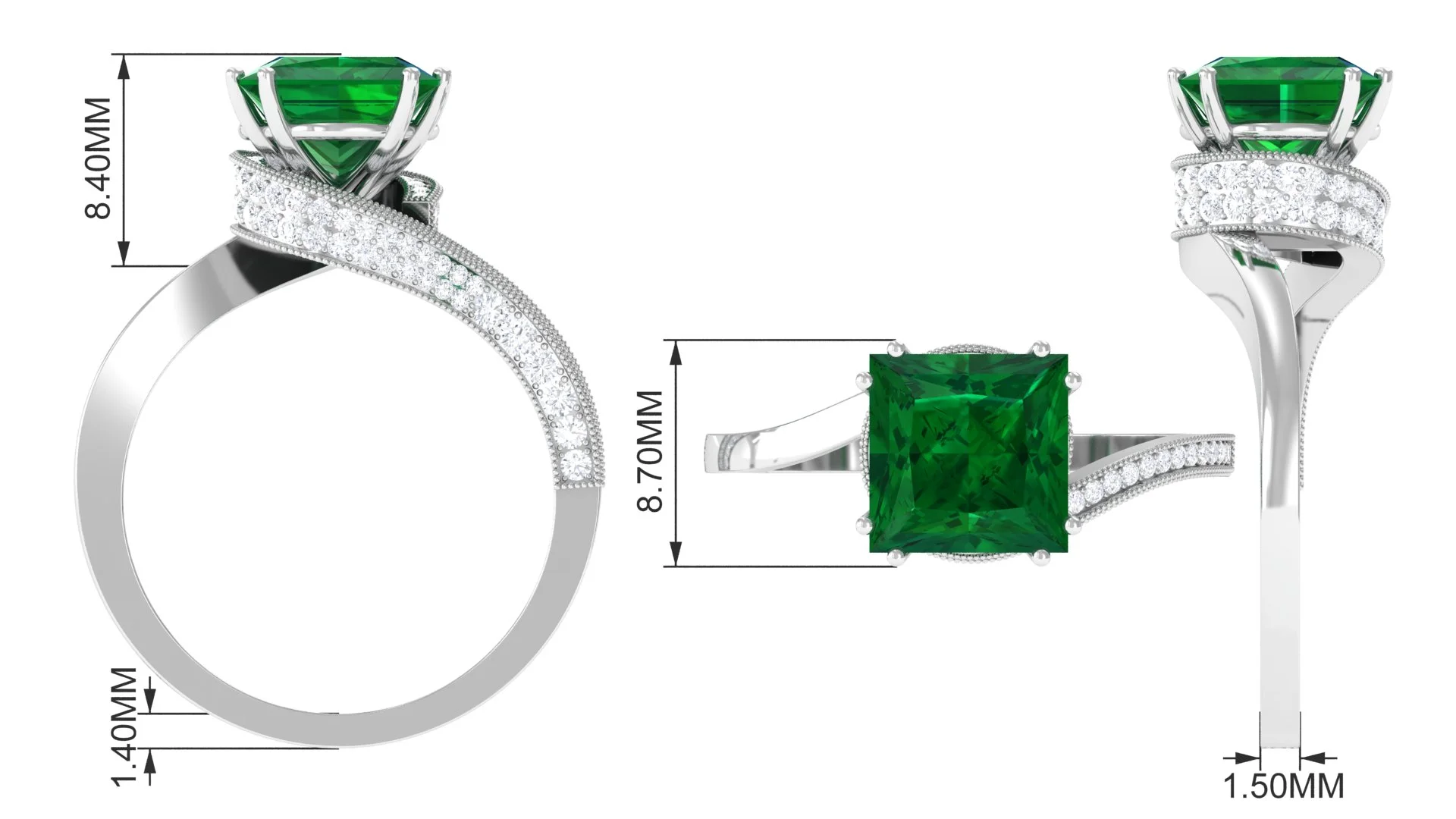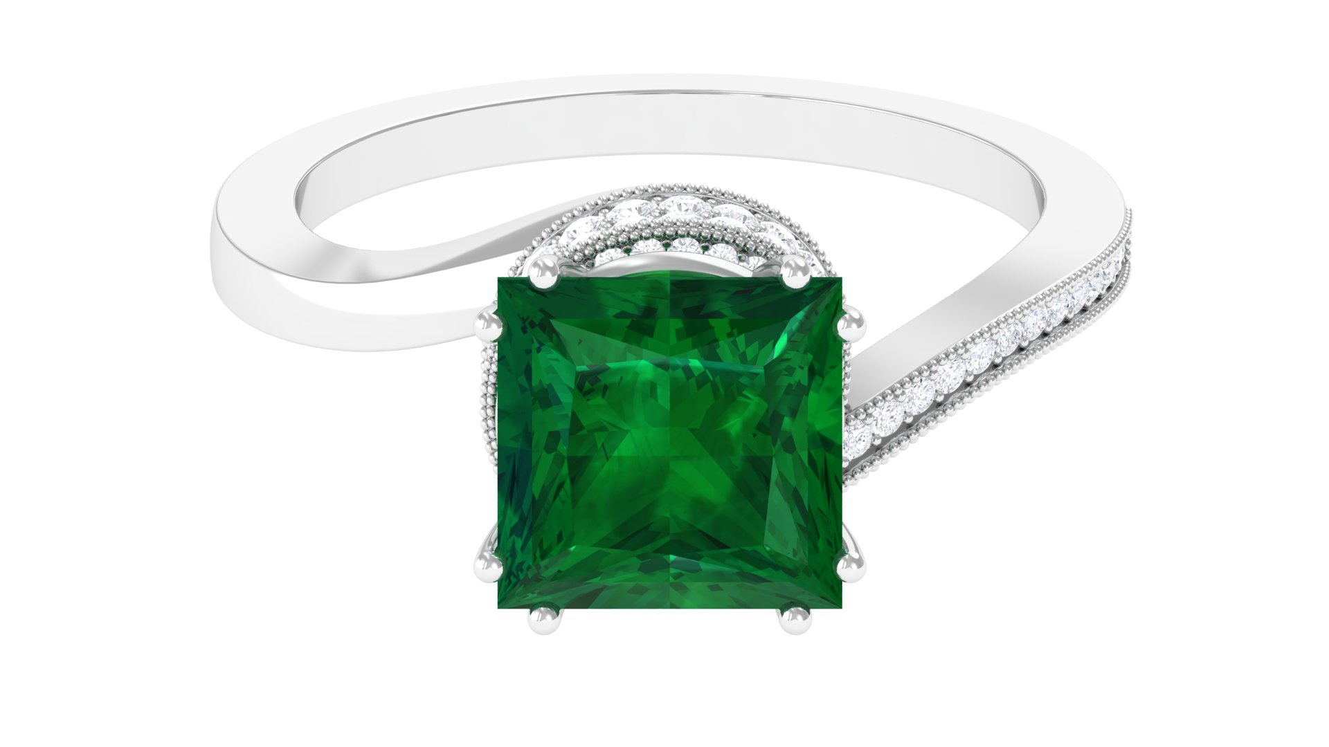 Lab Grown Emerald Solitaire Ring with Diamond, Princess Cut Ring - 8 mm, 925 Sterling Silver, US 10.00
