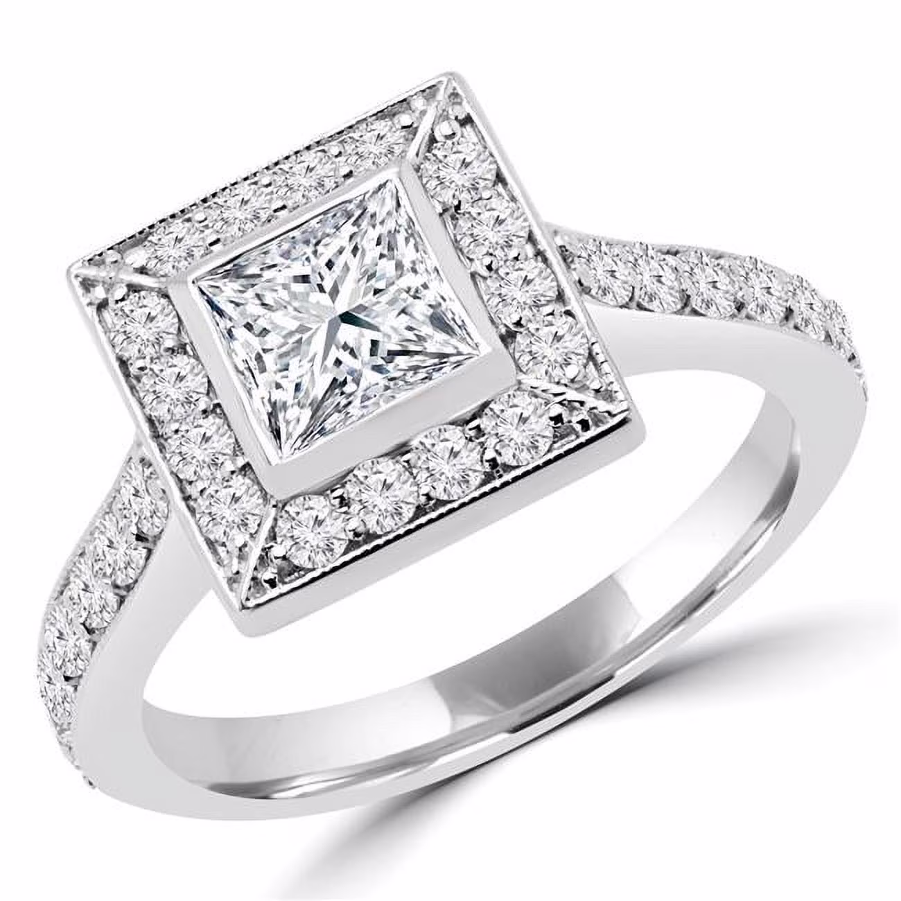 1.25 CTW Princess Diamond Vintage Bezel Set Halo Engagement Ring in 14K White Gold - Size 3.75