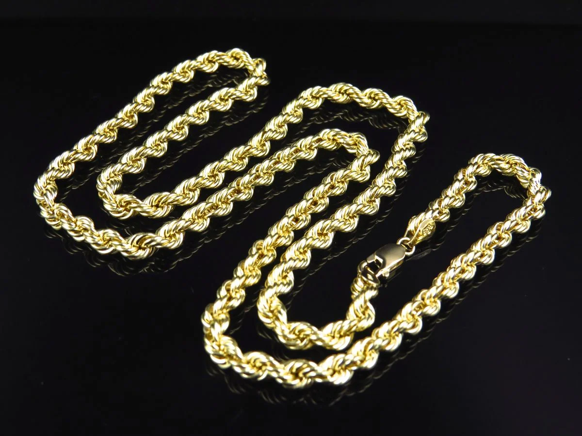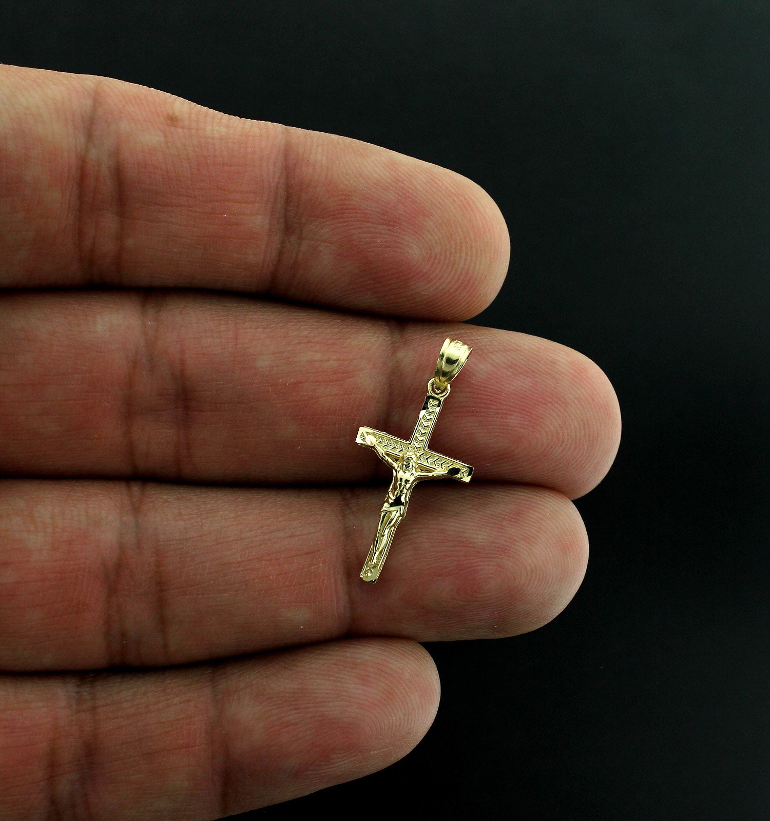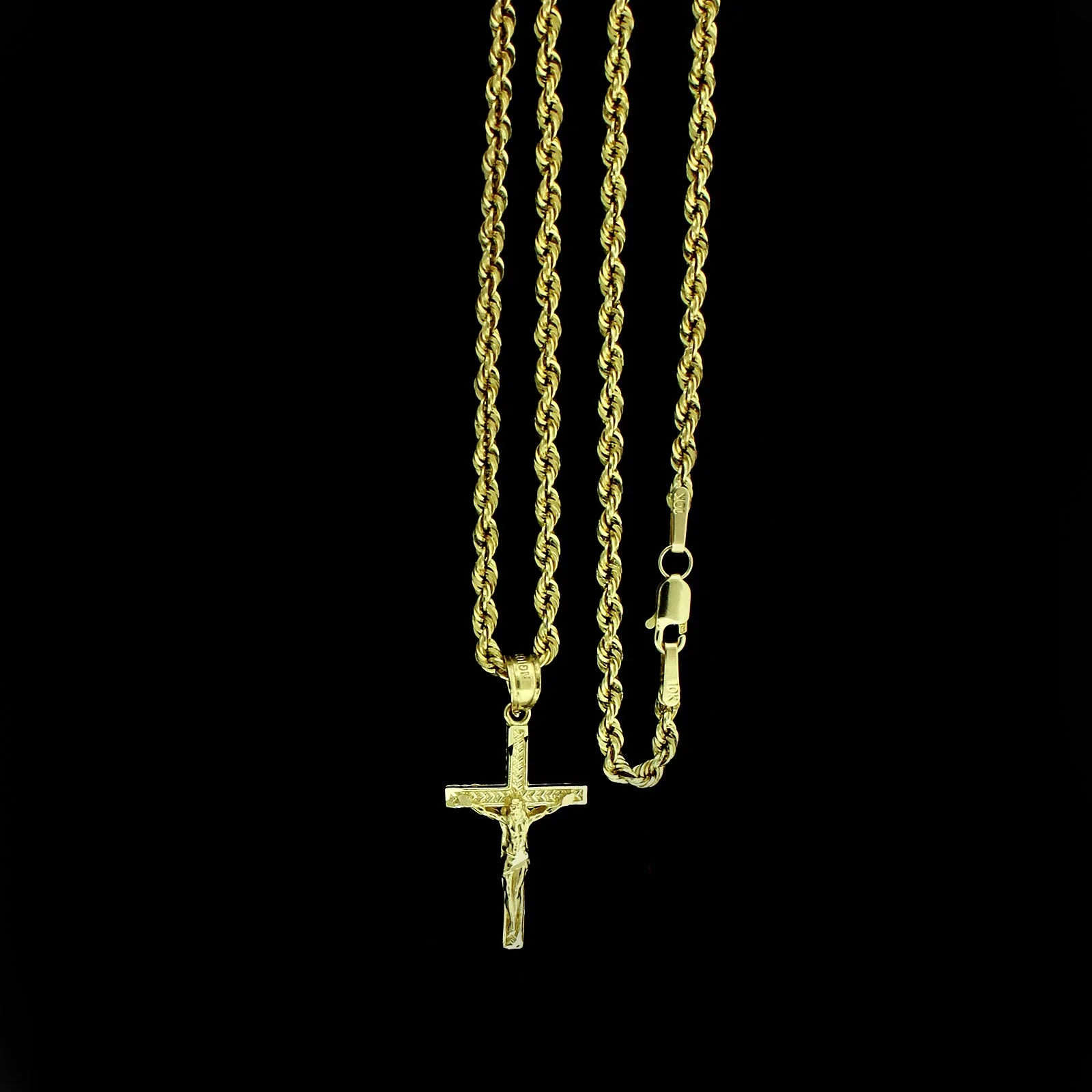 Real 10K Yellow Gold Jesus Cross Charm Pendant Diamond Cut & 2mm Rope Chain