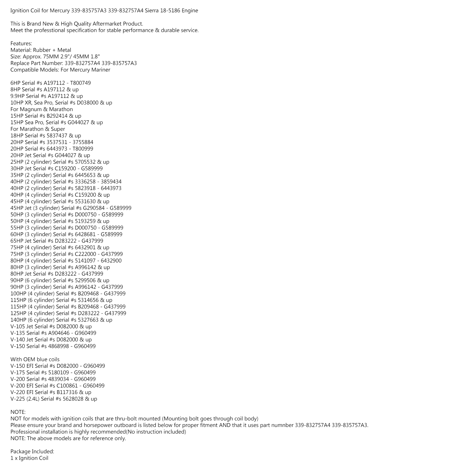 Motor Genic Outboard Engine Ignition Coil for Mercury 6-225HP OEM 339-835757A3 339-832757A4