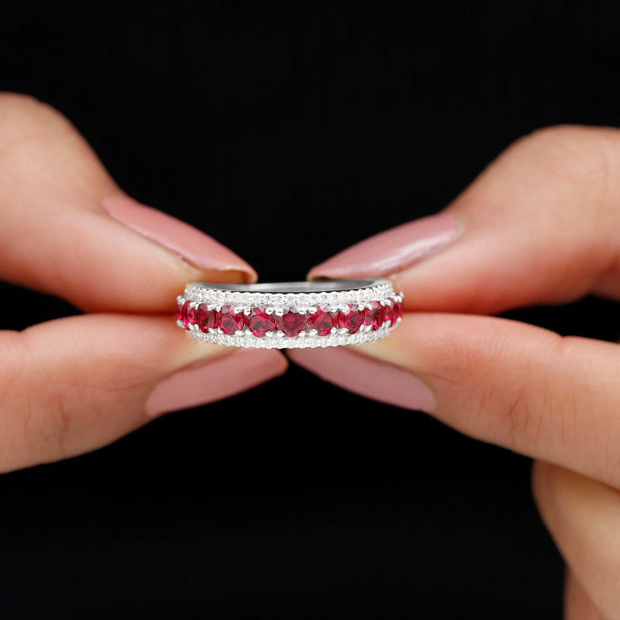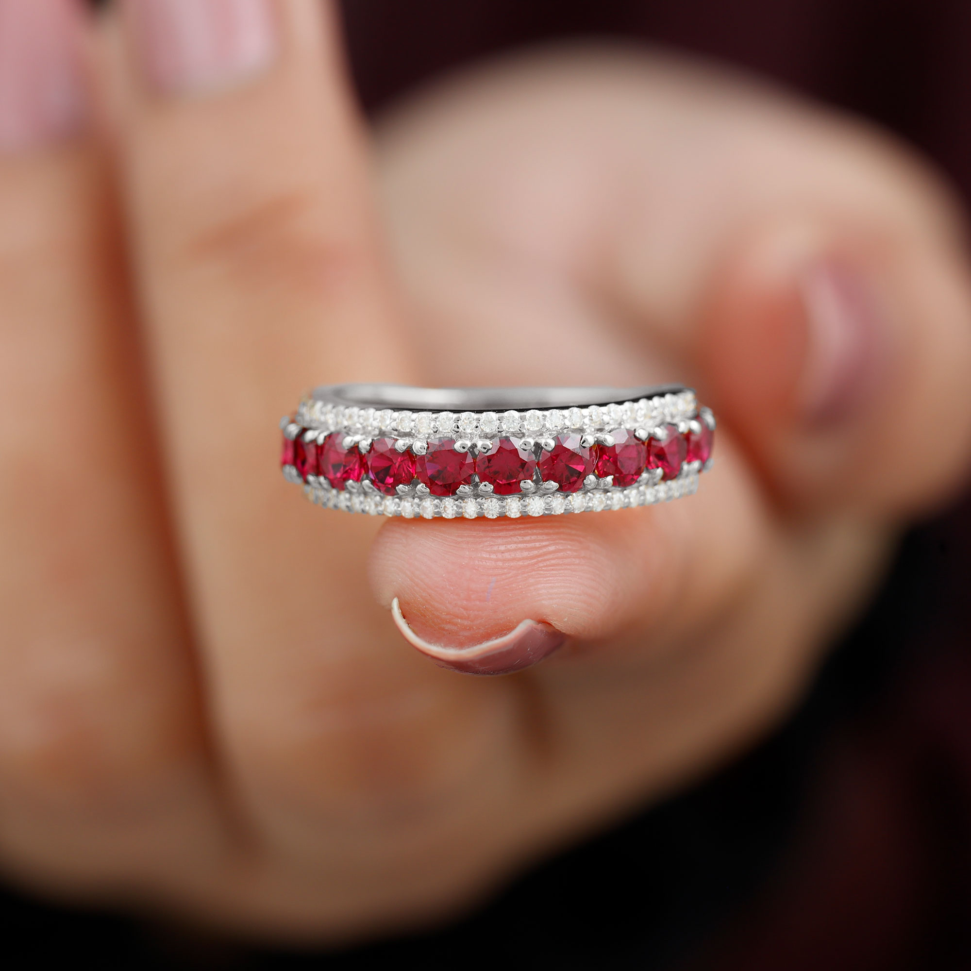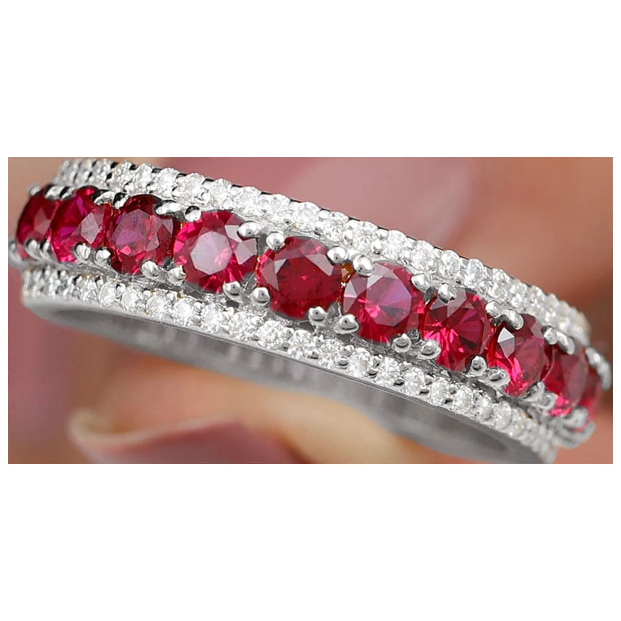 2 CT Lab Created Ruby Anniversary Ring with Diamond Accent, 14K White Gold, US 12.00
