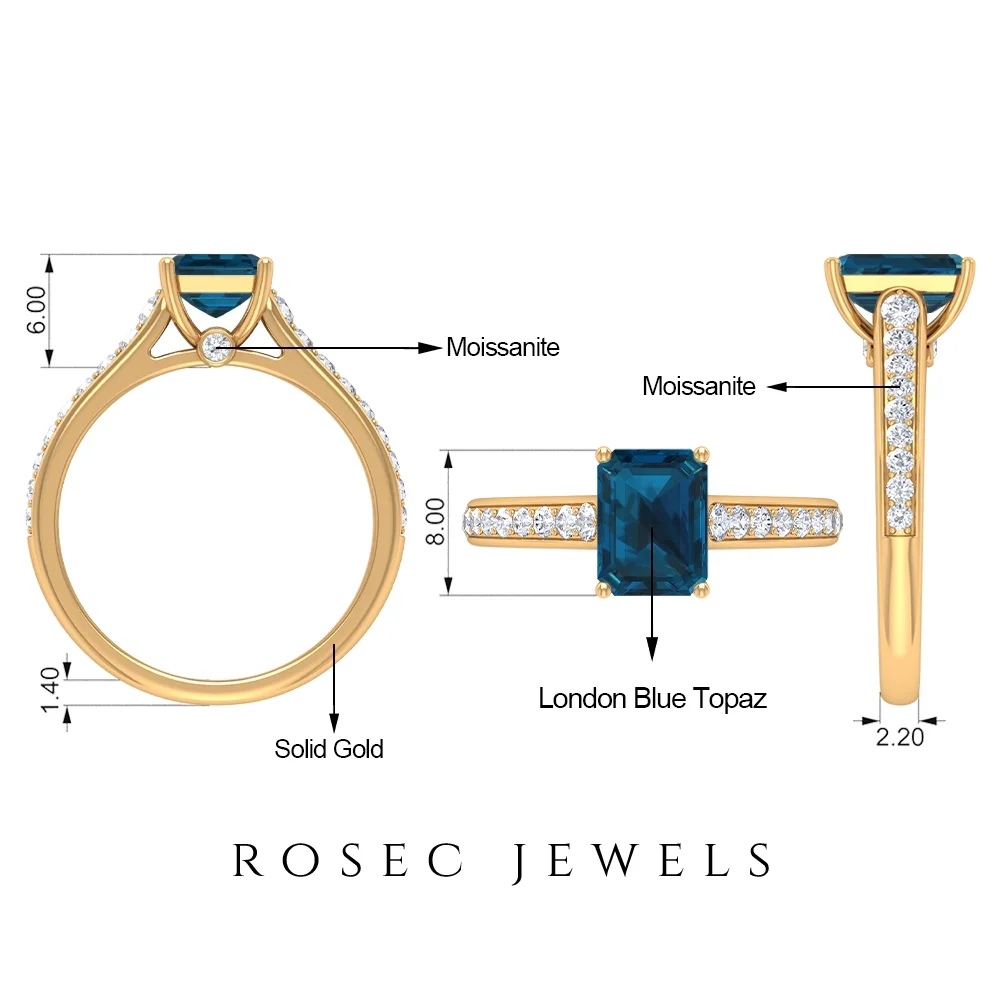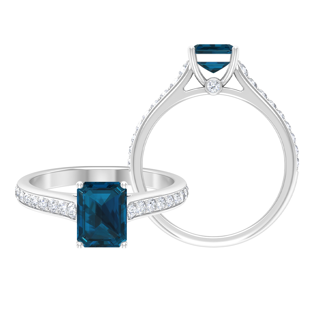 2 CT Octagon Cut London Blue Topaz Solitaire Ring with Diamond Side Stones, 14K White Gold, US 9.00