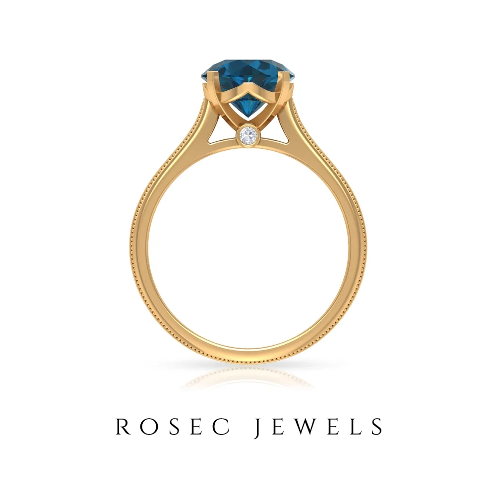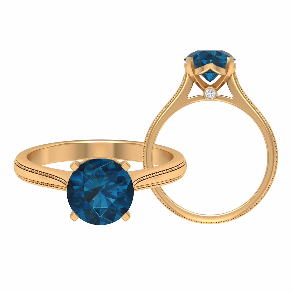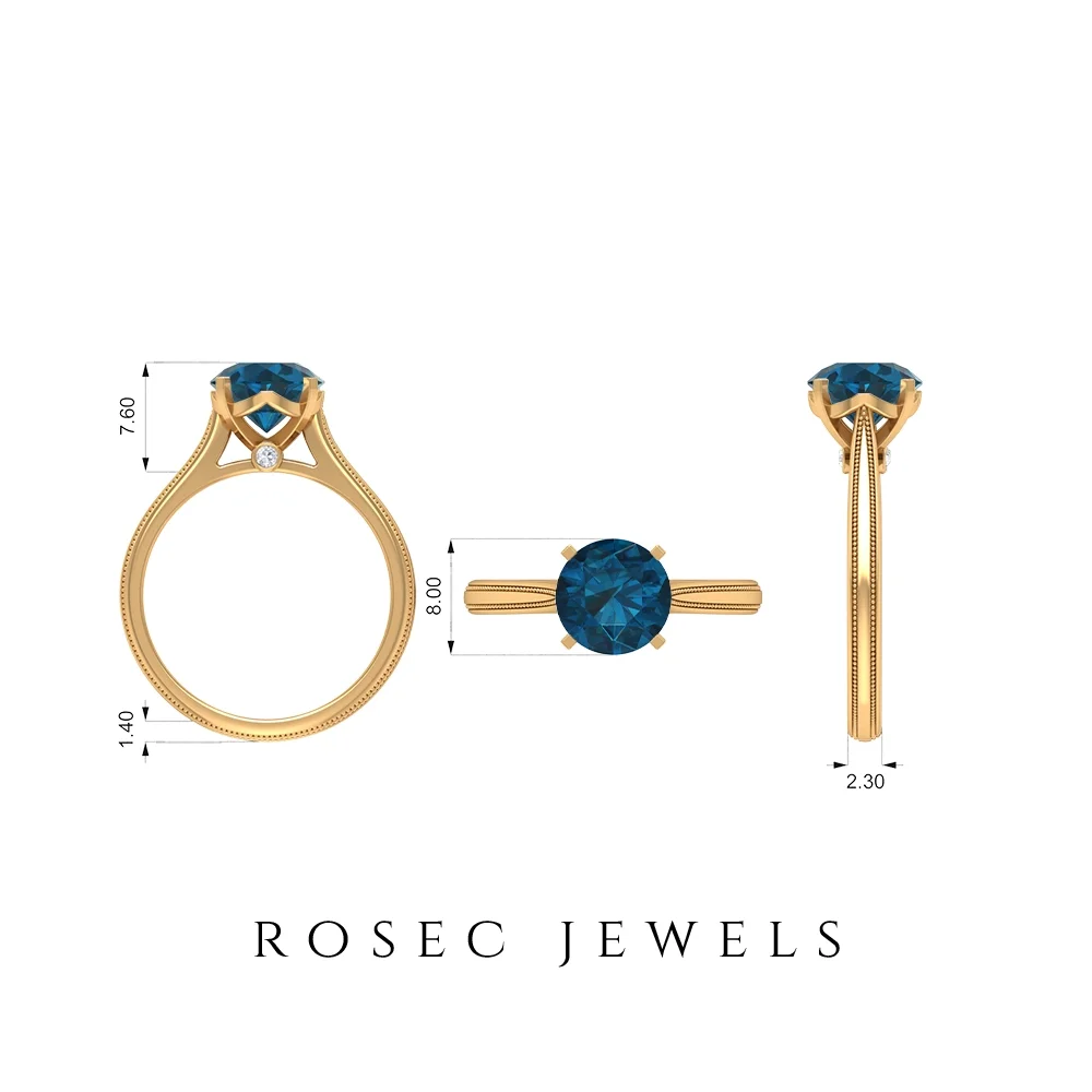 Solitaire London Blue Topaz Ring with Surprise Diamond for Women - 8 mm - 2 CT, 14K Yellow Gold, US 4.00