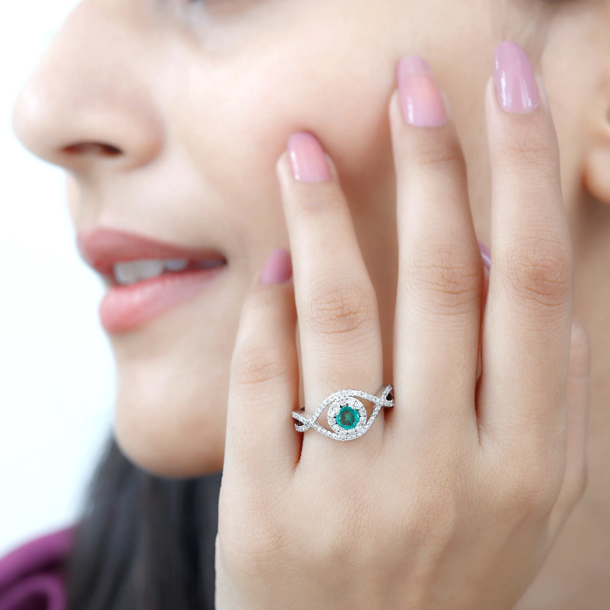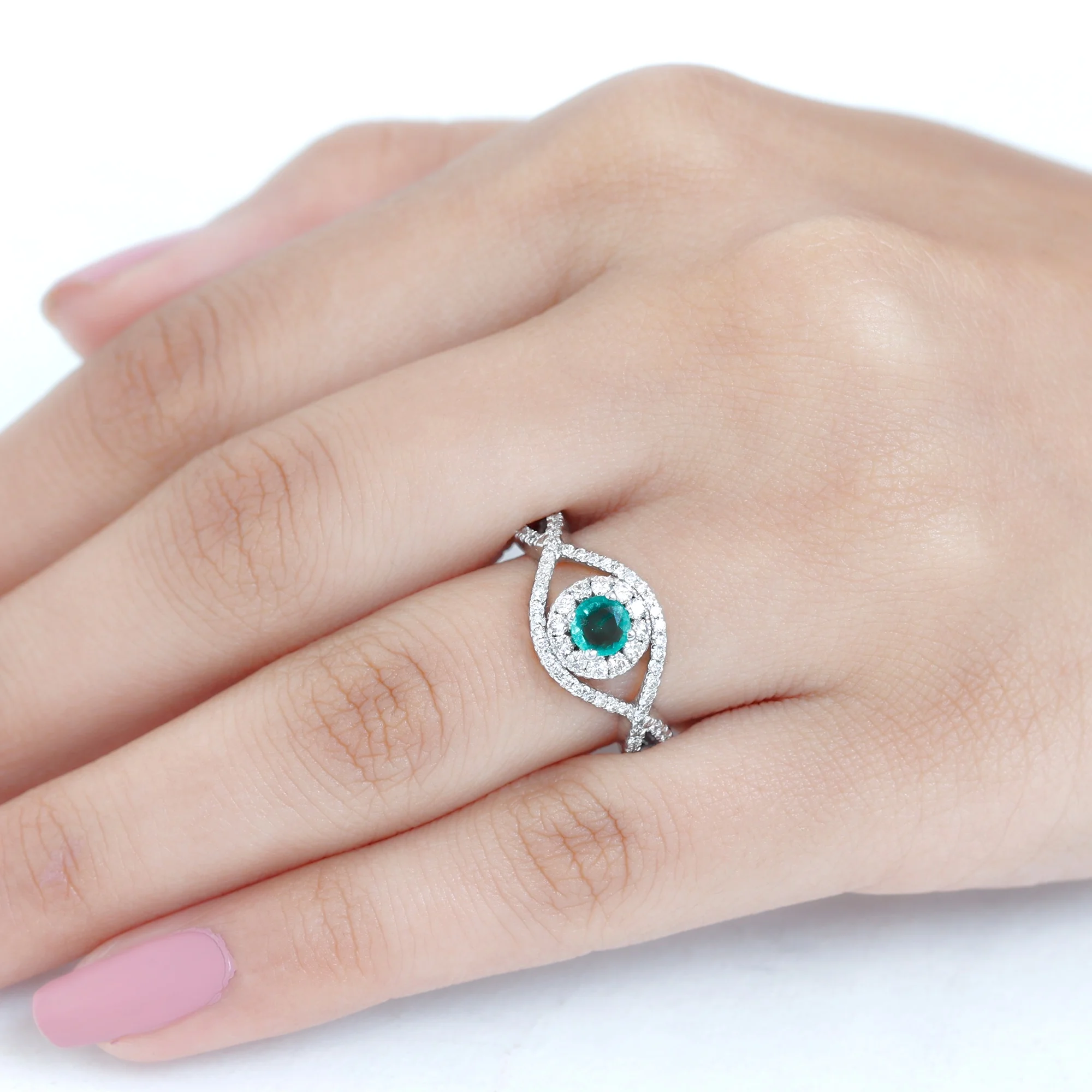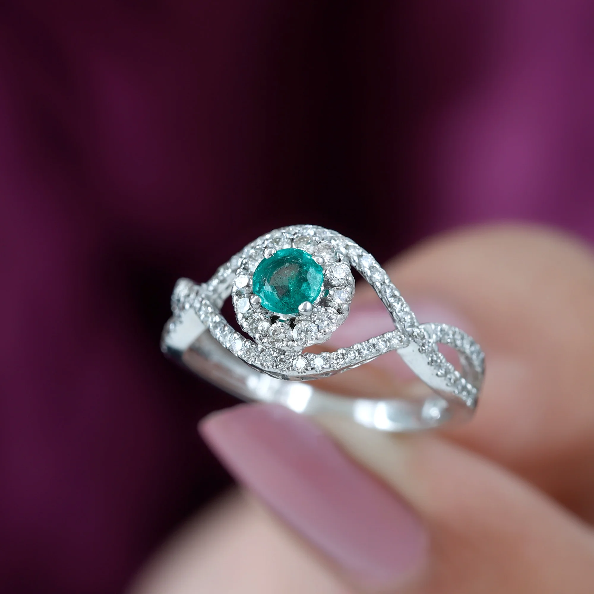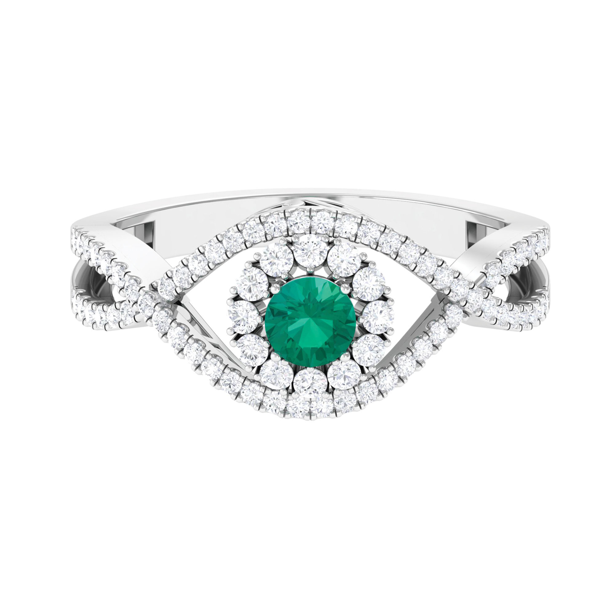 Emerald Infinity Ring with Diamond for Women, Crossover Ring - 1 CT, 18K White Gold, US 12.50