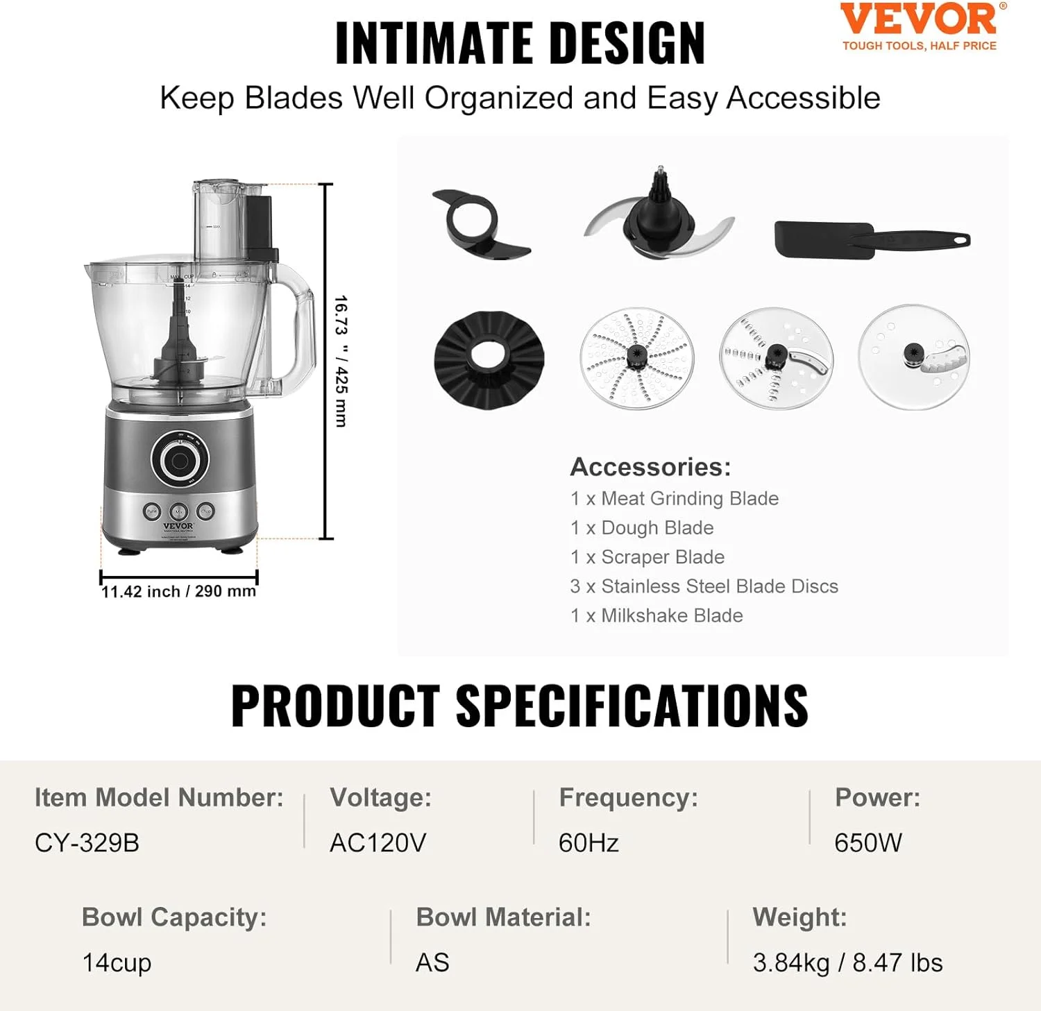 Vevor 650W 14-Cup Vegetable Chopper 2-Speed Stainless Steel Blade Electric Food Processor, Gray