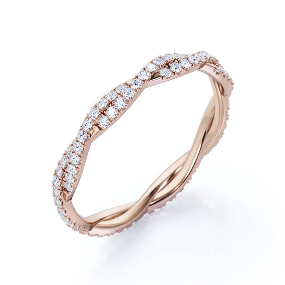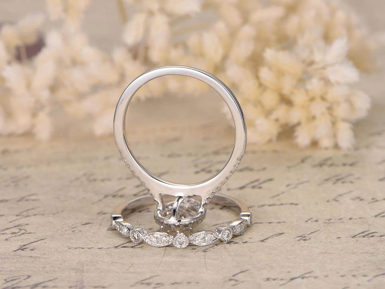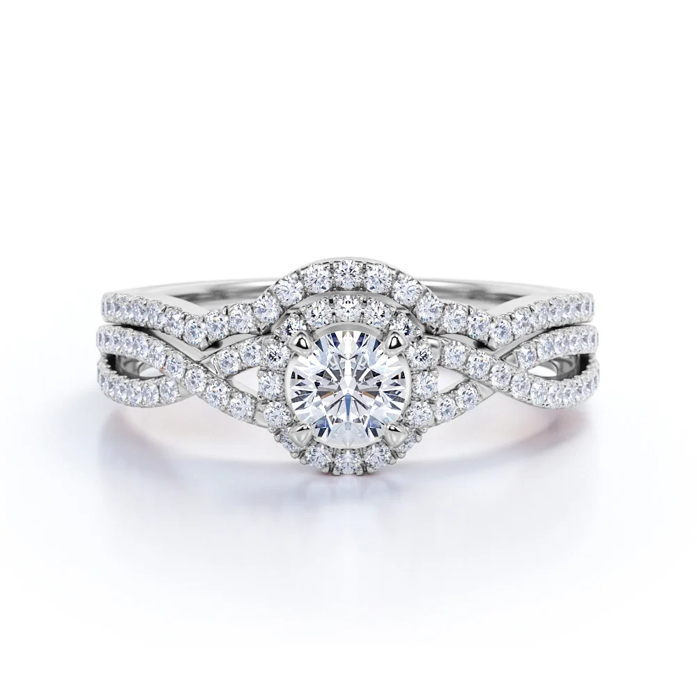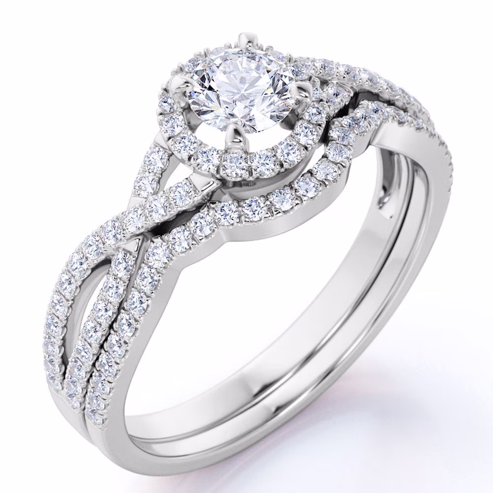 JeenMata Crossover Split Shank Round Cut Real Diamond Halo Wedding Ring Set in 10k White Gold