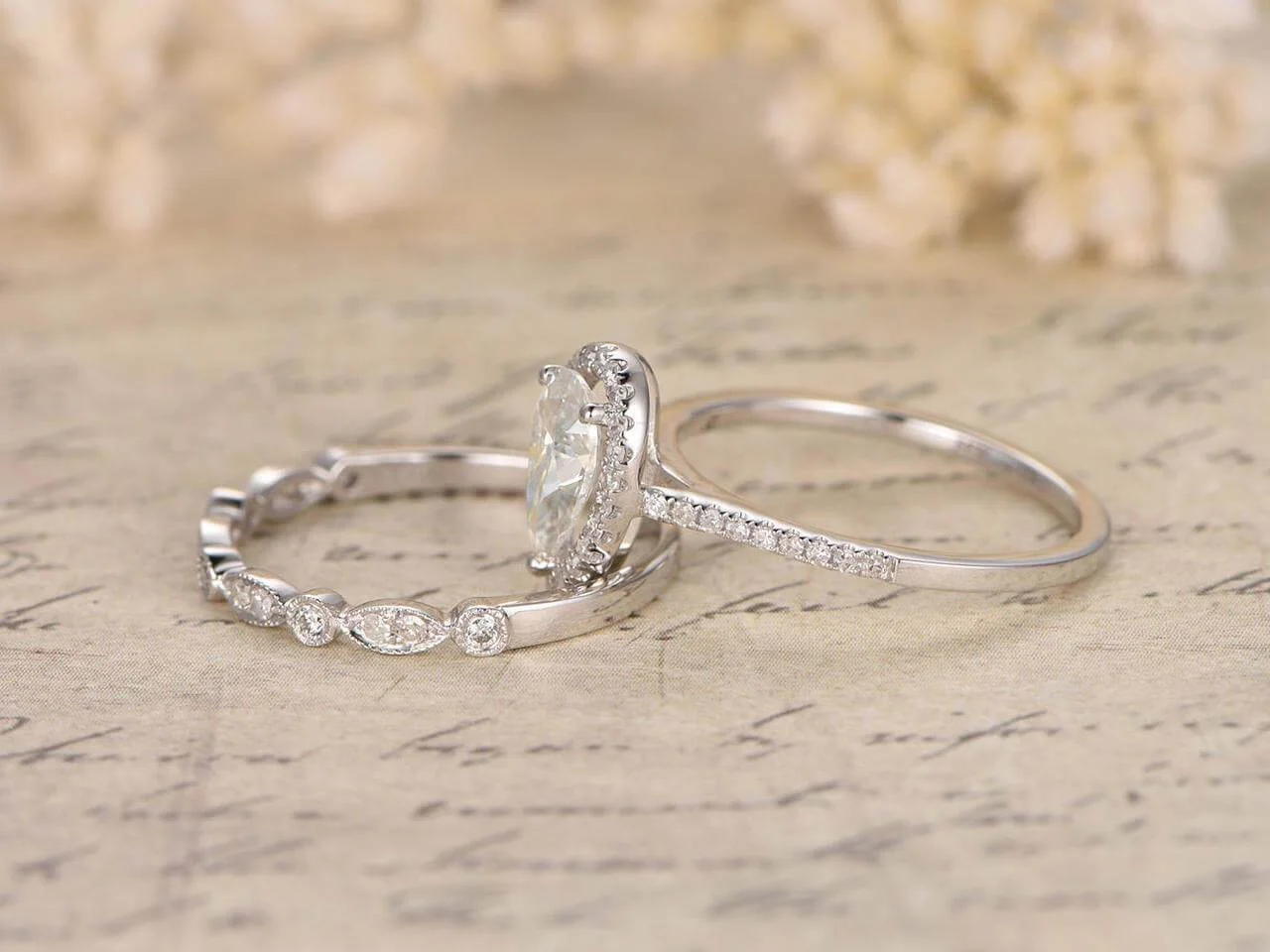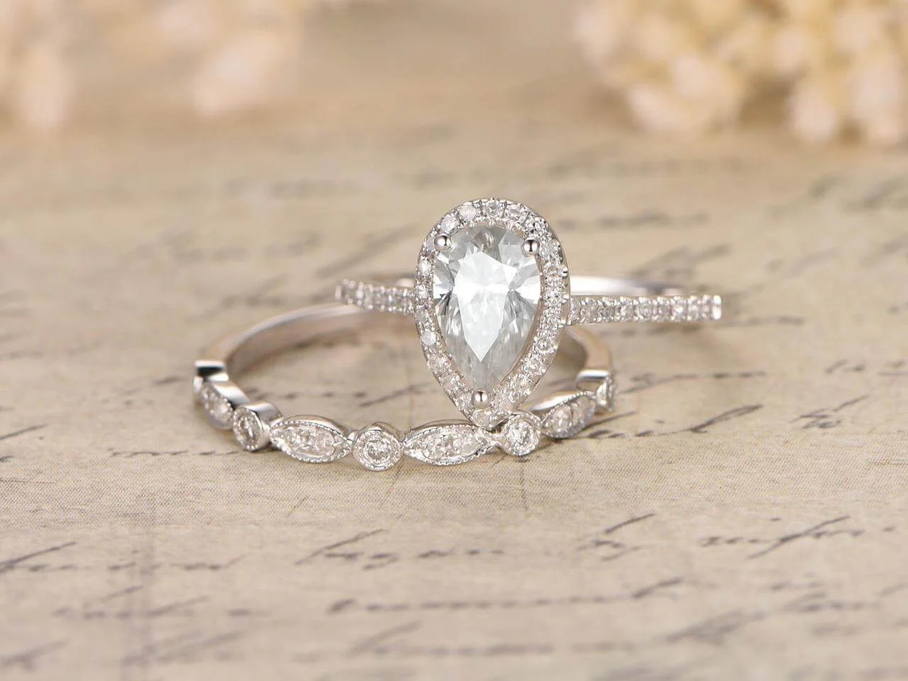 Superb 2.25 Carat Pear cut Moissanite Diamond Wedding Ring Set with 18k Gold Plating