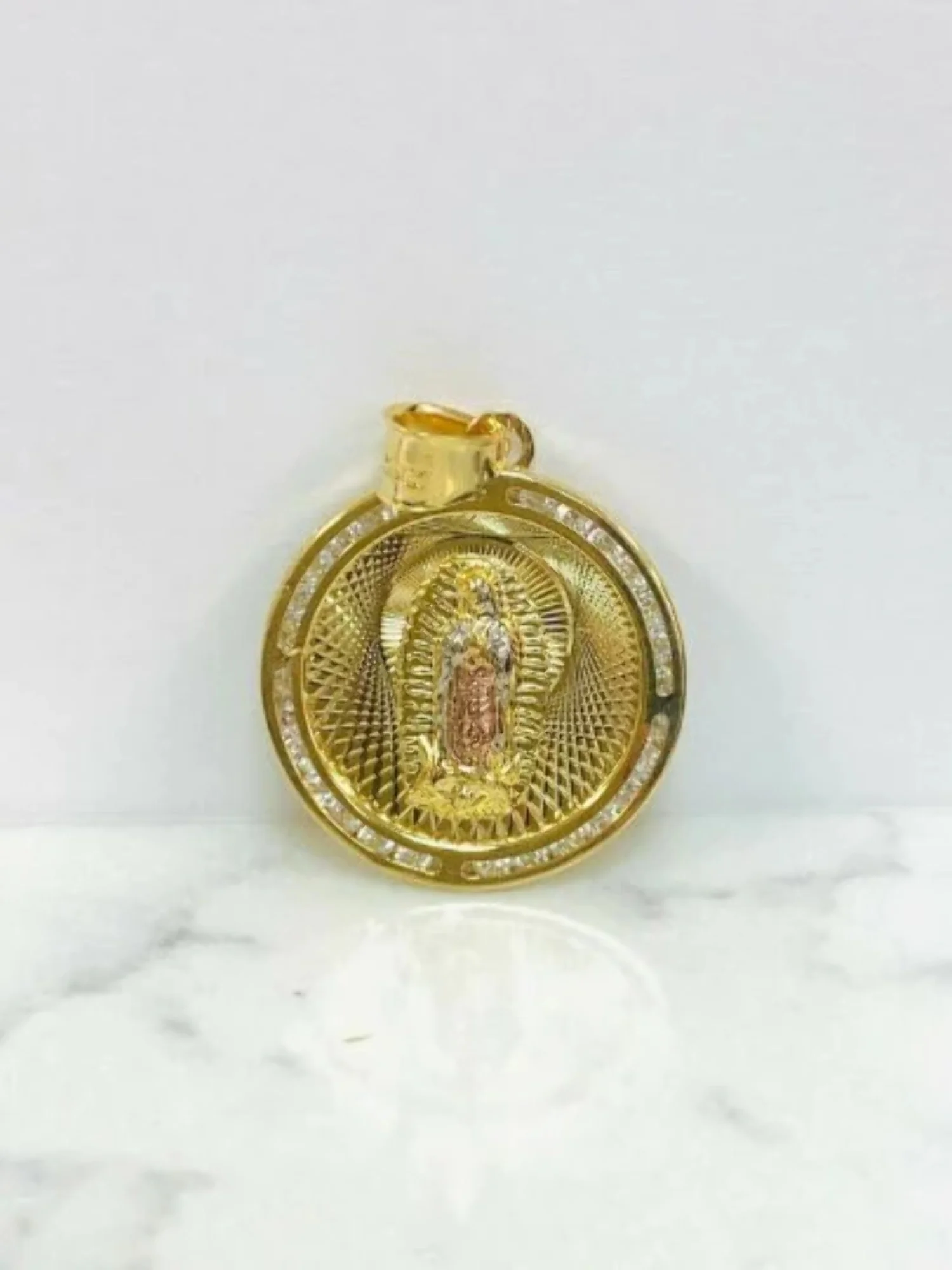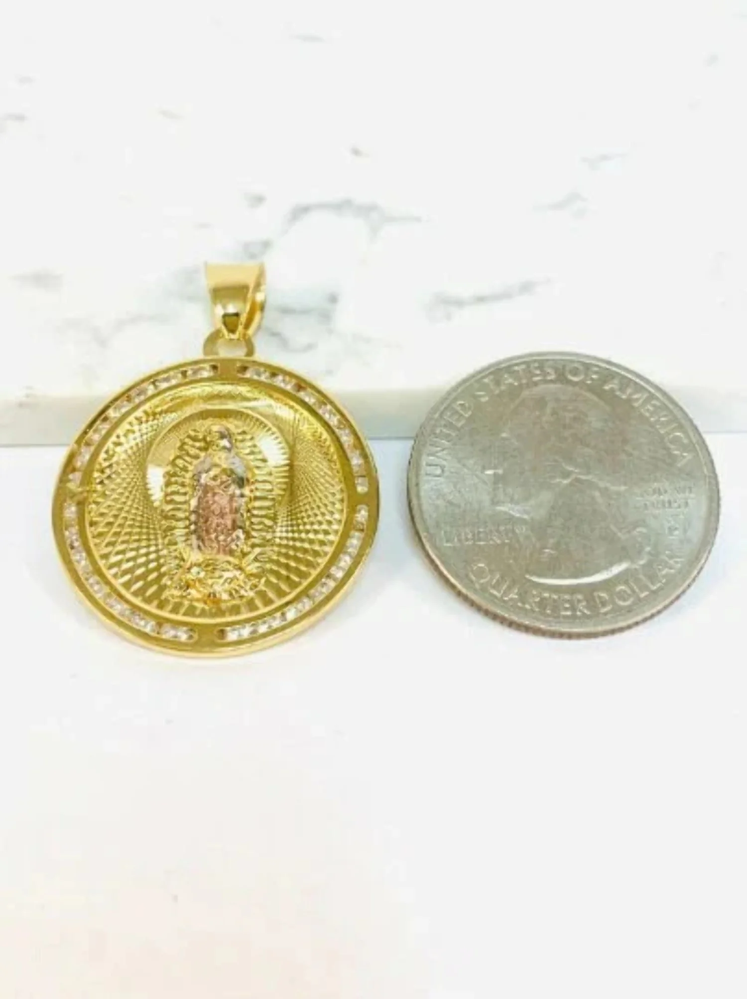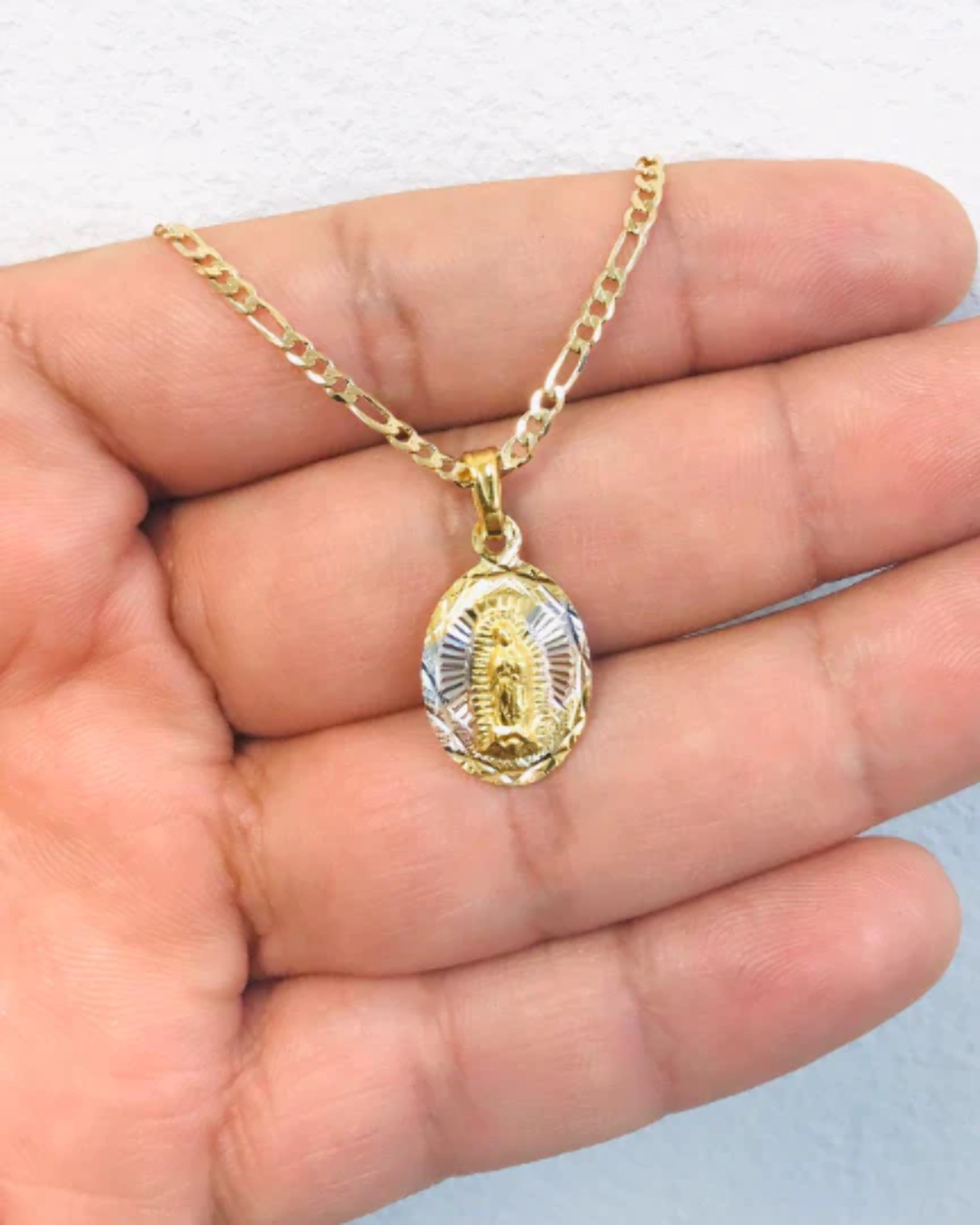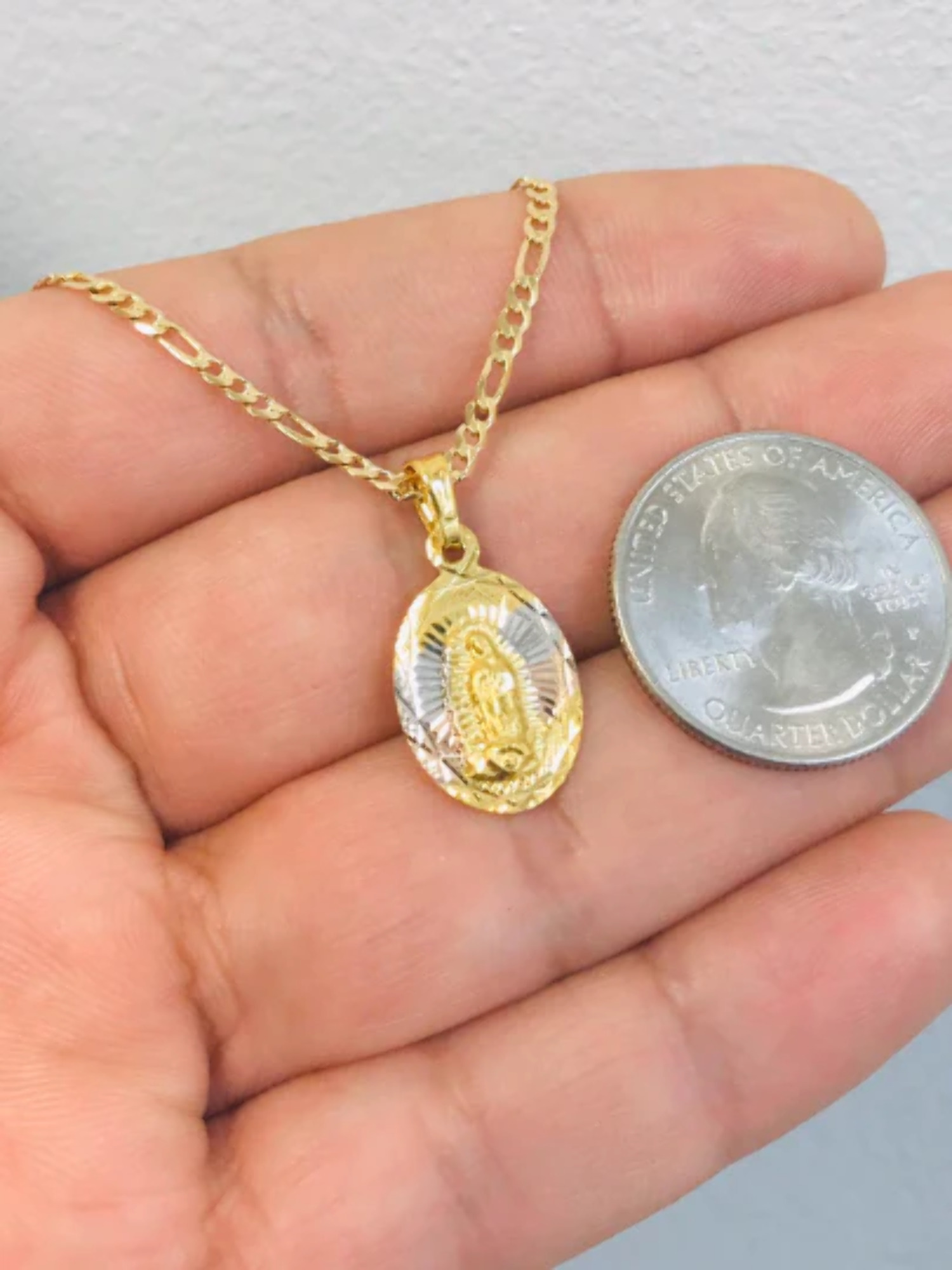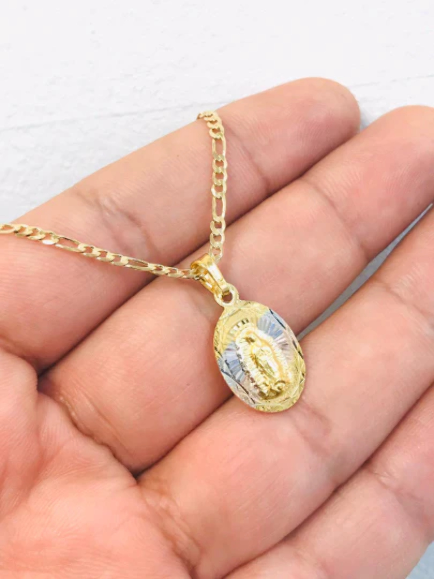 14K Gold Filled Tri Color Virgen de Guadalupe Necklace 28x25 Figaro Chain for Womens
