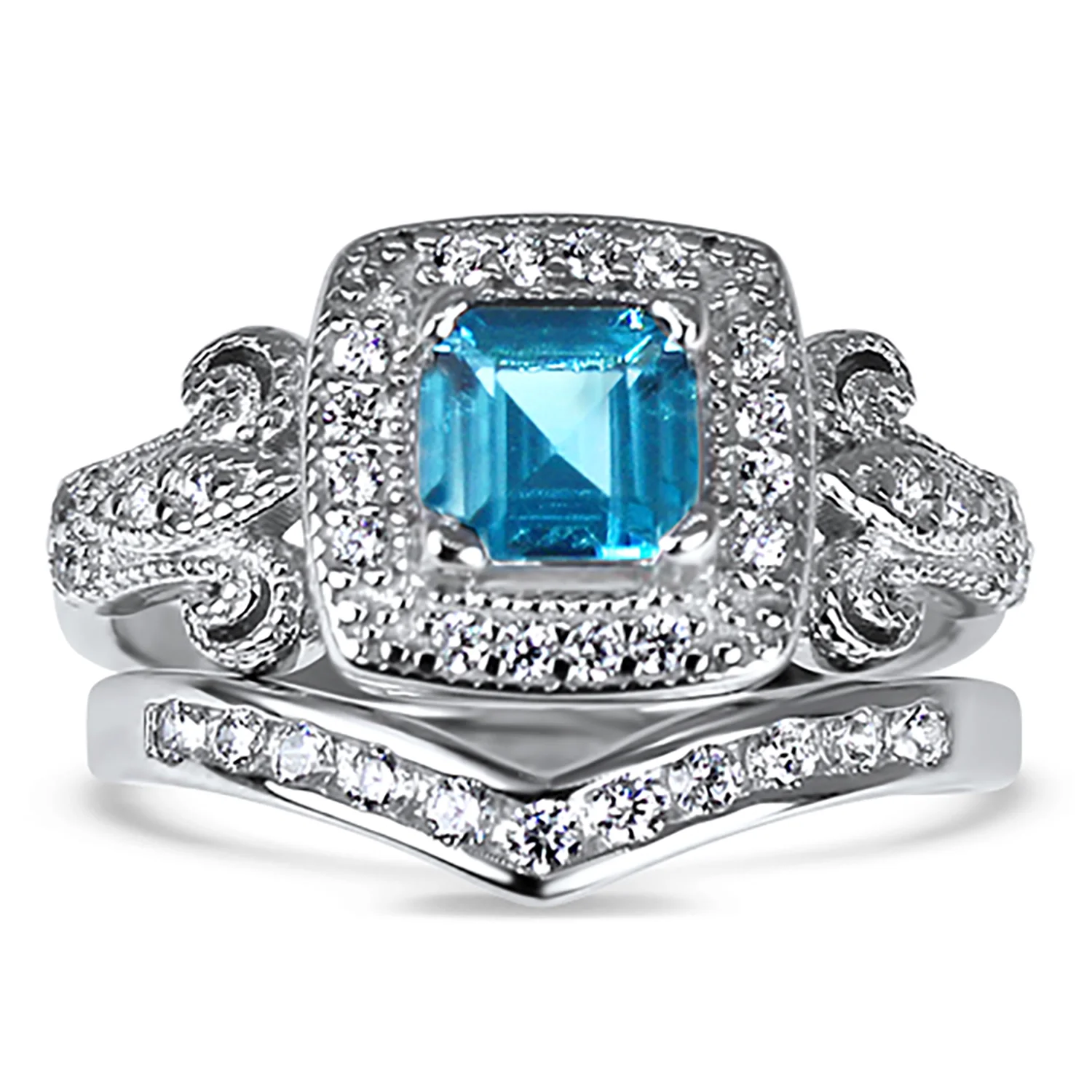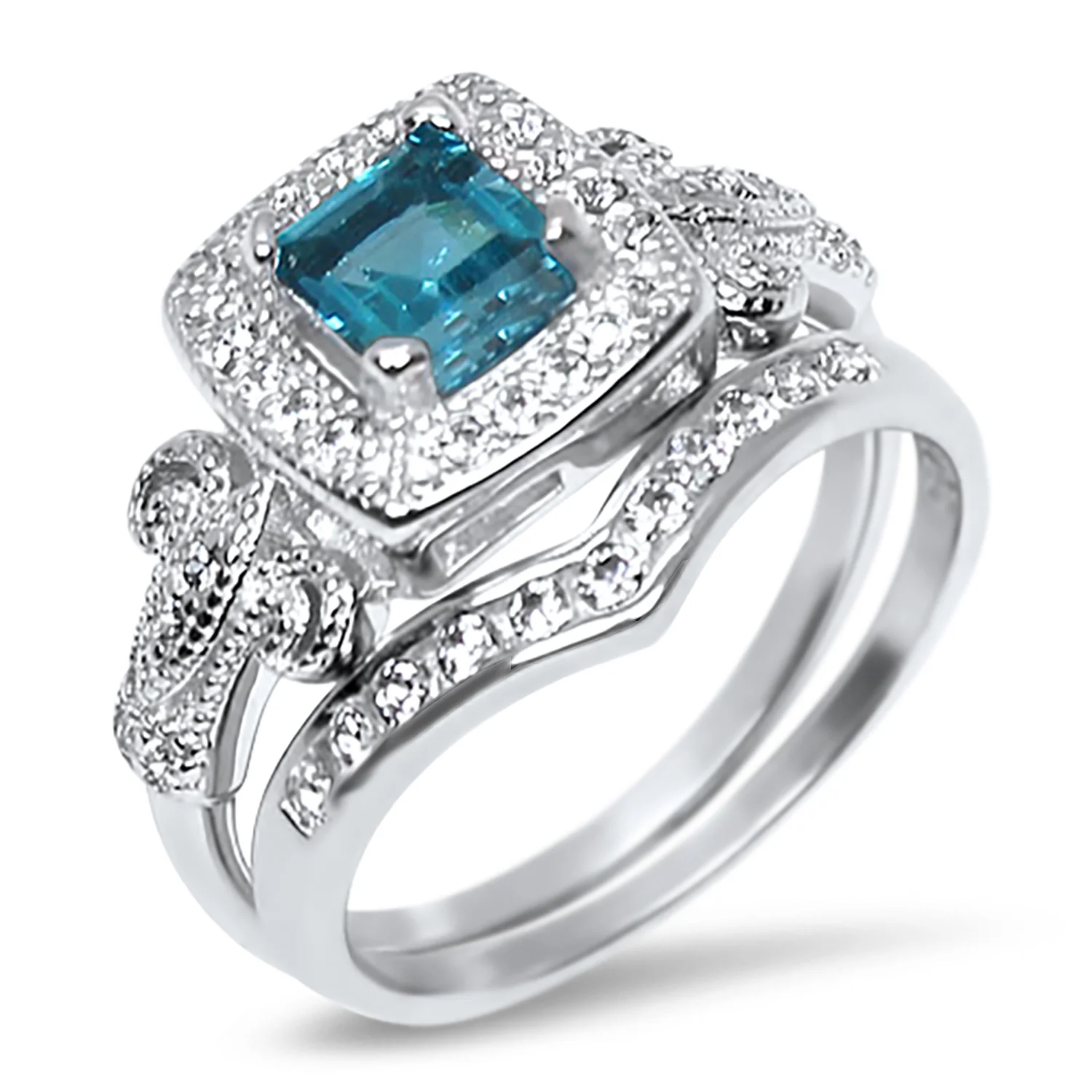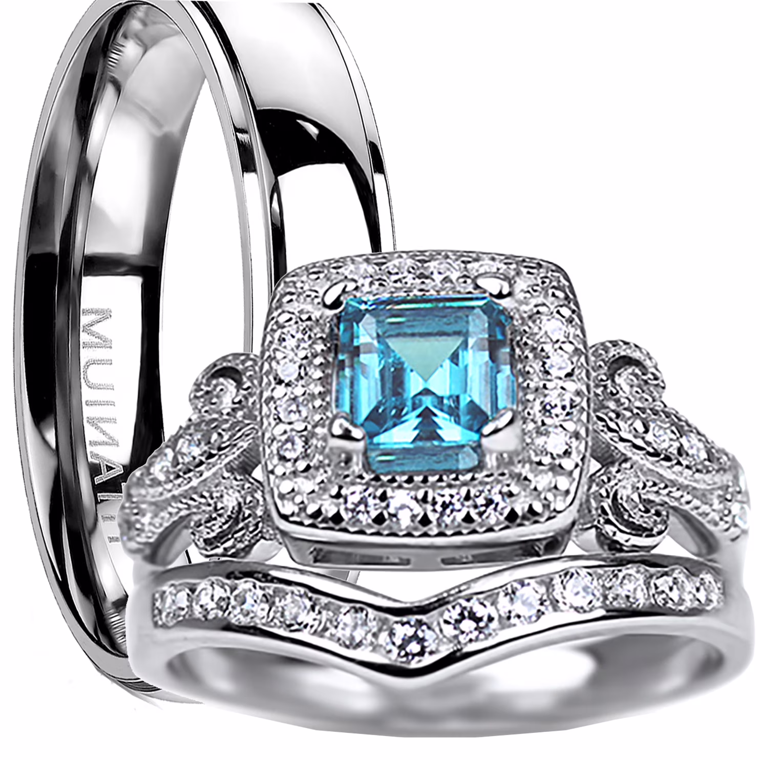 LaRaso & Co Trio His Hers Blue Topaz CZ Silver Wedding Engagement Ring Set for Her Titanium for Him