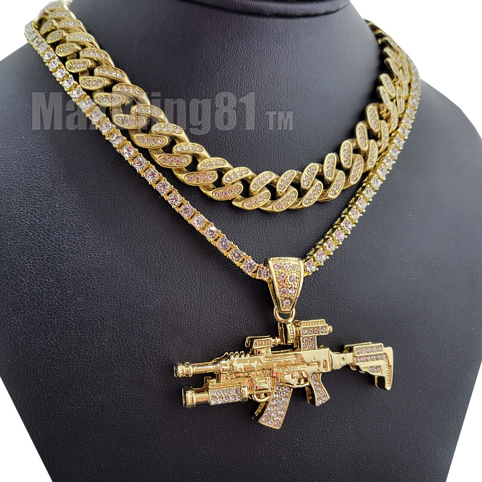 Hip Hop Machine Gun pendant 18" Iced Cubic Zirconia Cuban 20" 1 Row Tennis Chain