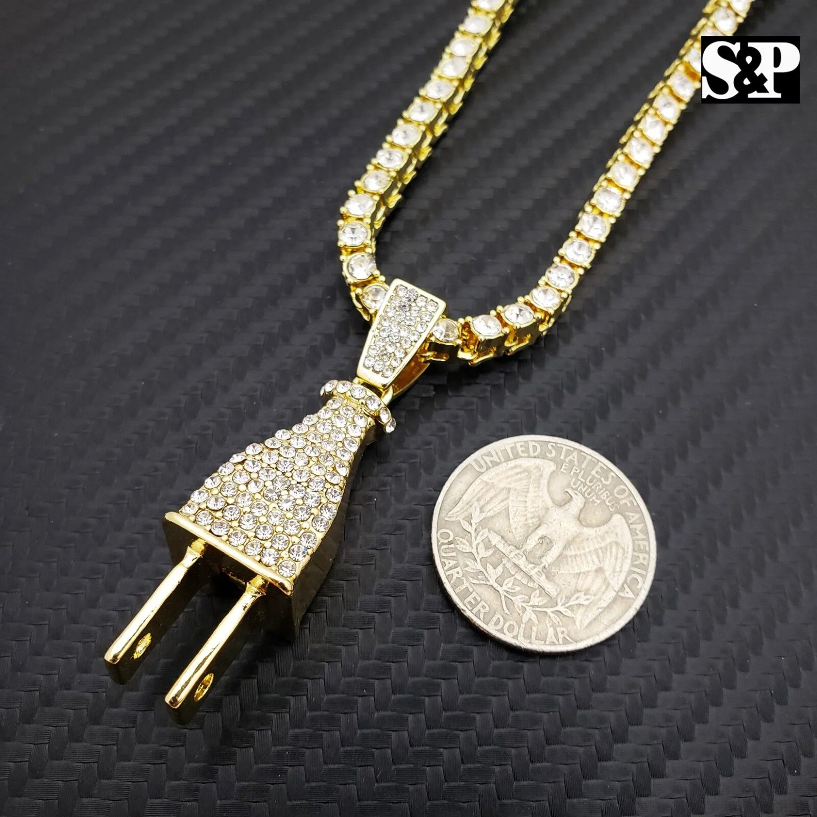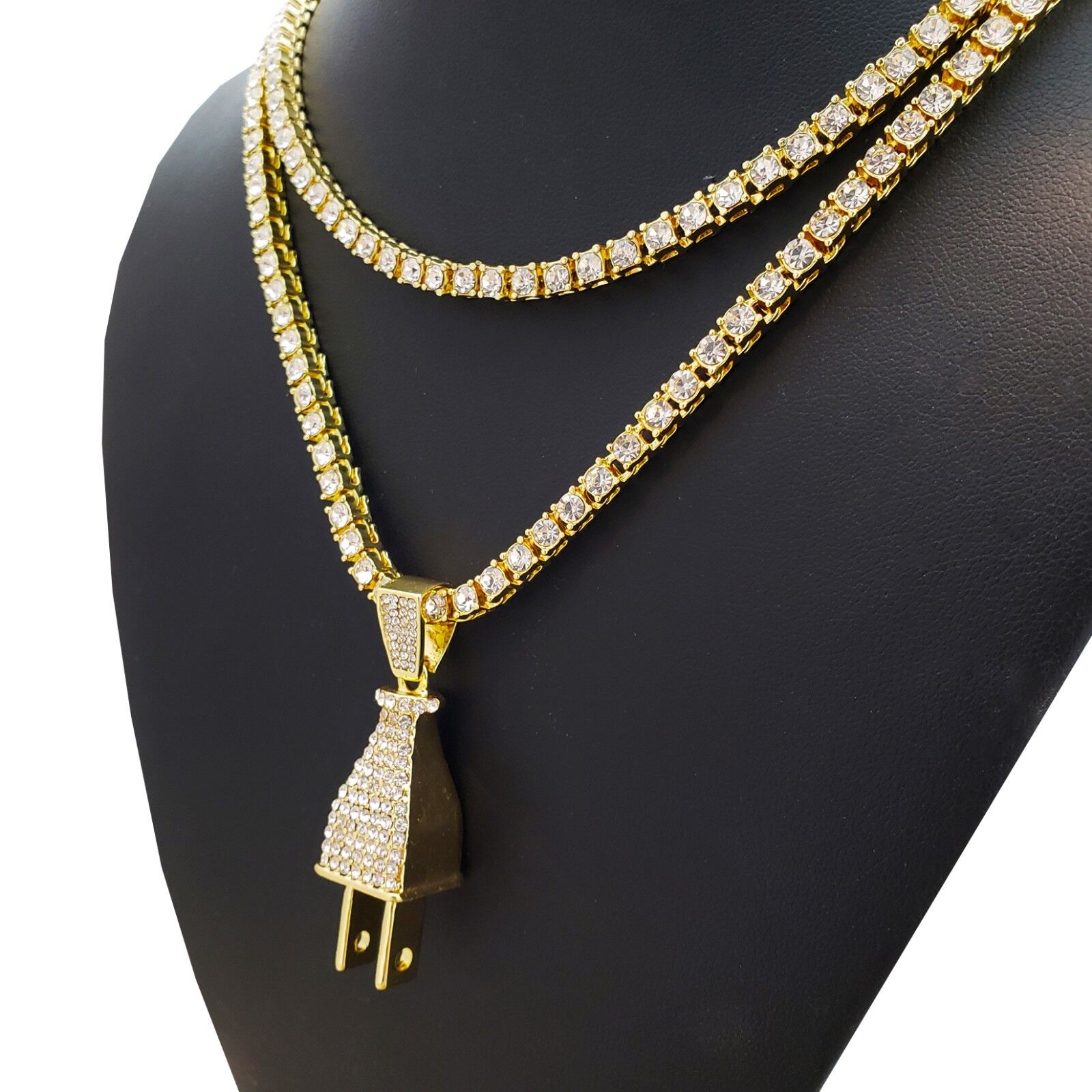 Hip Hop Iced Power Plug Pendant & 1 Row CZ Tennis 18" 24" Chain Fashion Necklace