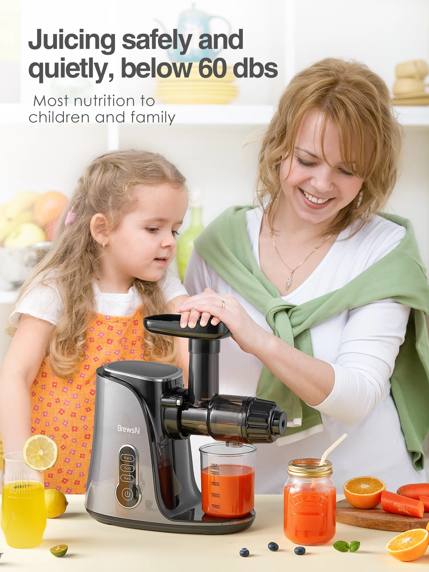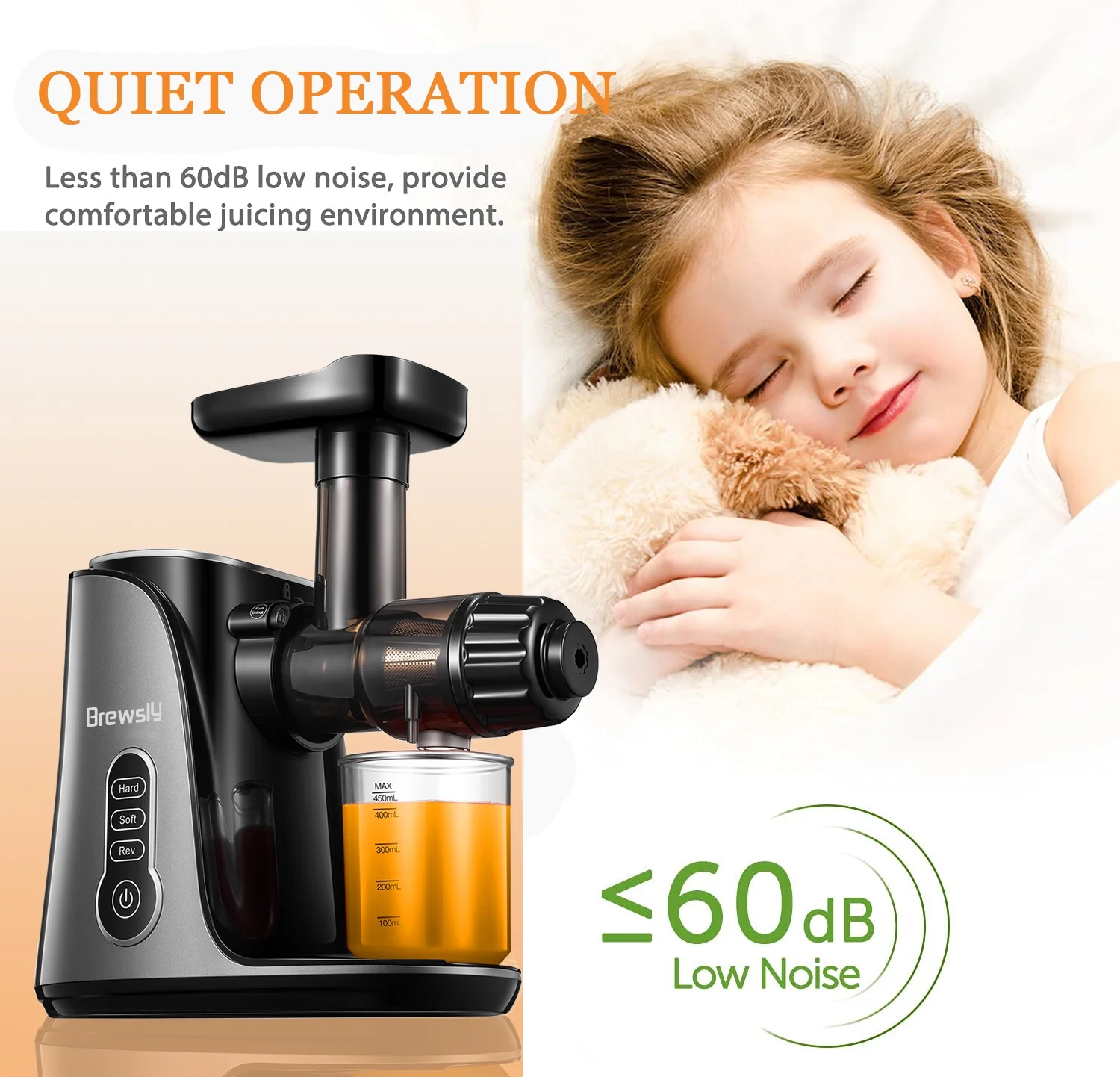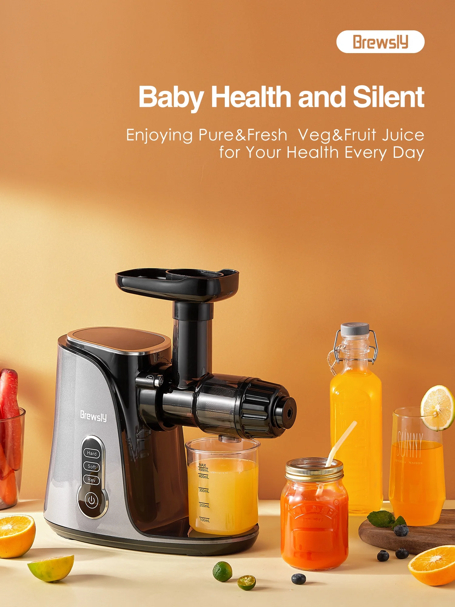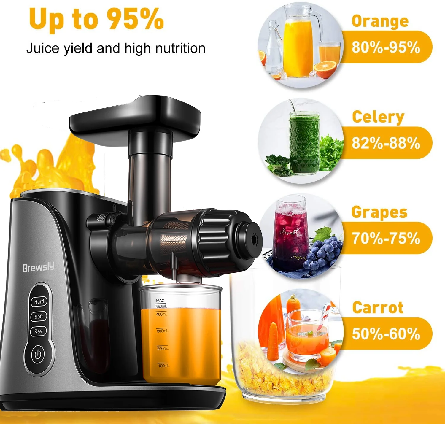 Brewsly Juicer Machines Easy to Clean, Slow Masticating Juicer Higher Juice Yield, Black