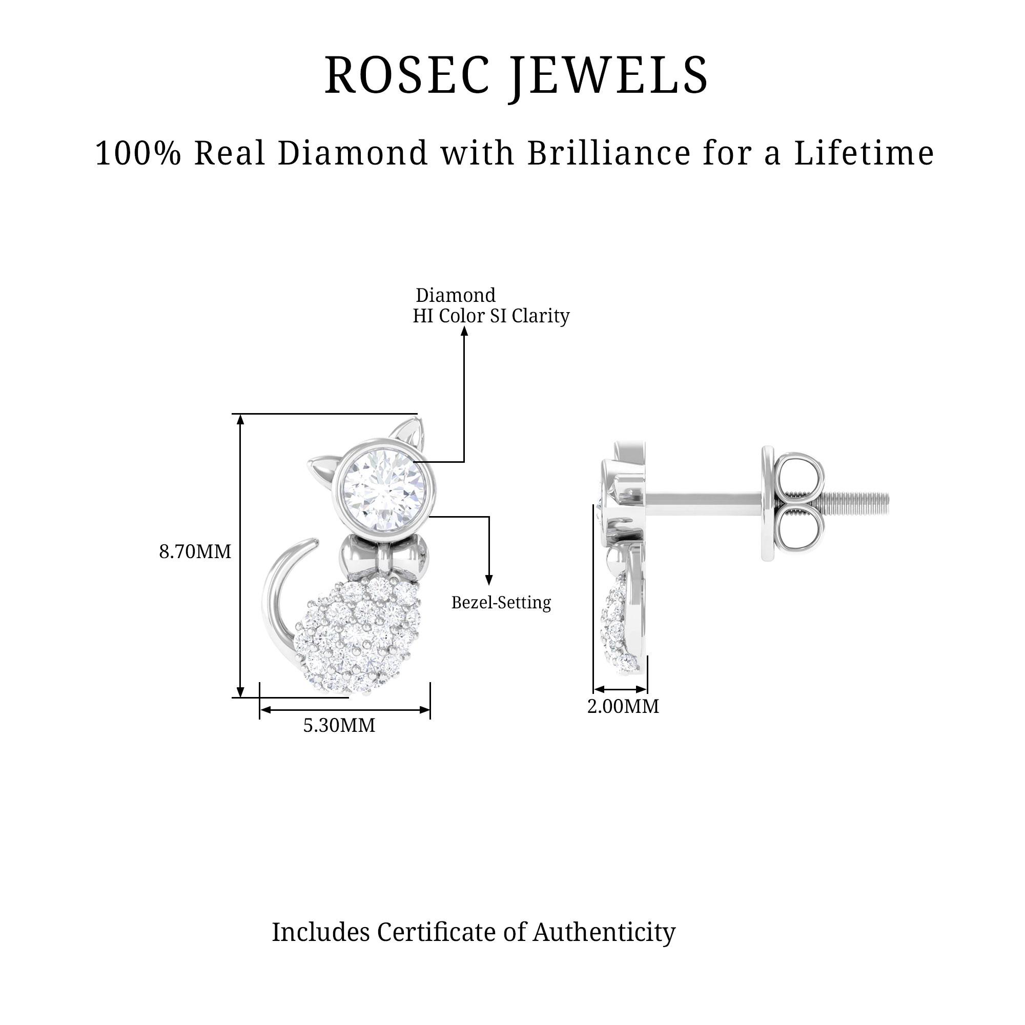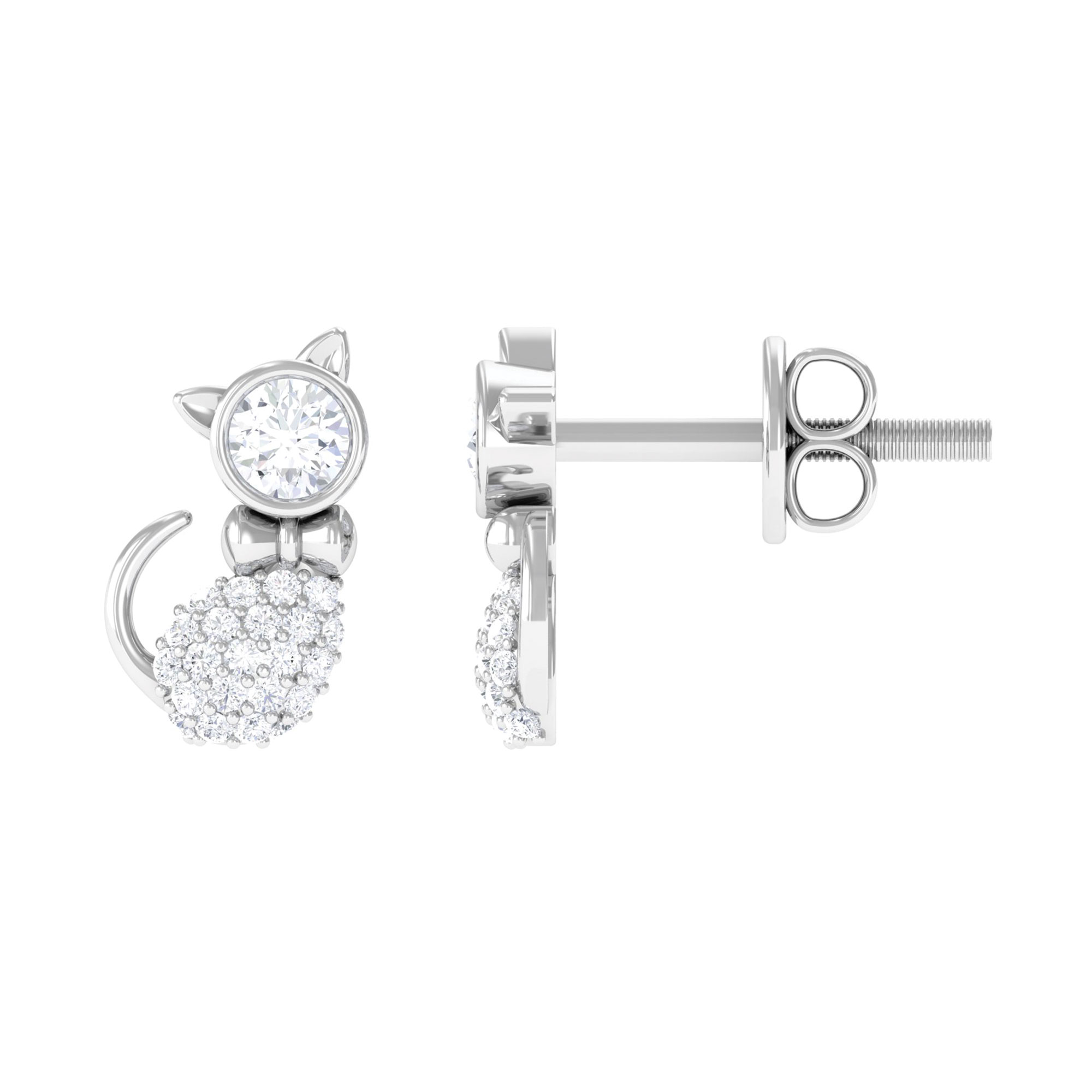 Cute Cat Stud Earrings - Certified Diamond Earrings for Women - HI-SI Grade, 18K White Gold